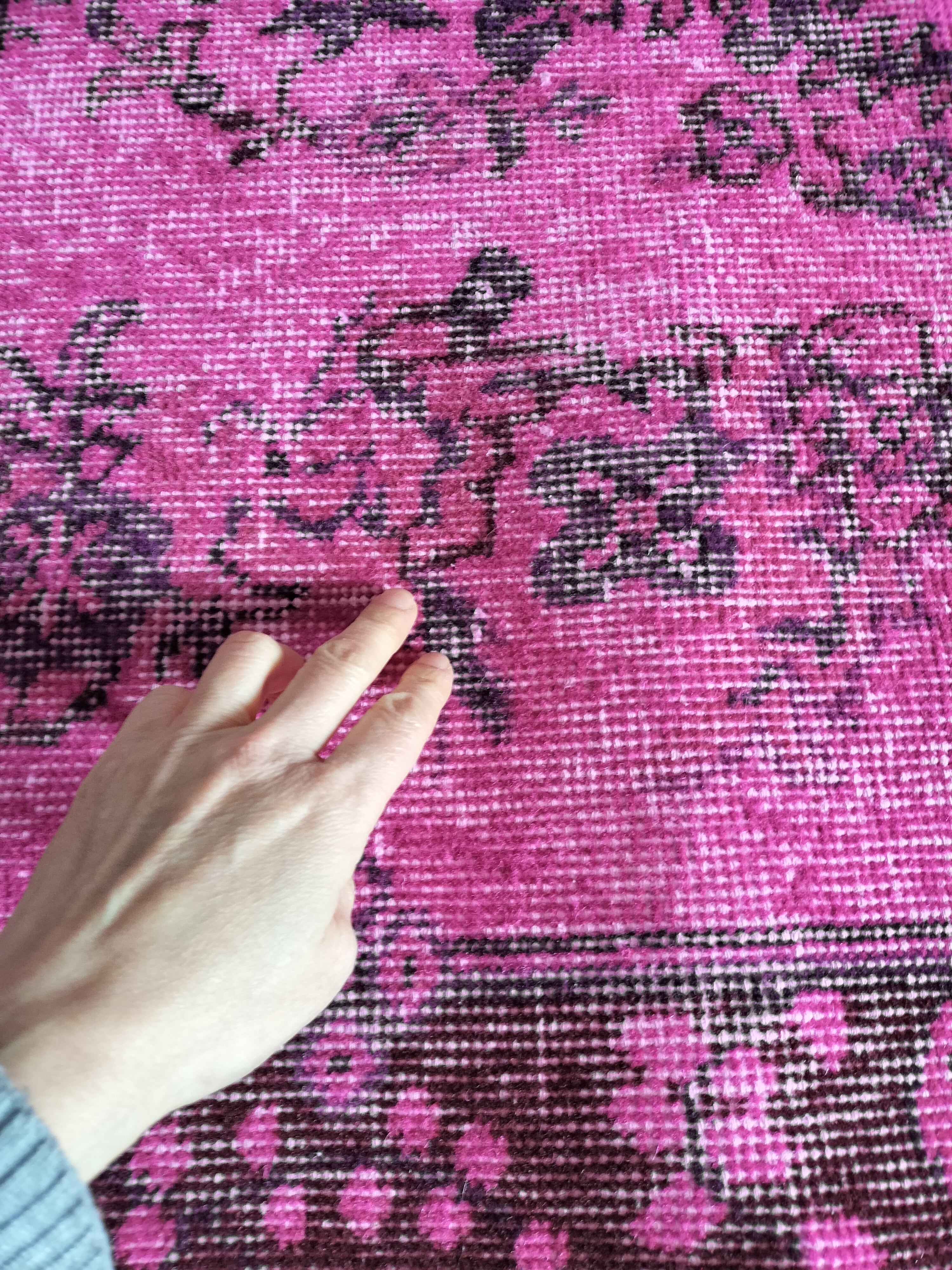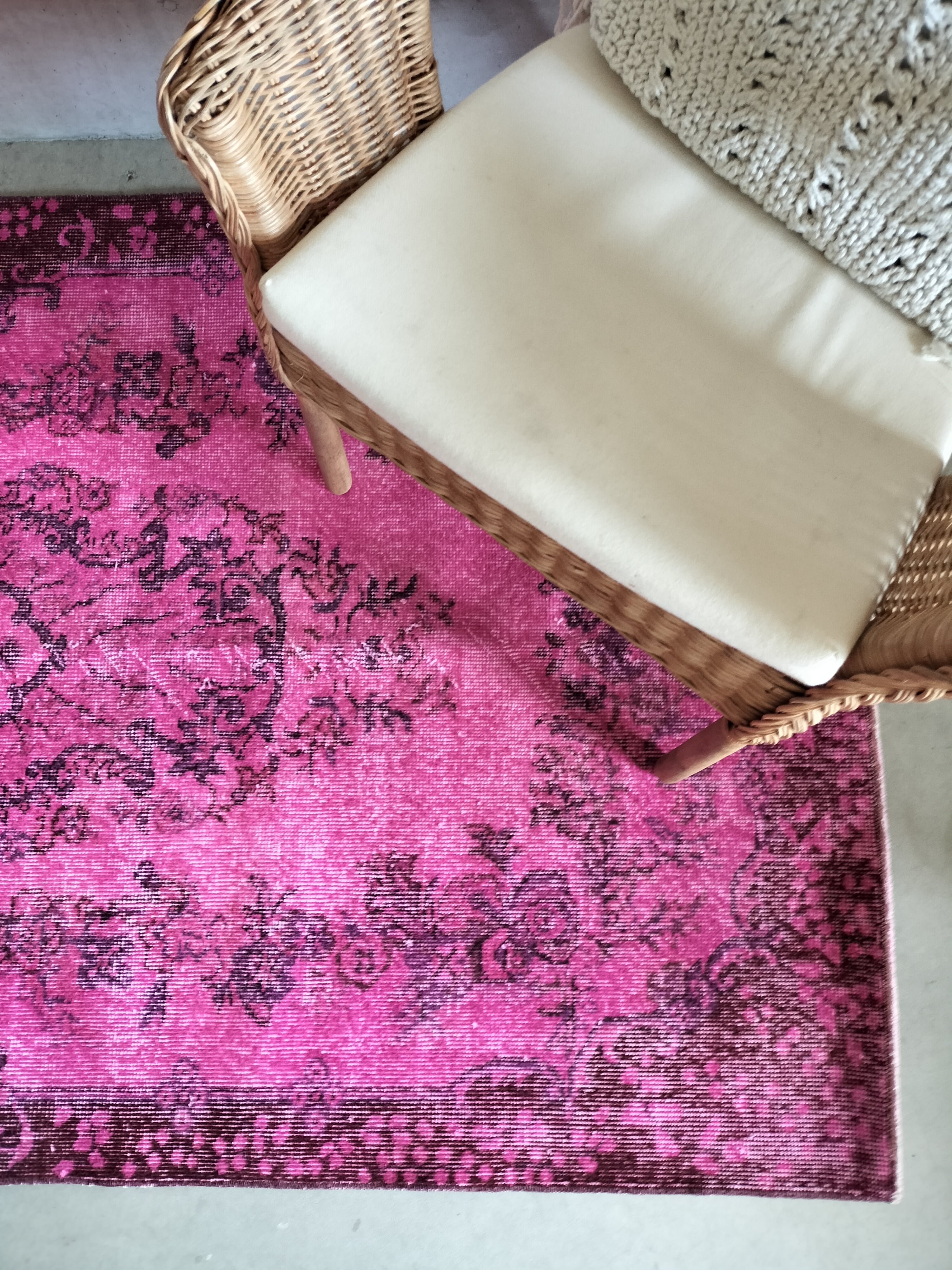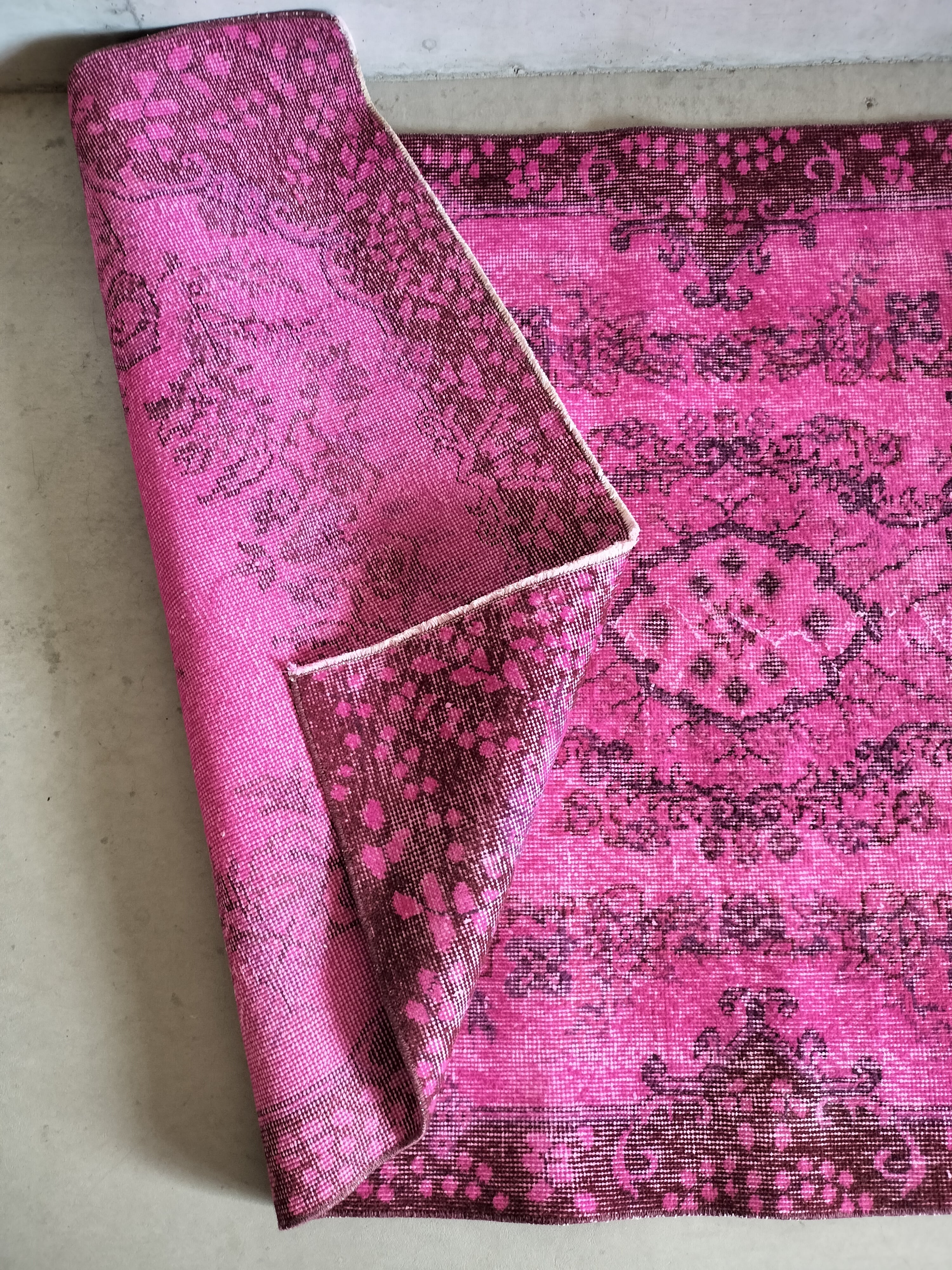 鮮やかなマゼンタピンクでオーバーダイ(後染め)されたヴィンテージラグ。縁は赤味ブラウン、ブラウンや紫で元の柄が浮き出ています。色味の可愛らしさの中にヴィンテージラグの落ち着き感も共存しています。