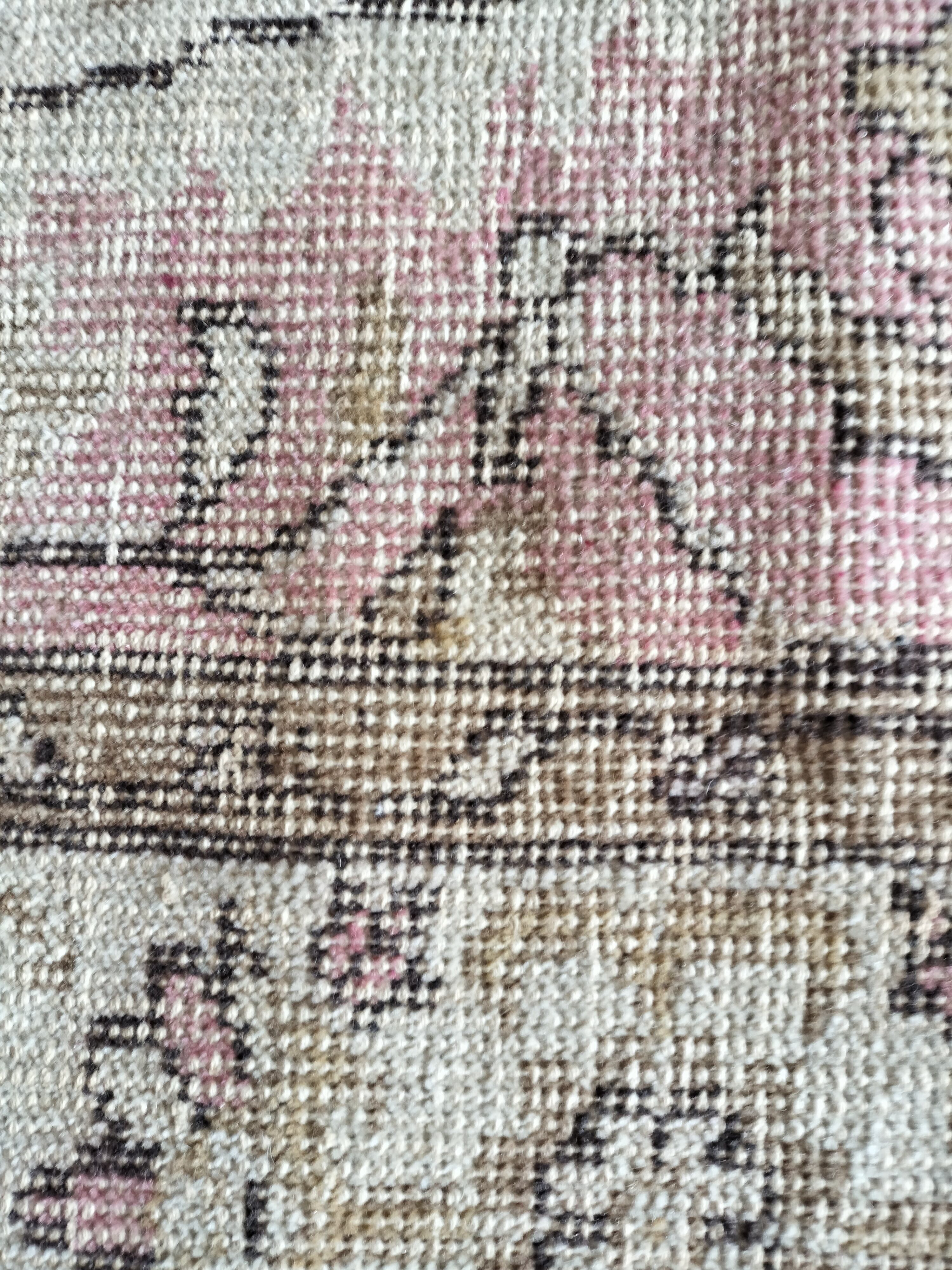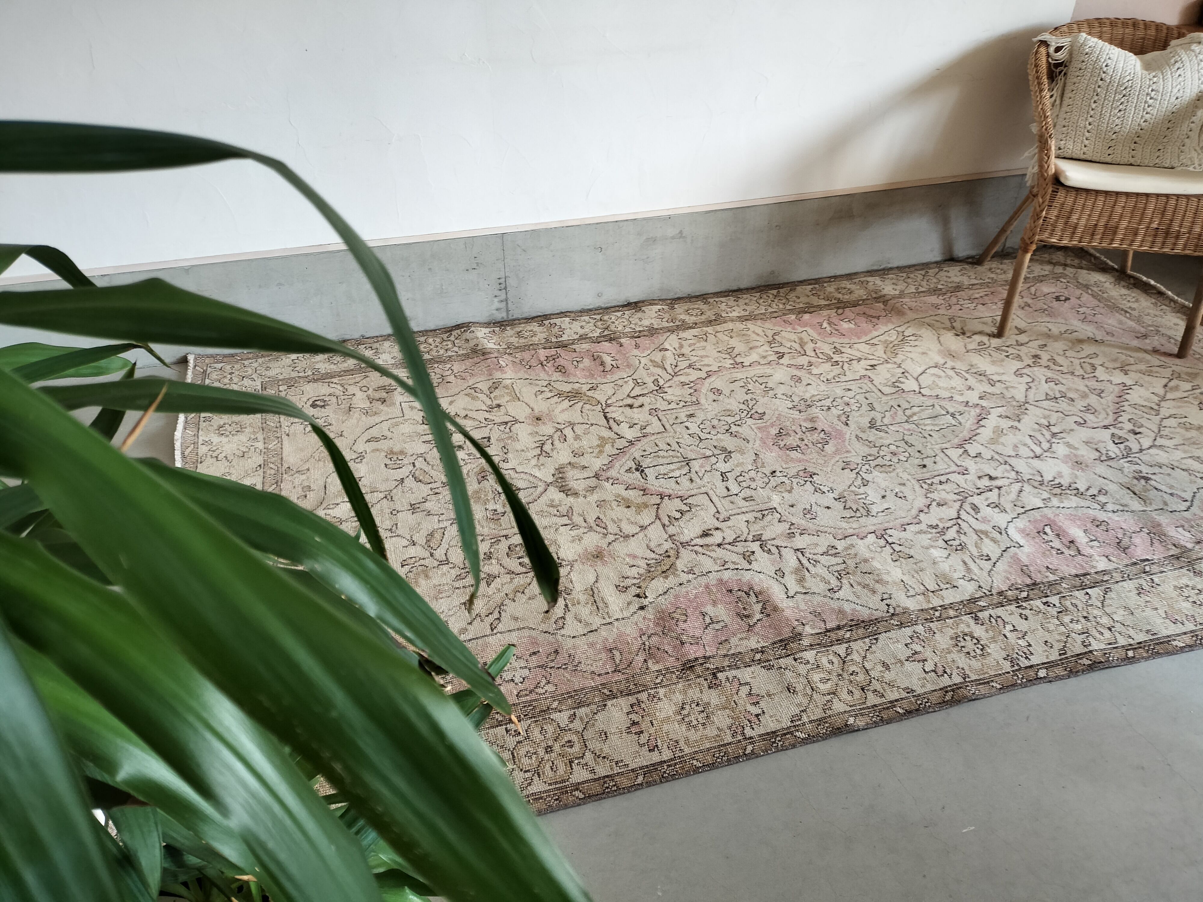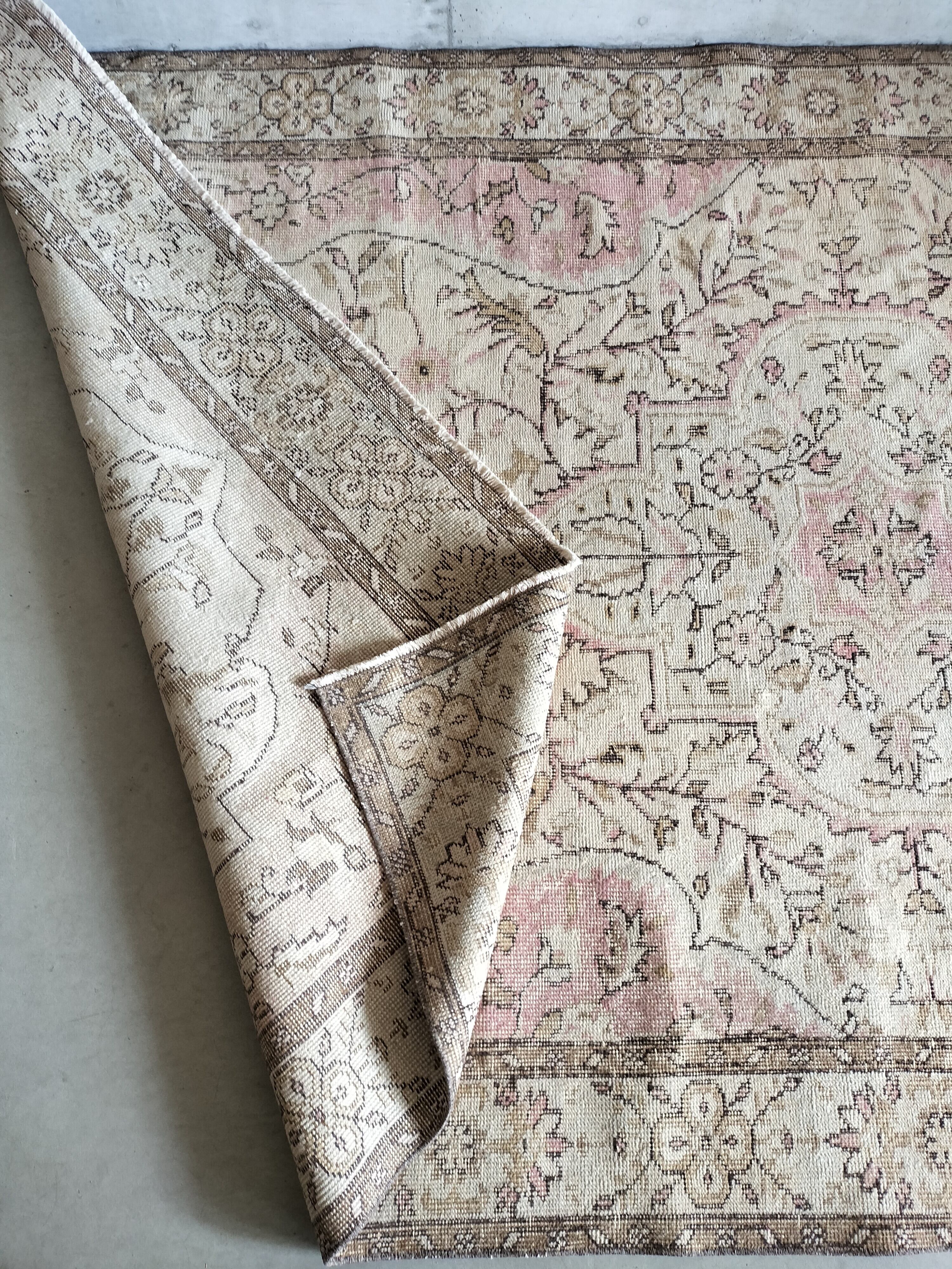 ヴィンテージらしいかすれたサーモンピンクとネイビーが端正な表情の上品トルコラグ。