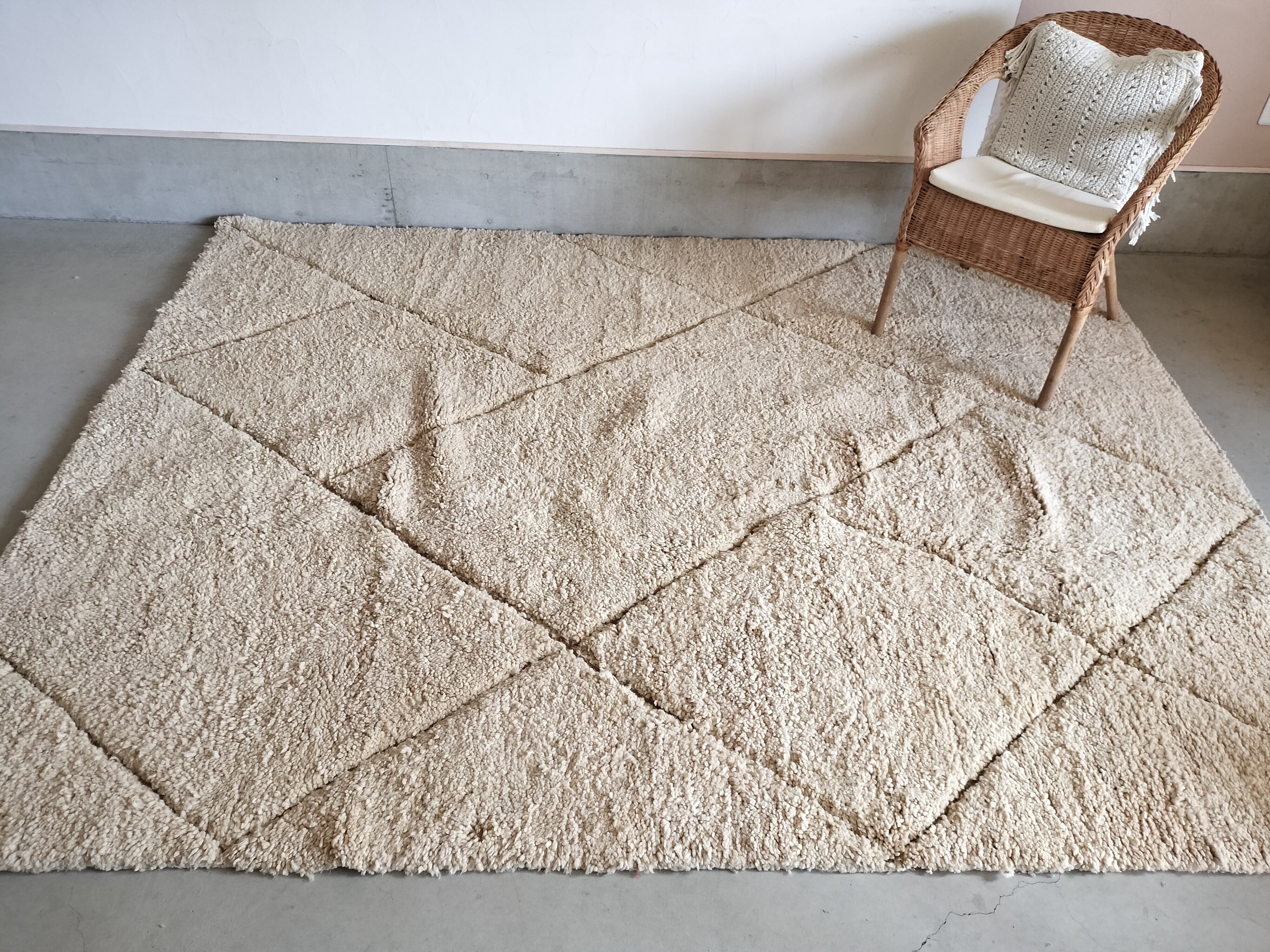 新品のベージュがかったアイボリーをベースに平織りで不規則なダイヤ柄が入るモダンなベニワレンラグ。