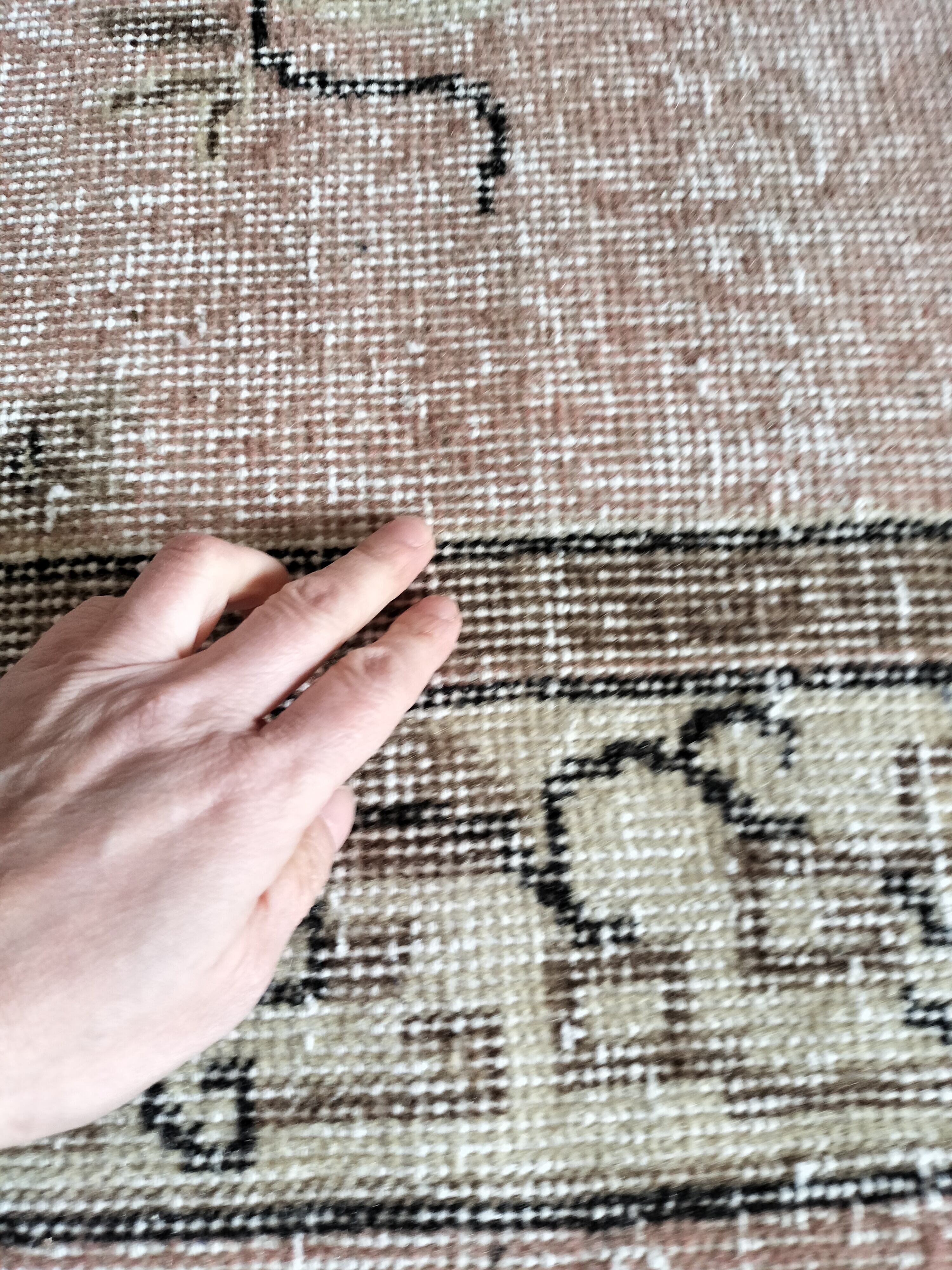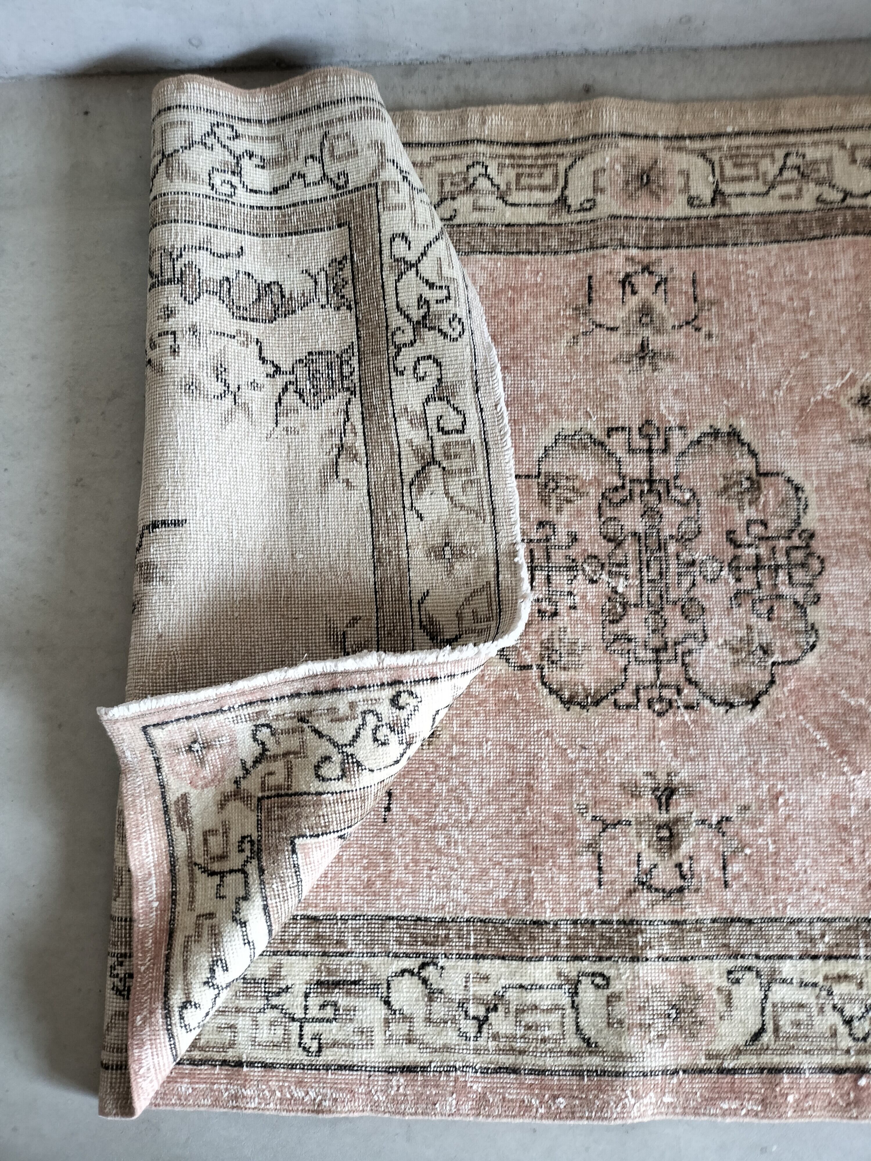 優しいサーモンピンクが美しいヴィンテージラグ。黒のラインにベージュやカフェオレブラウンが入ります。