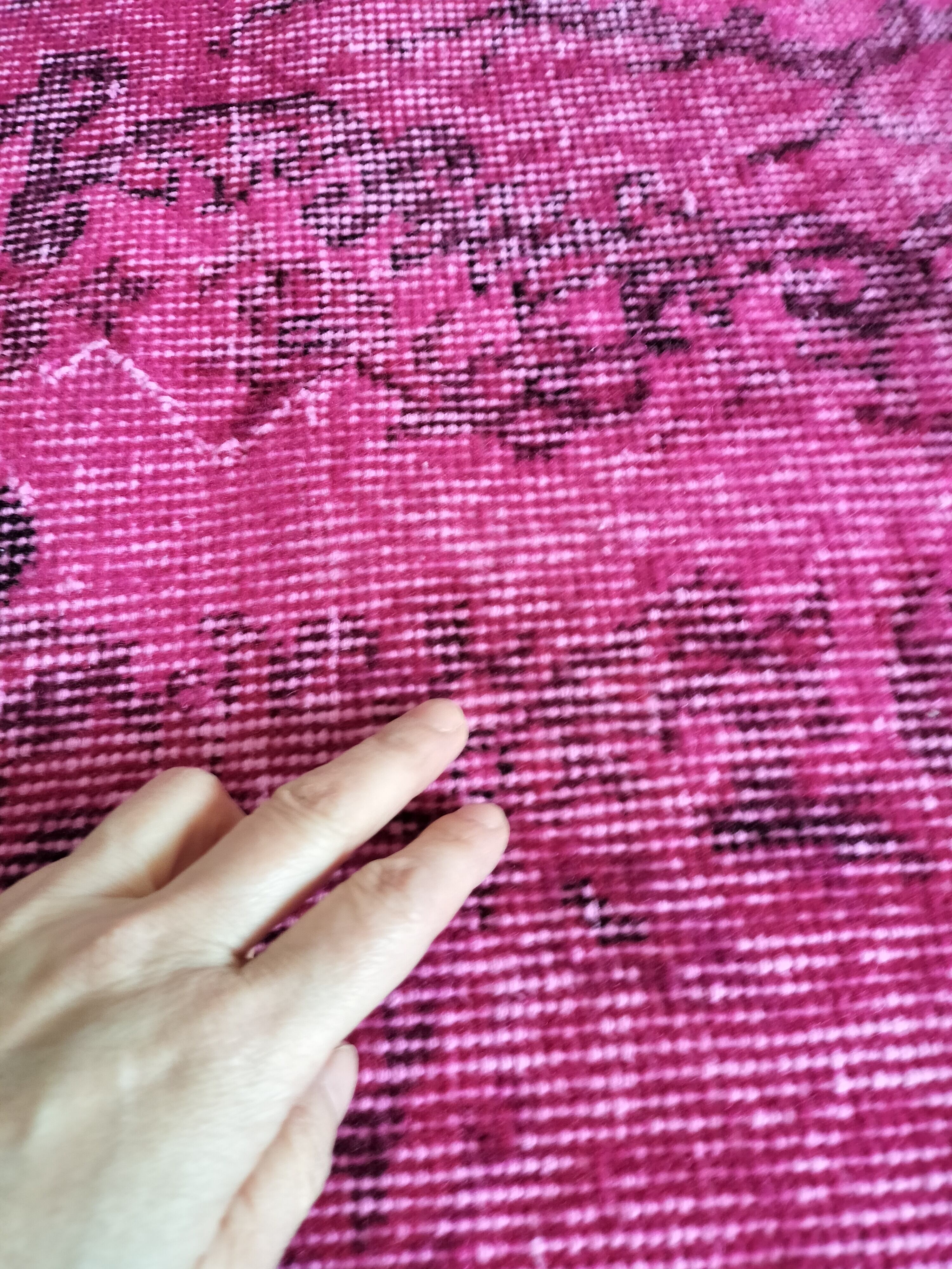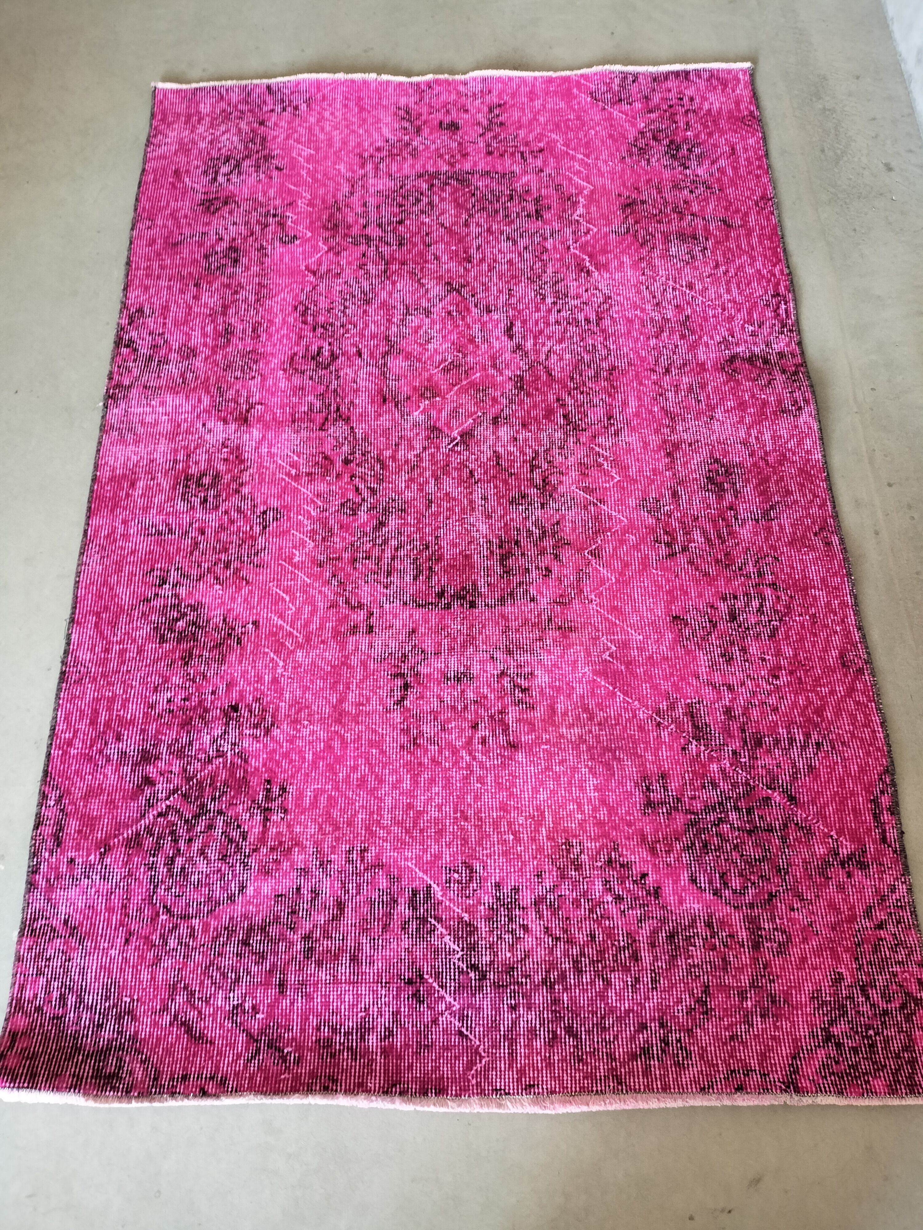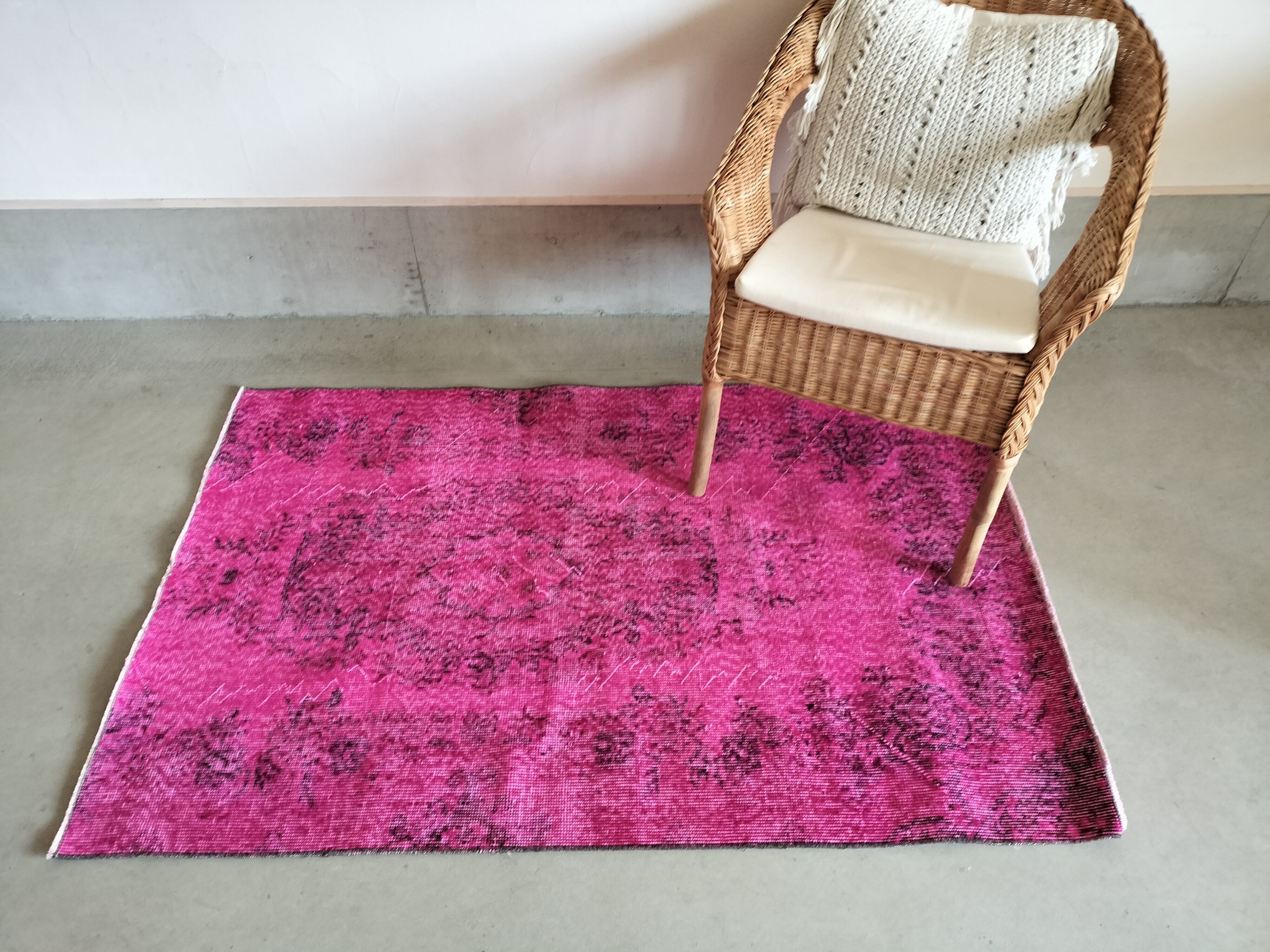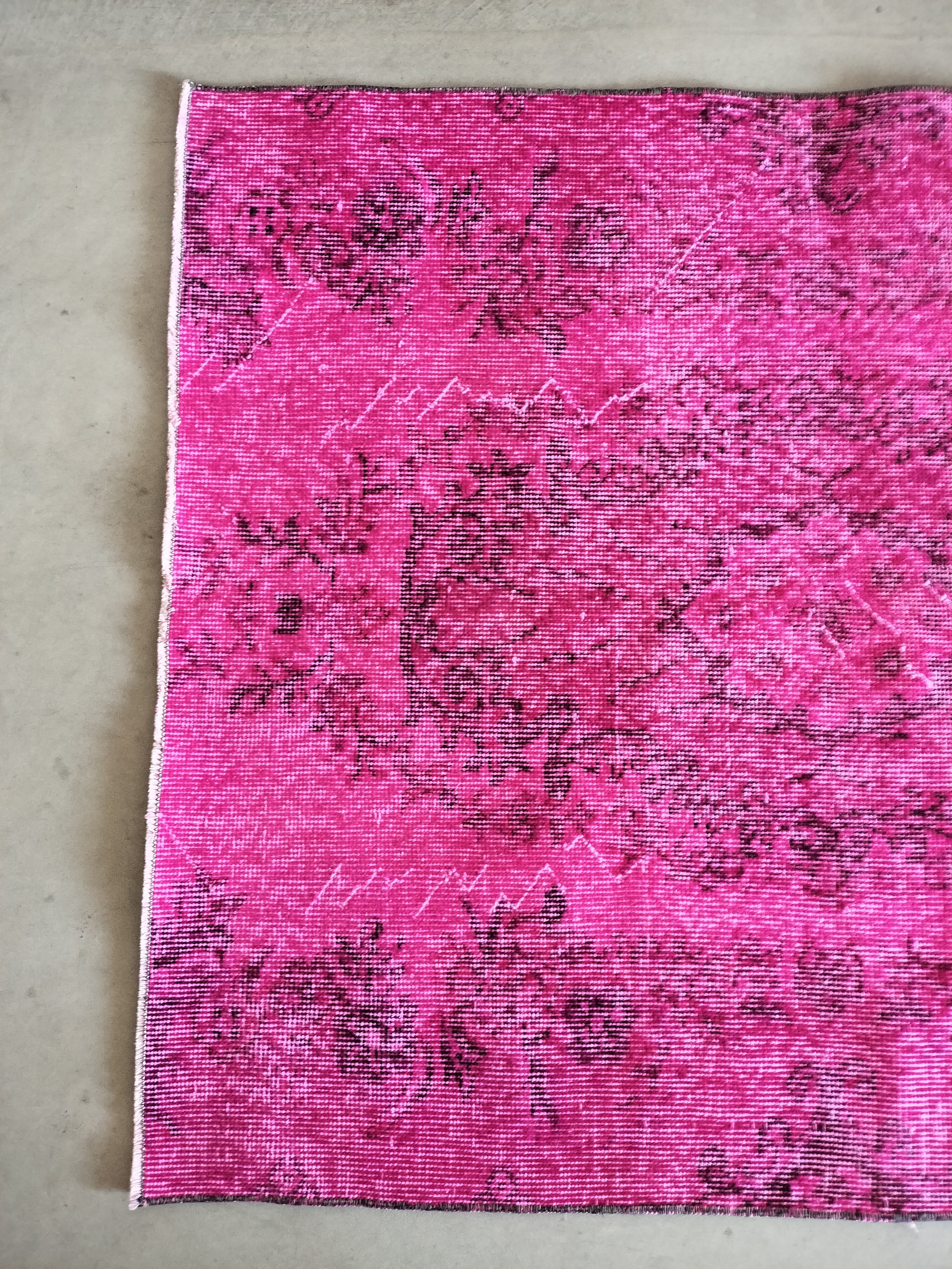 鮮やかなマゼンタピンクのオーバーダイされた定番柄のラグ。