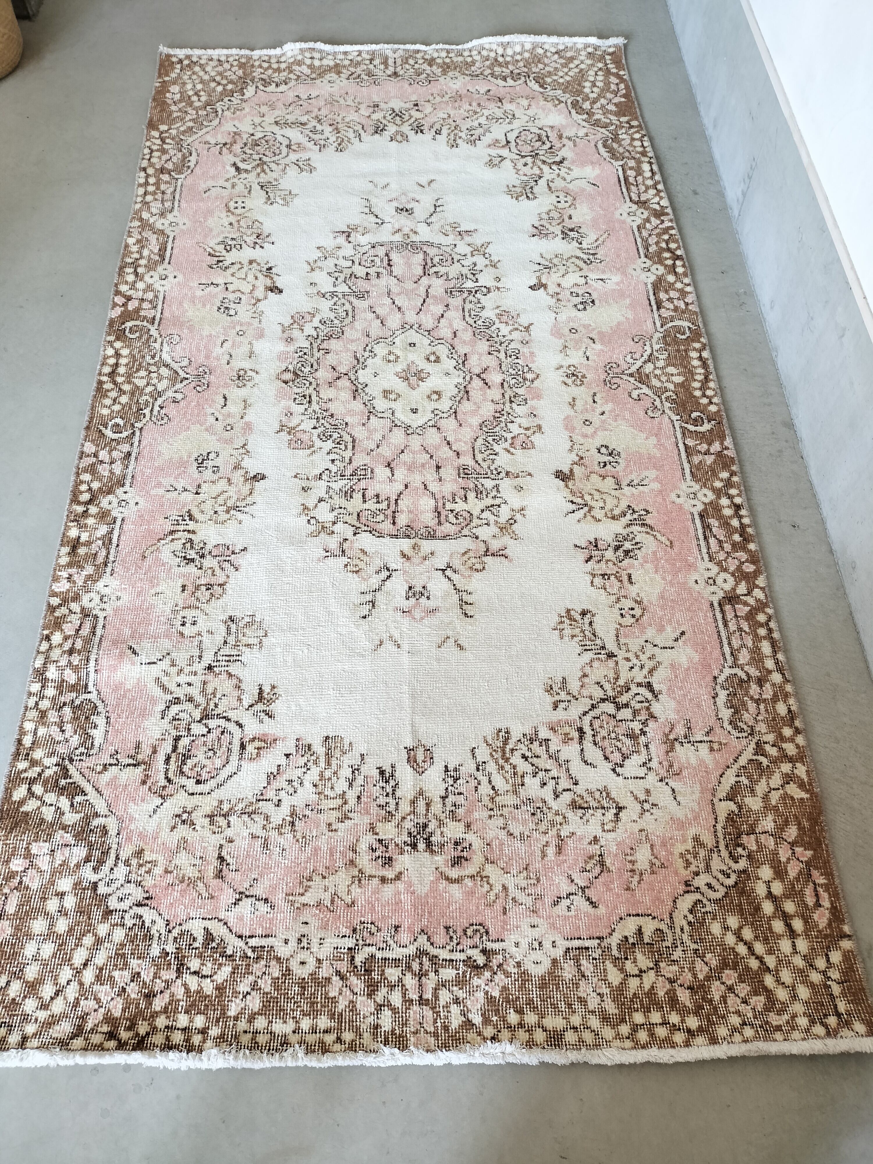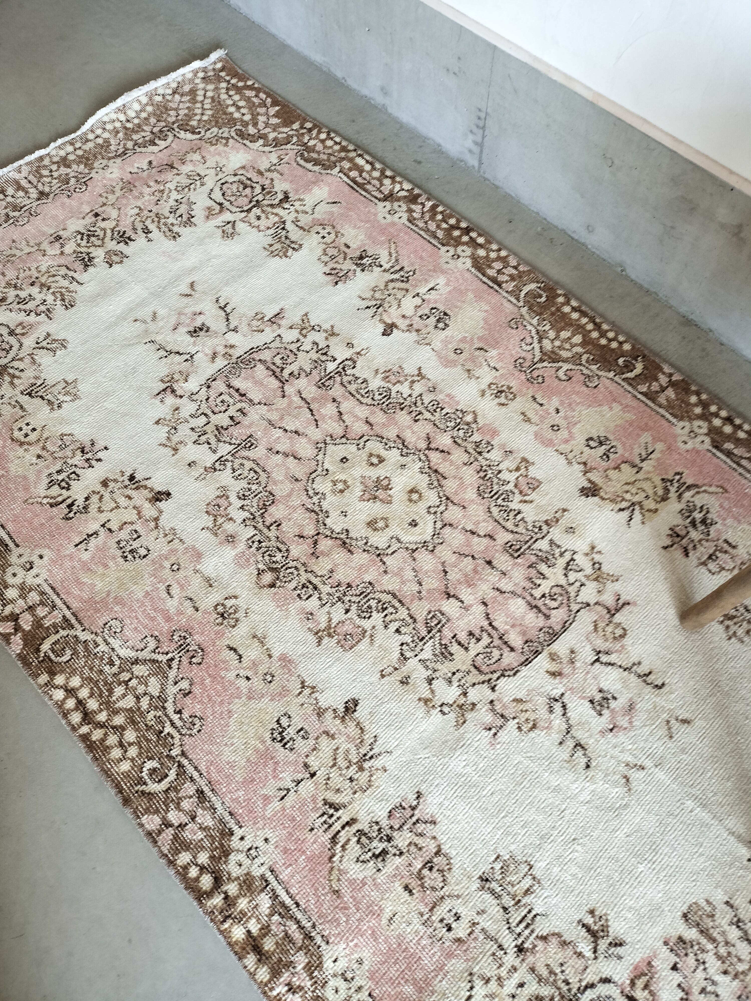 柔らかい印象のさくらピンクが美しいヴィンテージトルコラグ。