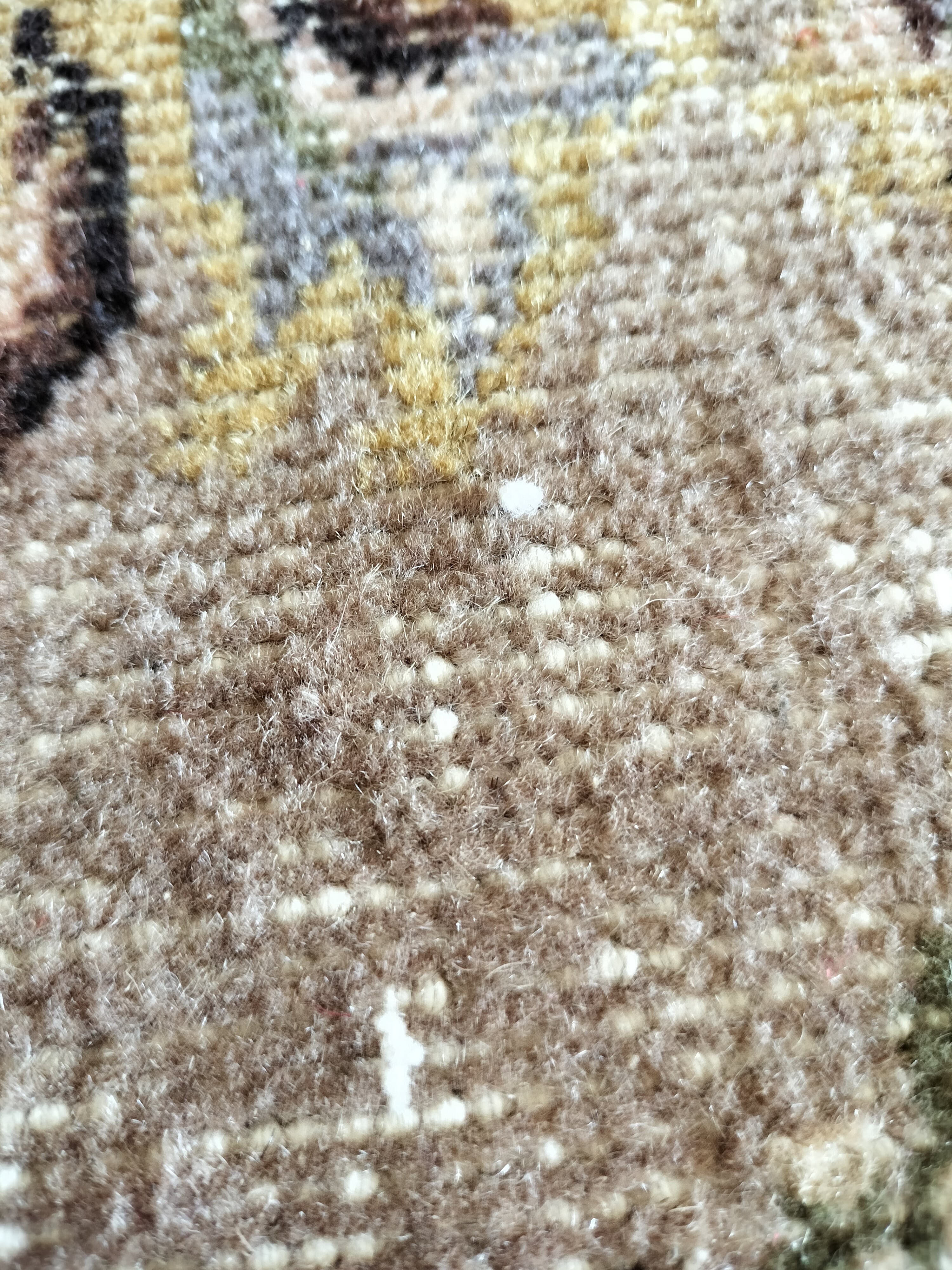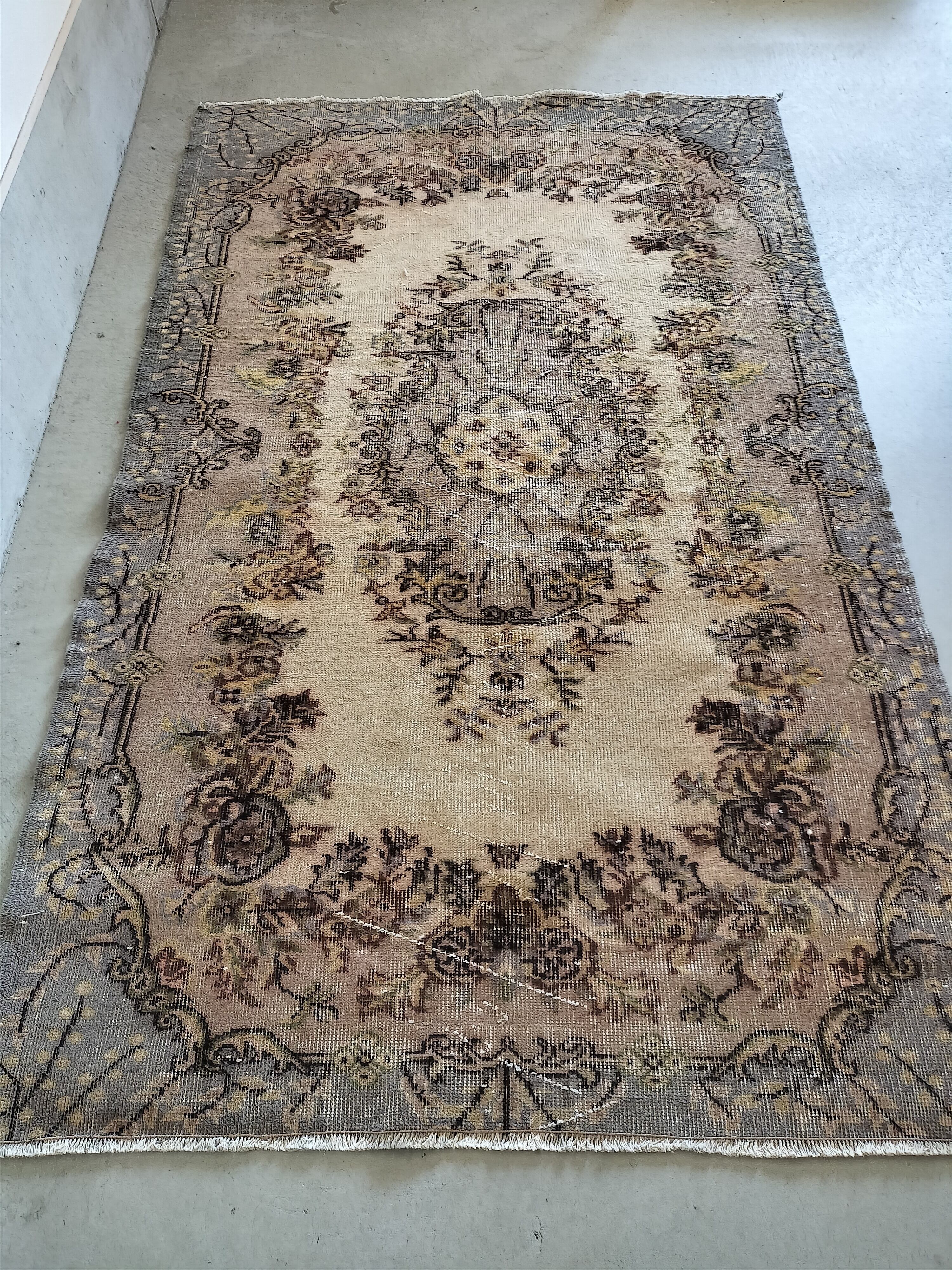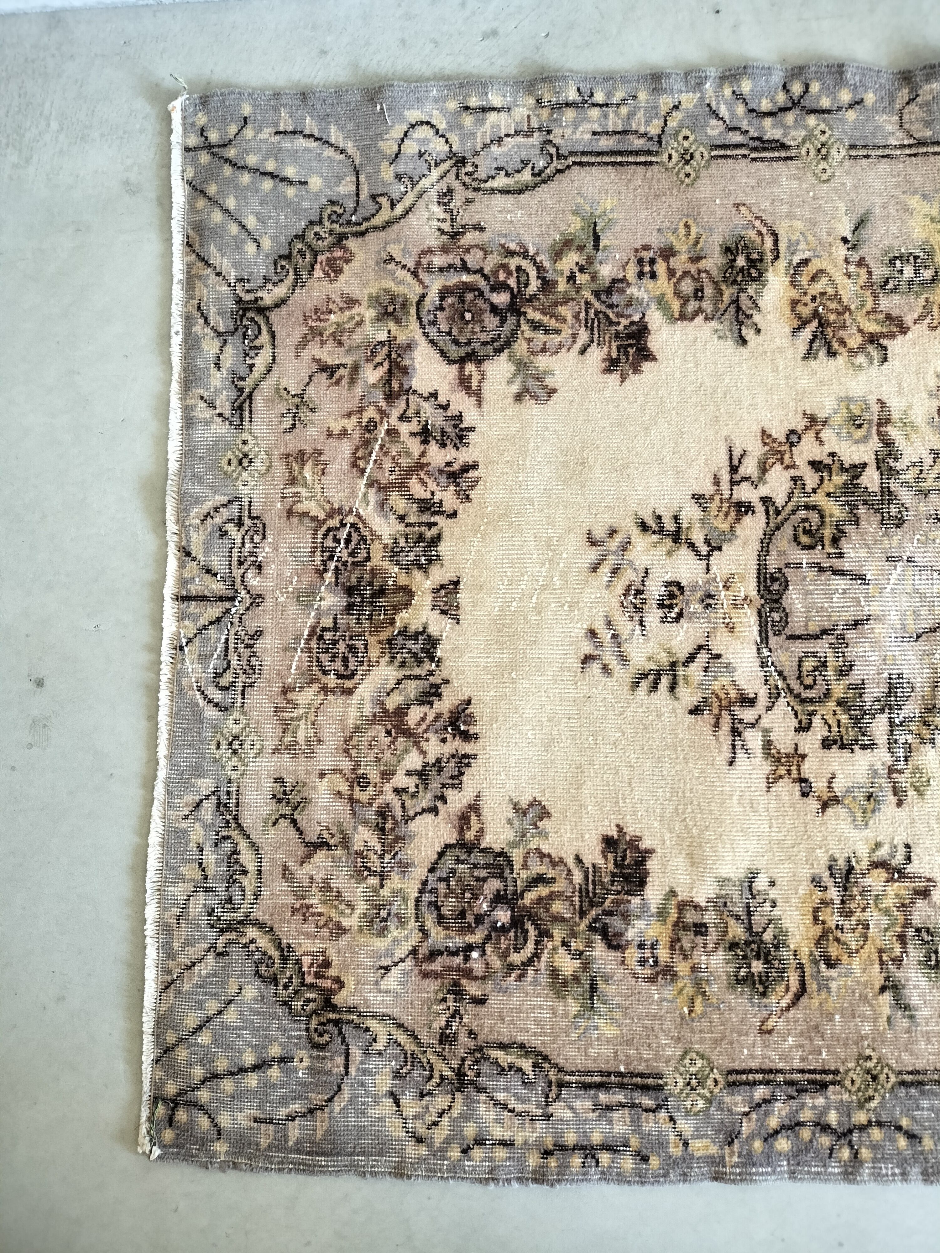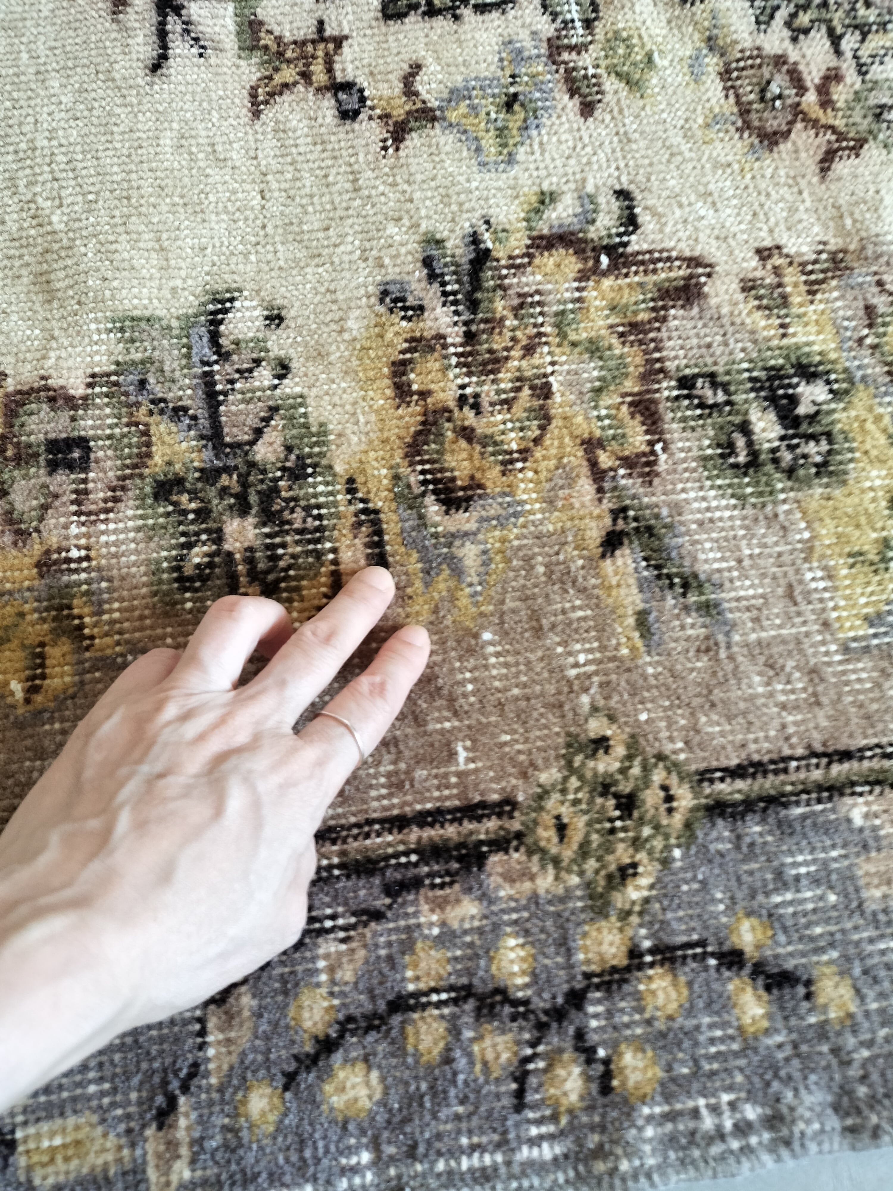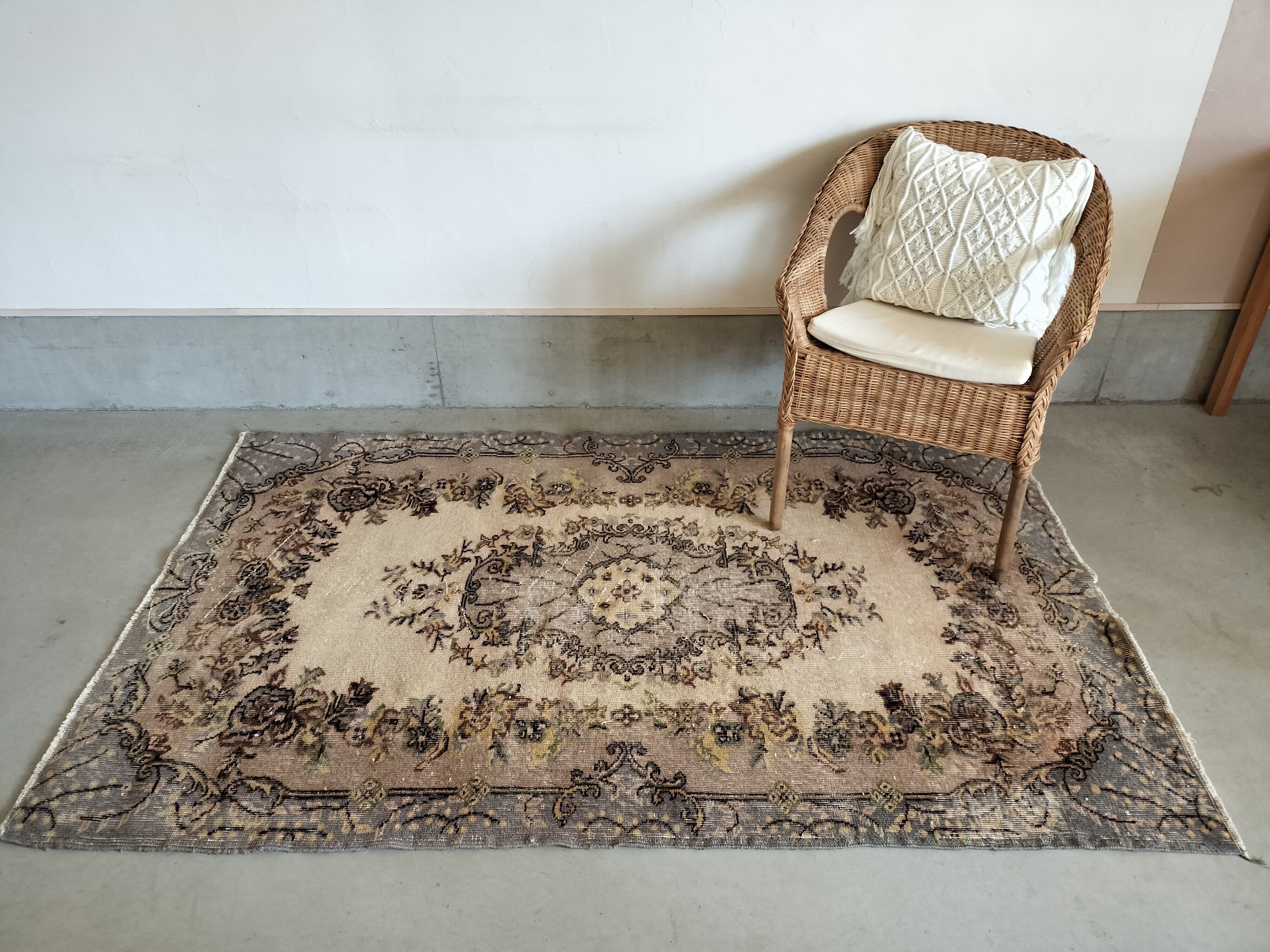 紫がかったグレーが周りを囲み、カフェオレカラーの中にモスグリーンが見え隠れする大人っぽくも可愛らしいヴィンテージトルコラグ。シックで素敵です。
