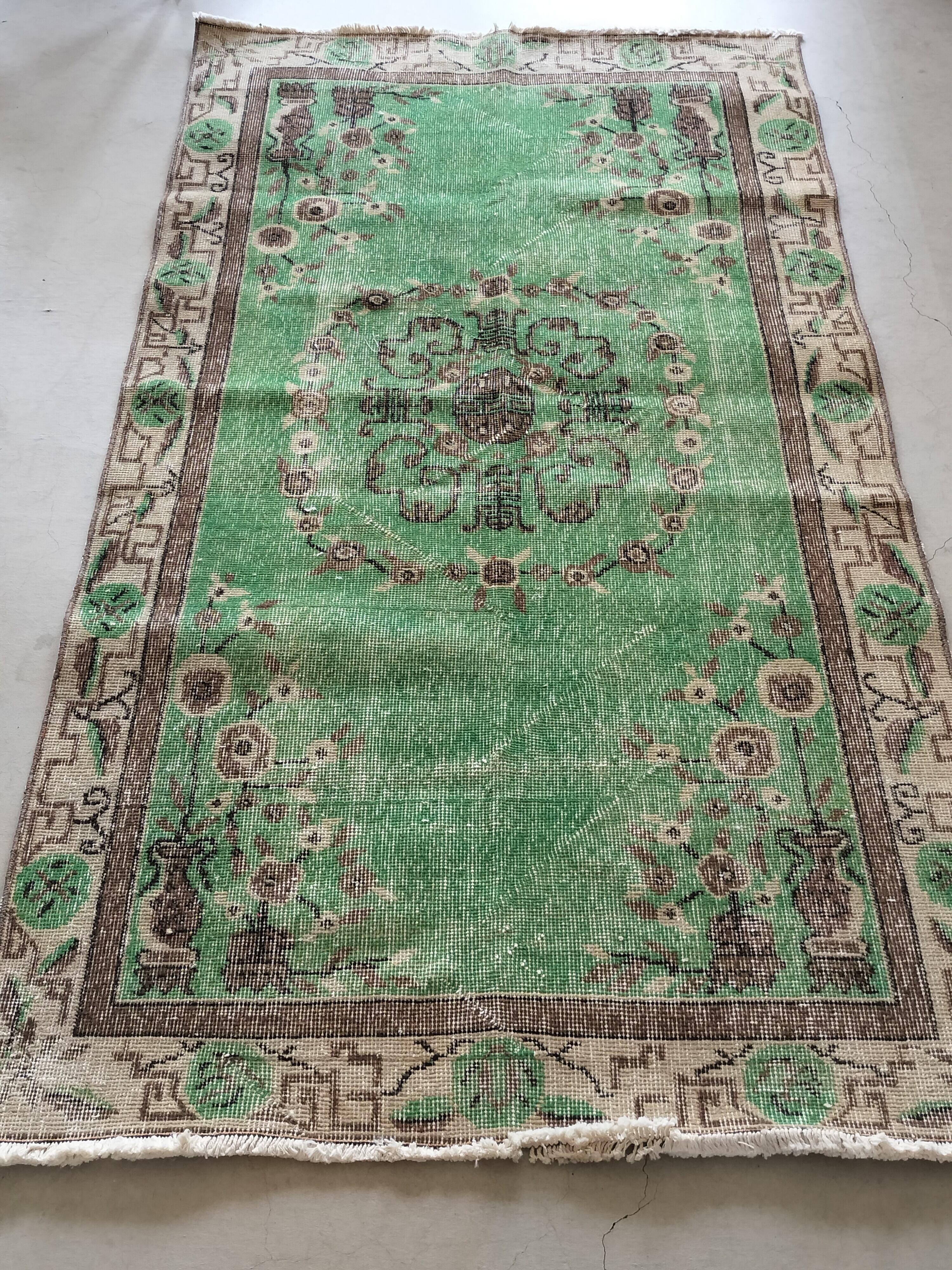 深いグリーンが美しいヴィンテージラグ。柄には落ちついたベージュやブラウンが入ります。