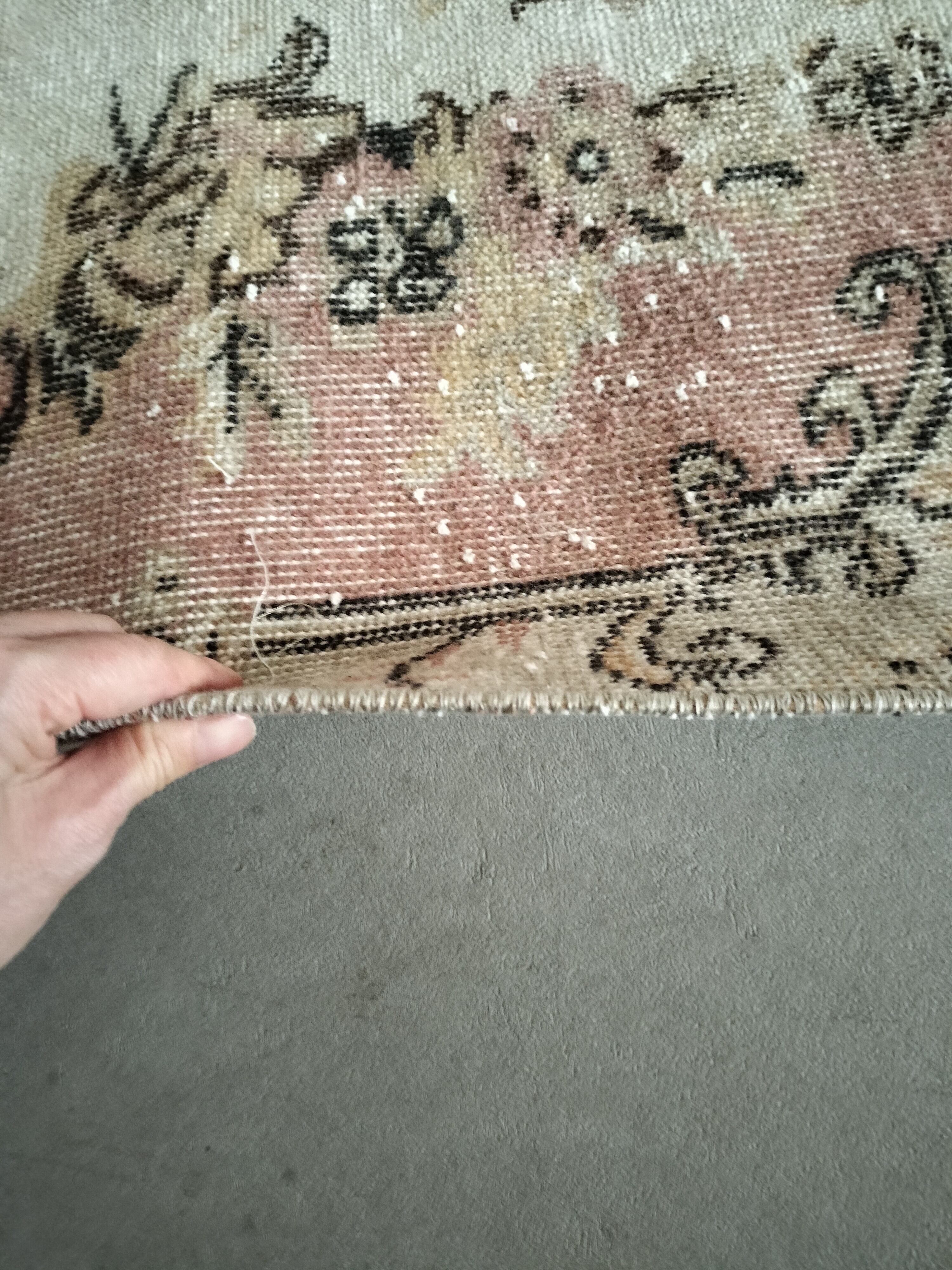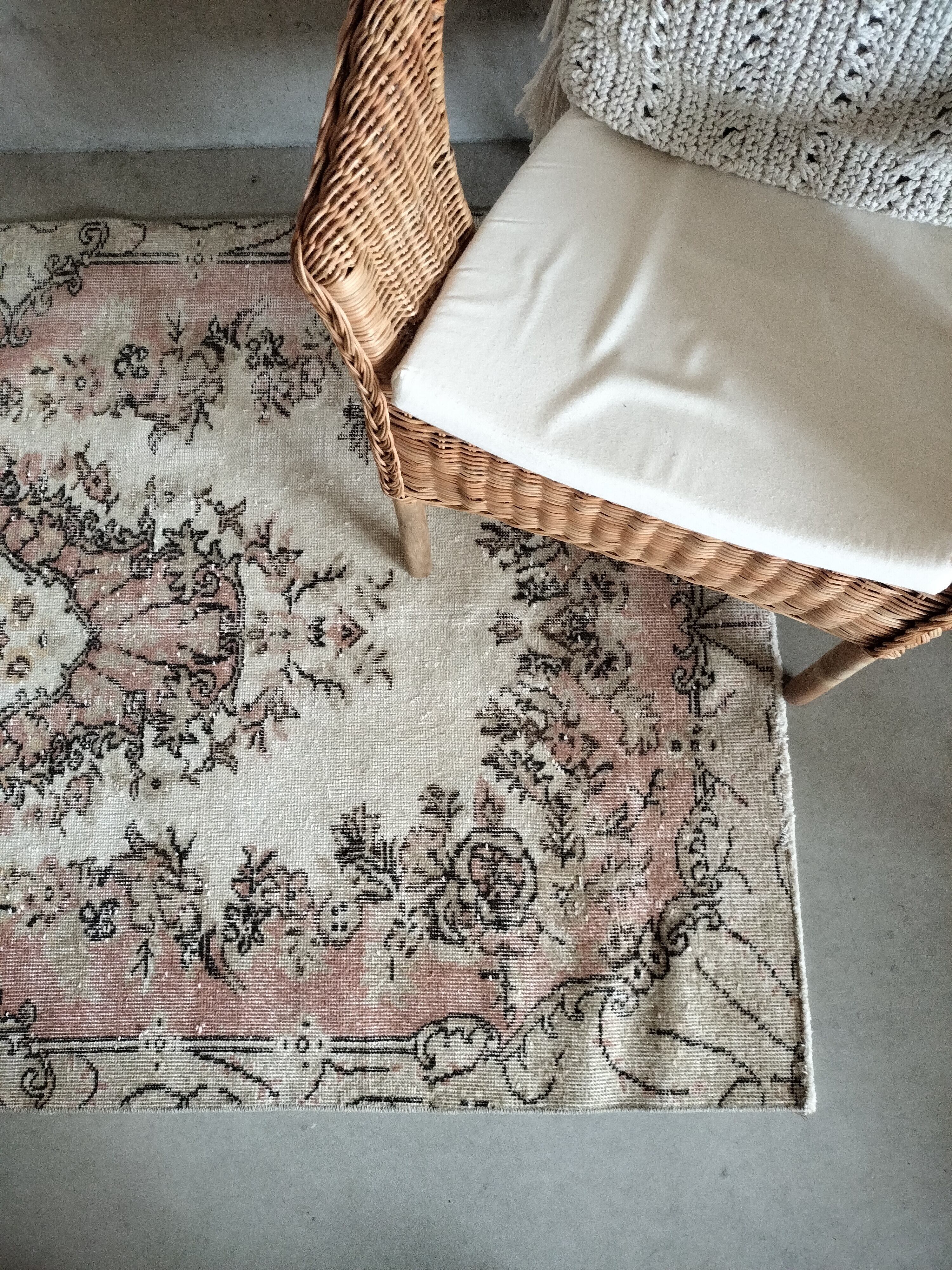 柔らかな淡いカフェオレカラーが周りを囲み、くすみピンクとの柔らかな色合いが上品なヴィンテージトルコラグ。