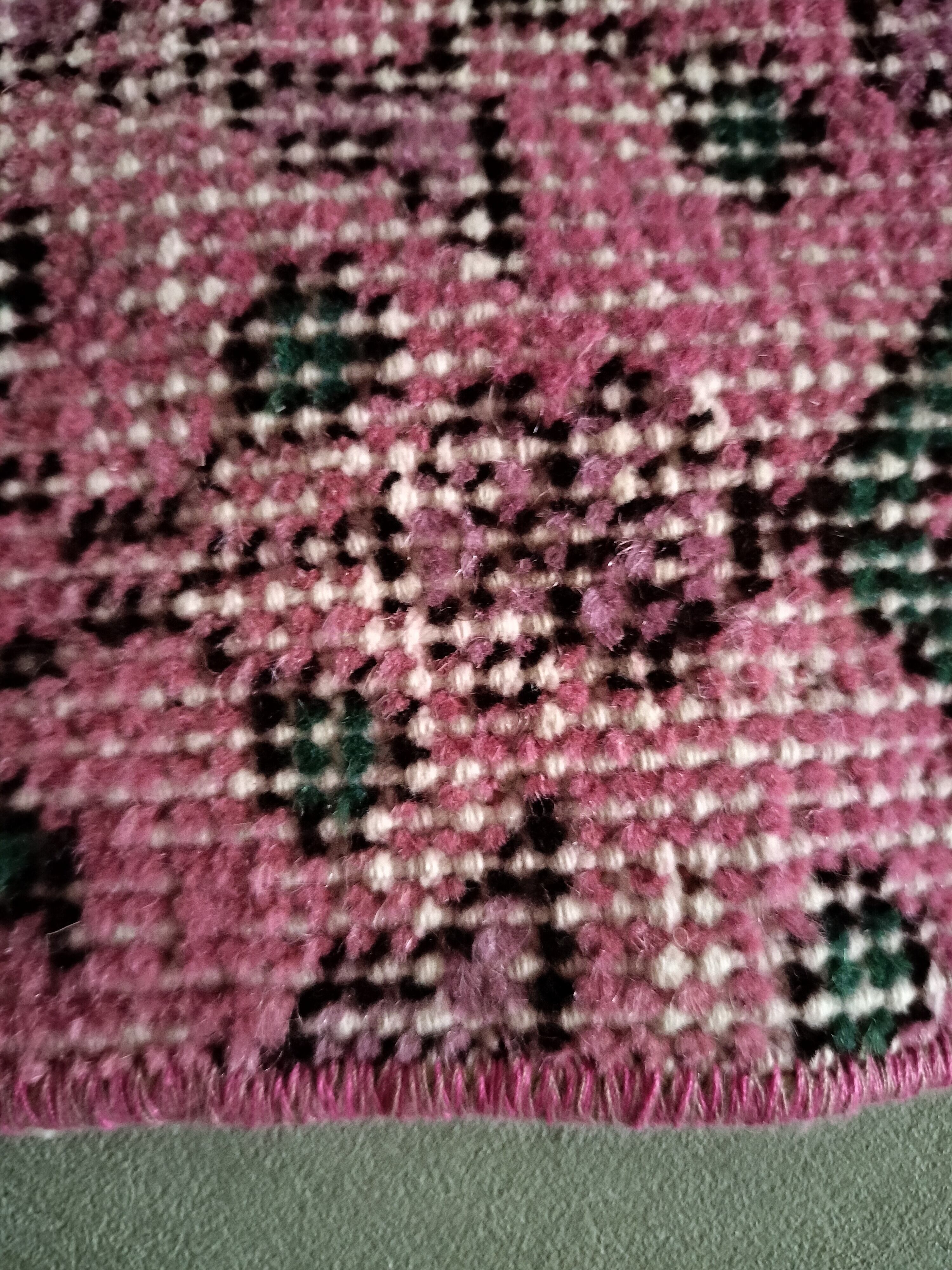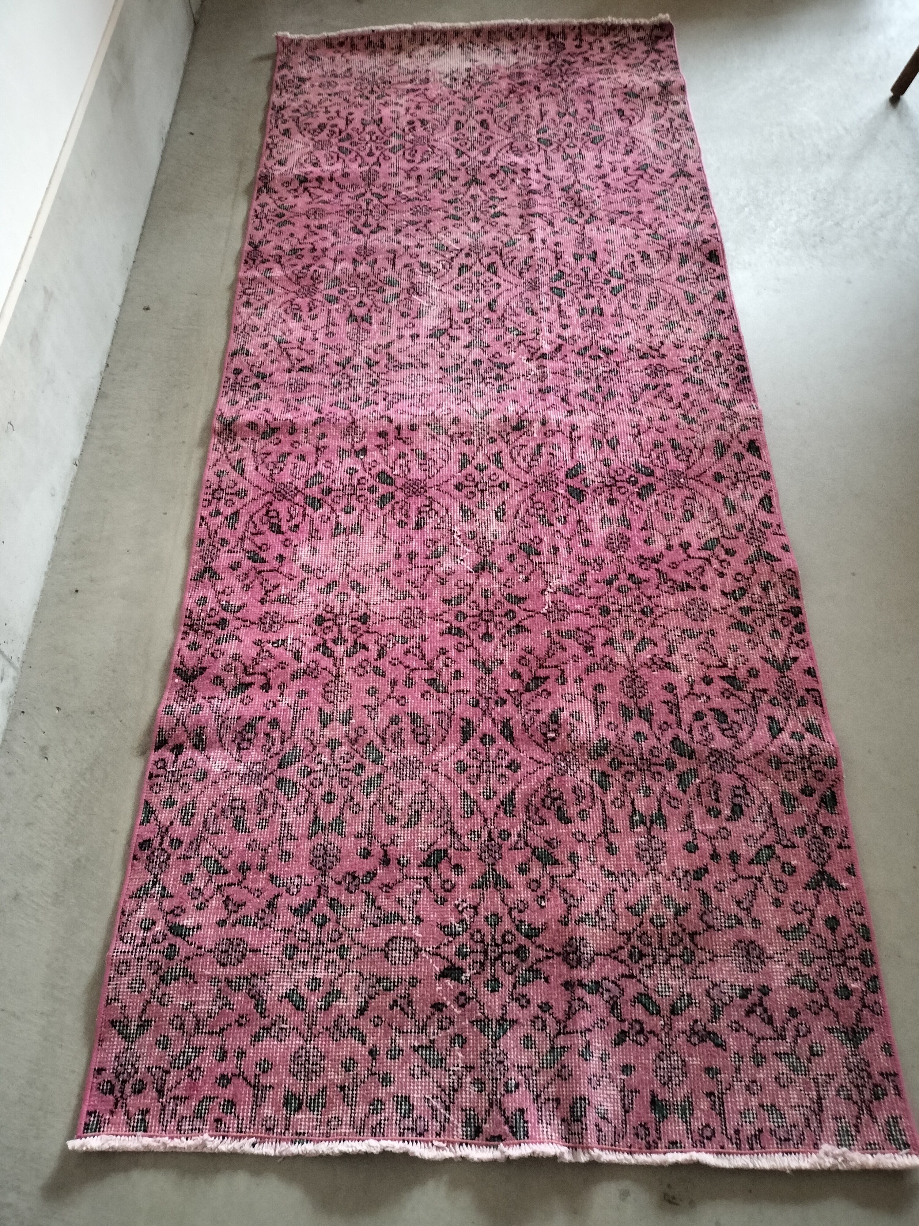 ポップなチェリーピンクでオーバーダイされたヴィンテージトルコラグ。総フラワー柄で葉はターコイズら花は淡い紫が浮かびます。