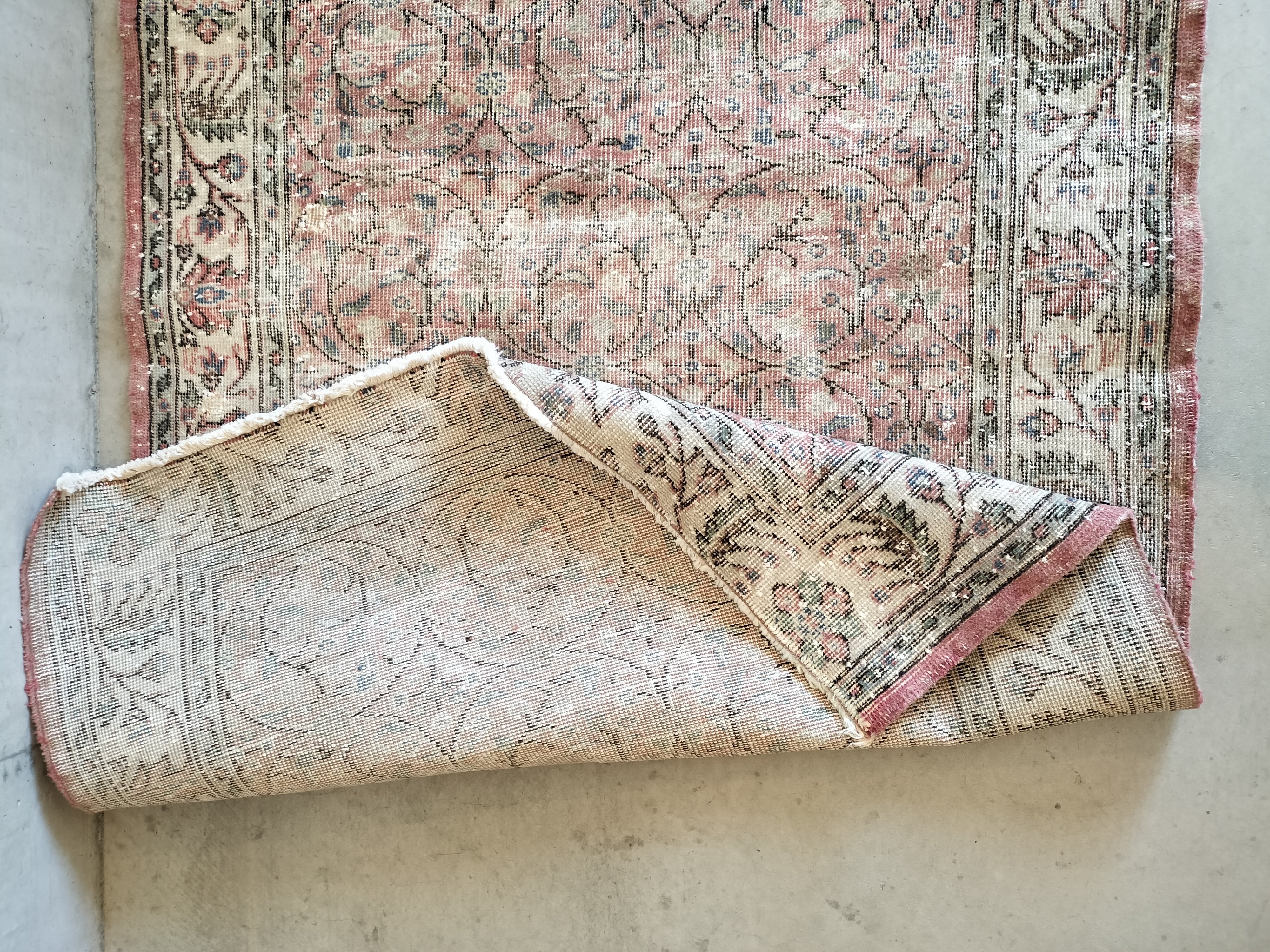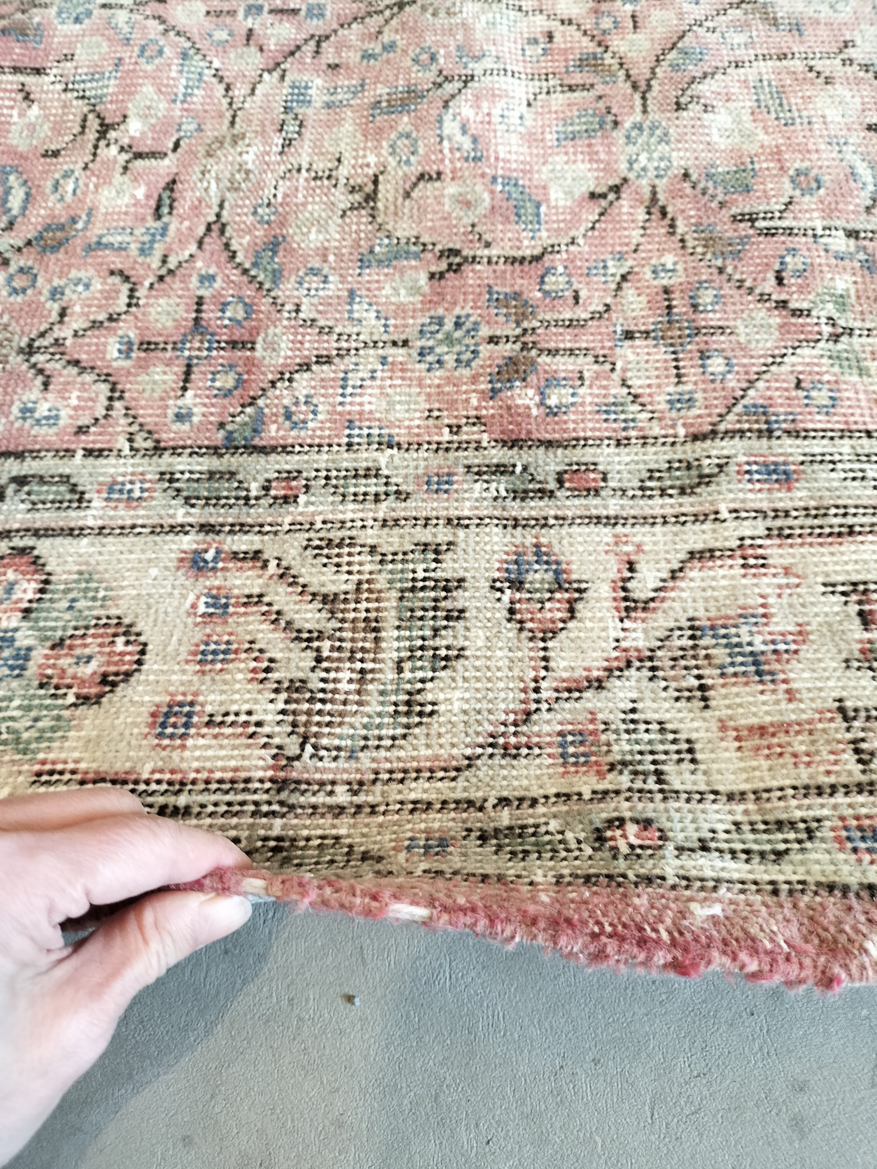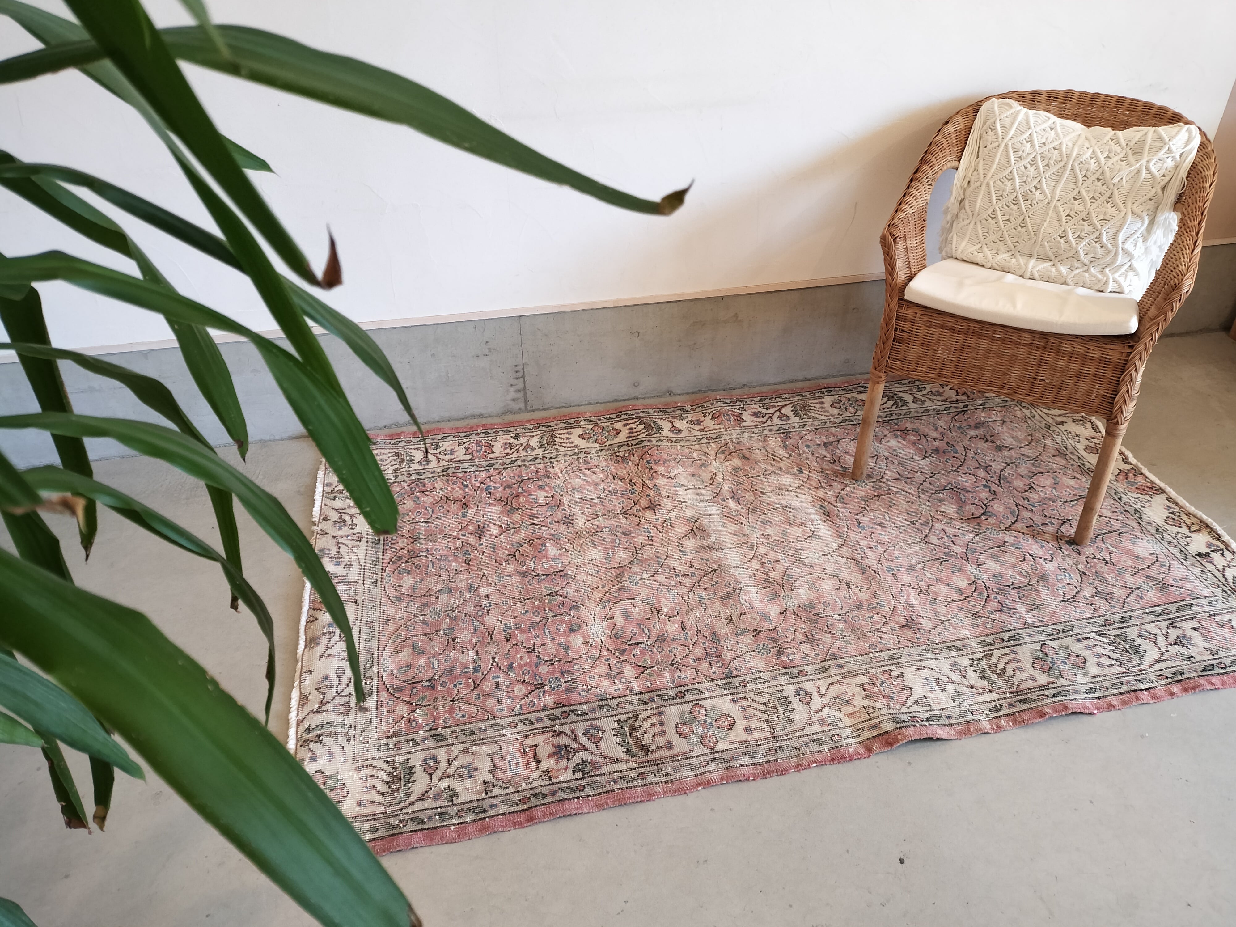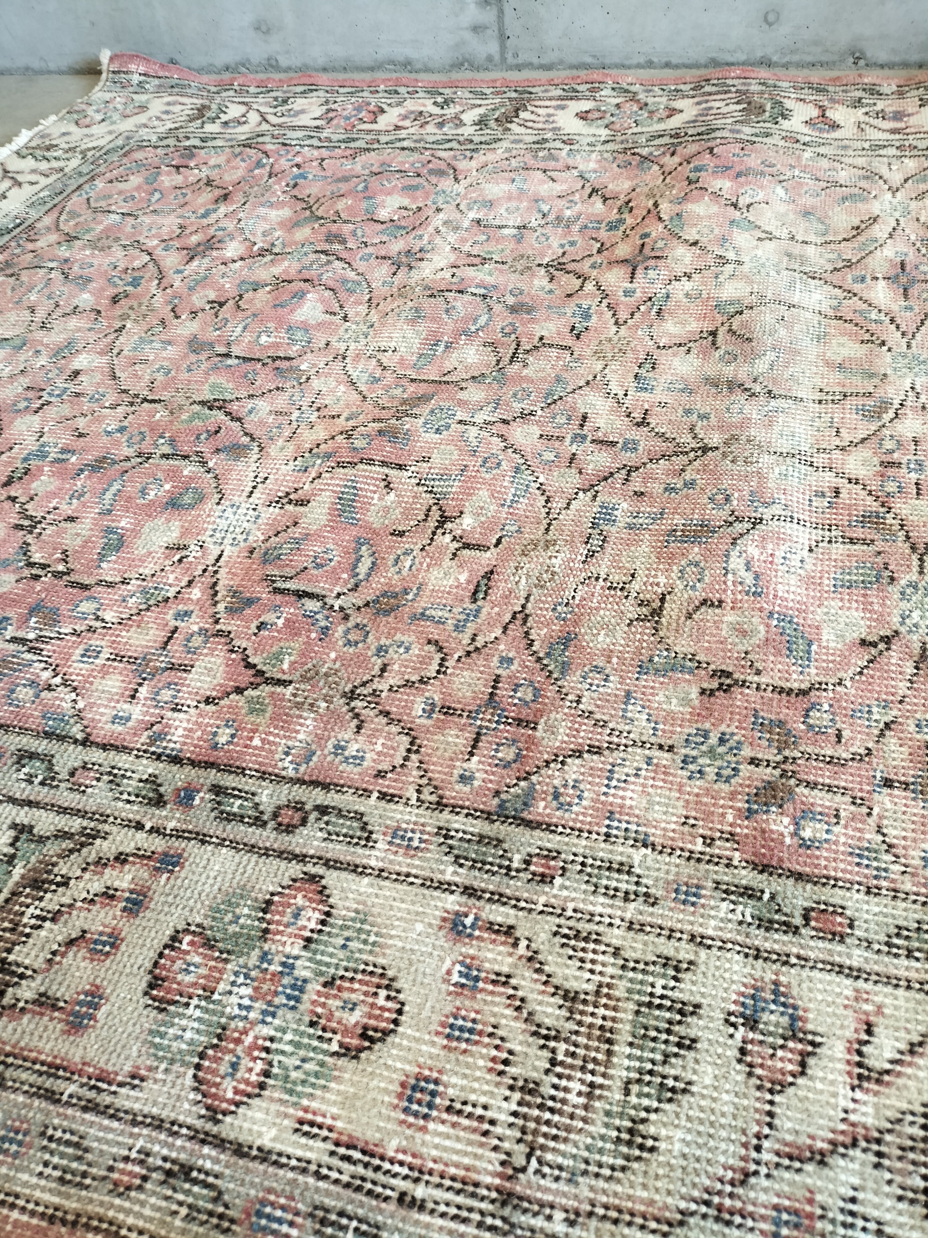 落ち着いたローズピンクに全体にフラワー柄の入る上品なトルコラグ。花にはグレイッシュブルーが入り、アクセントに。囲みののベージュも美しいです。