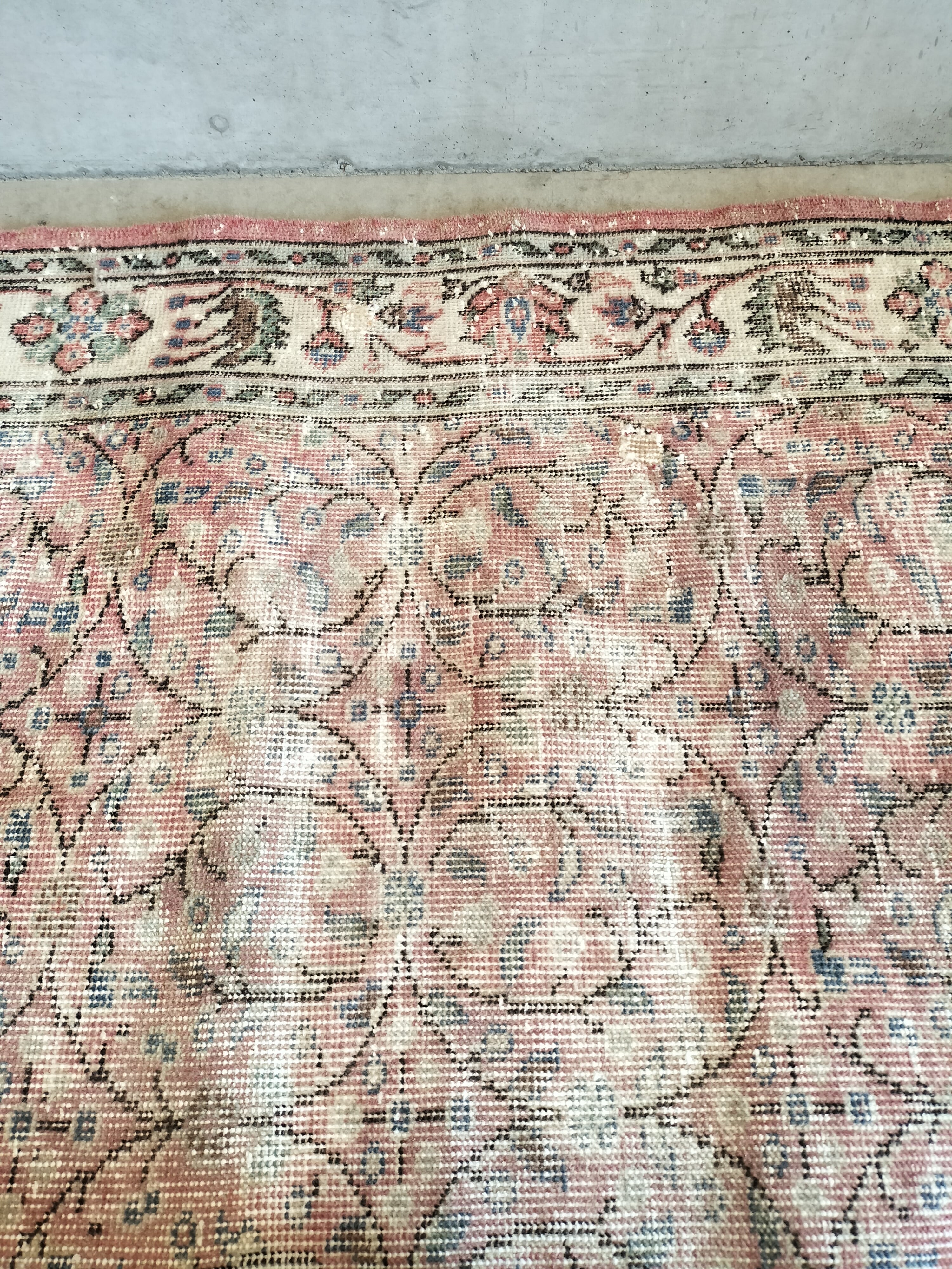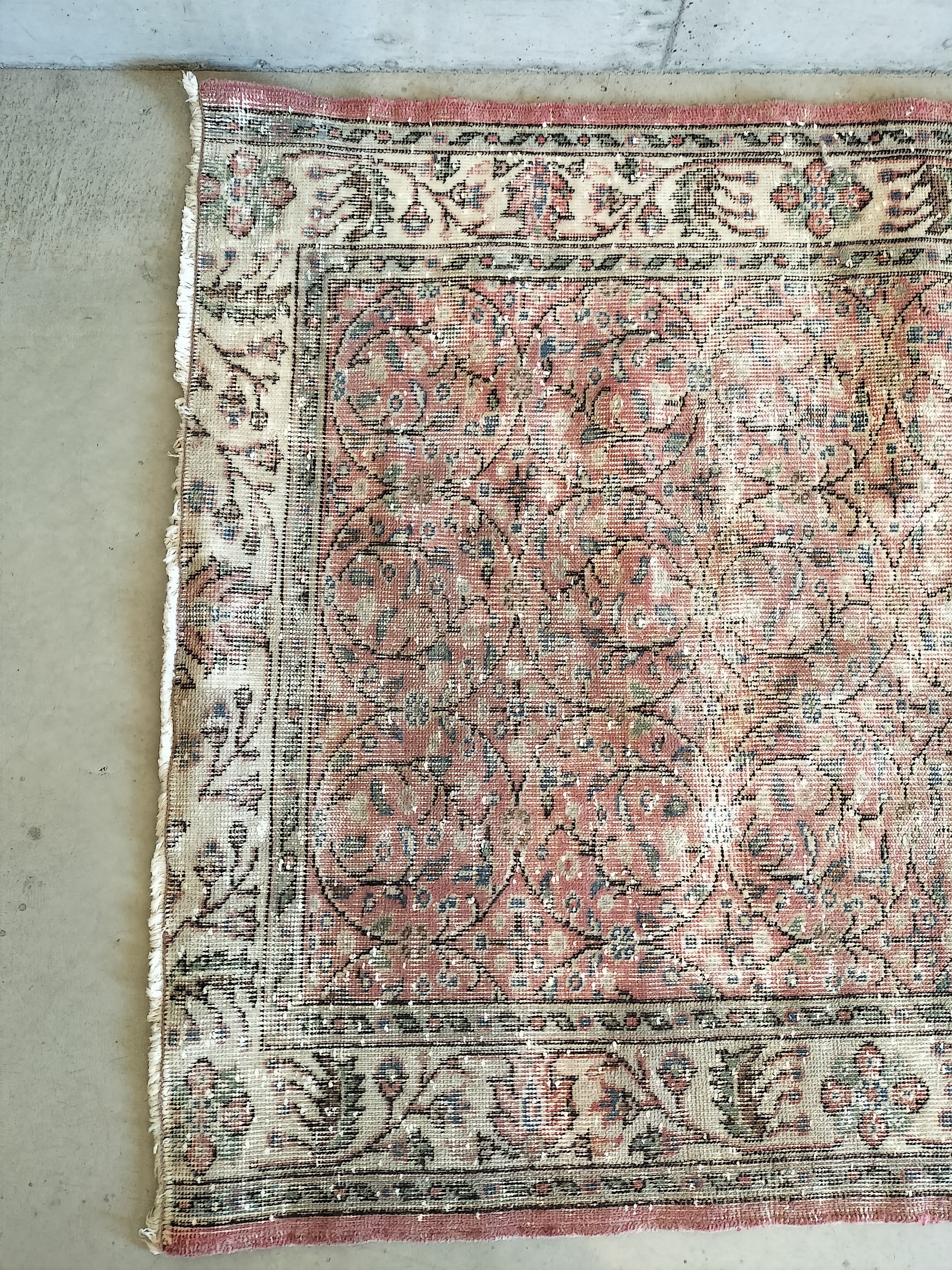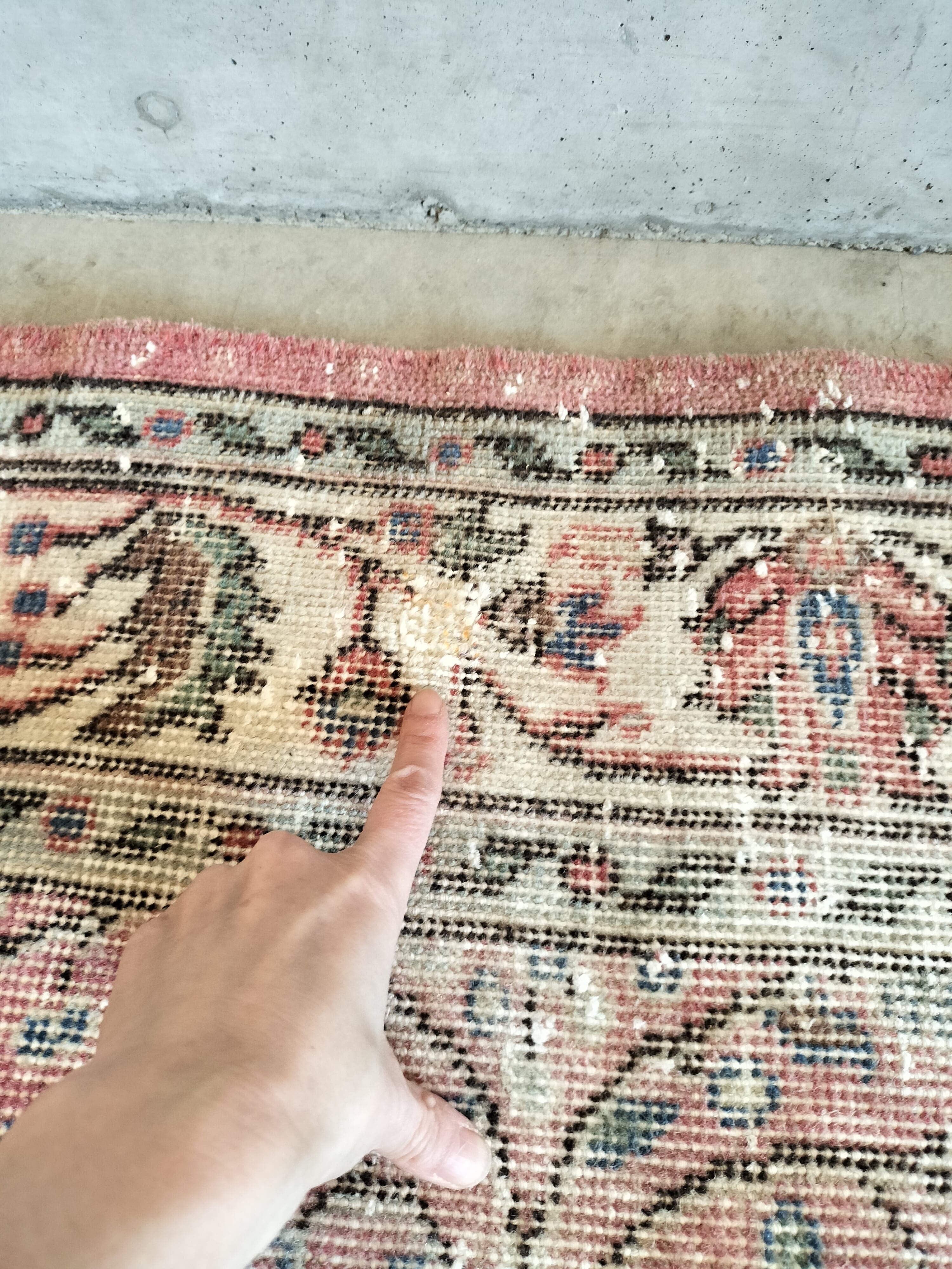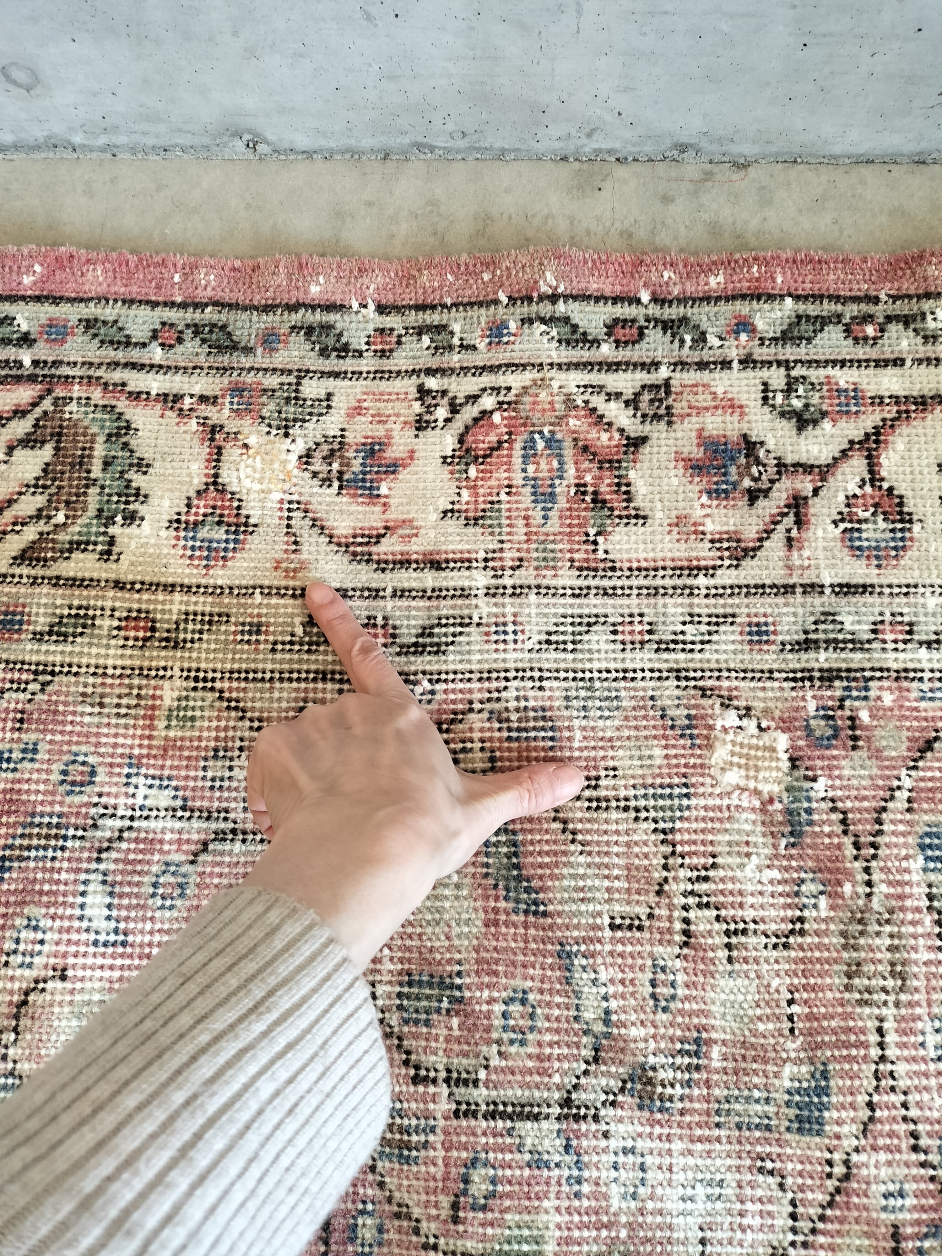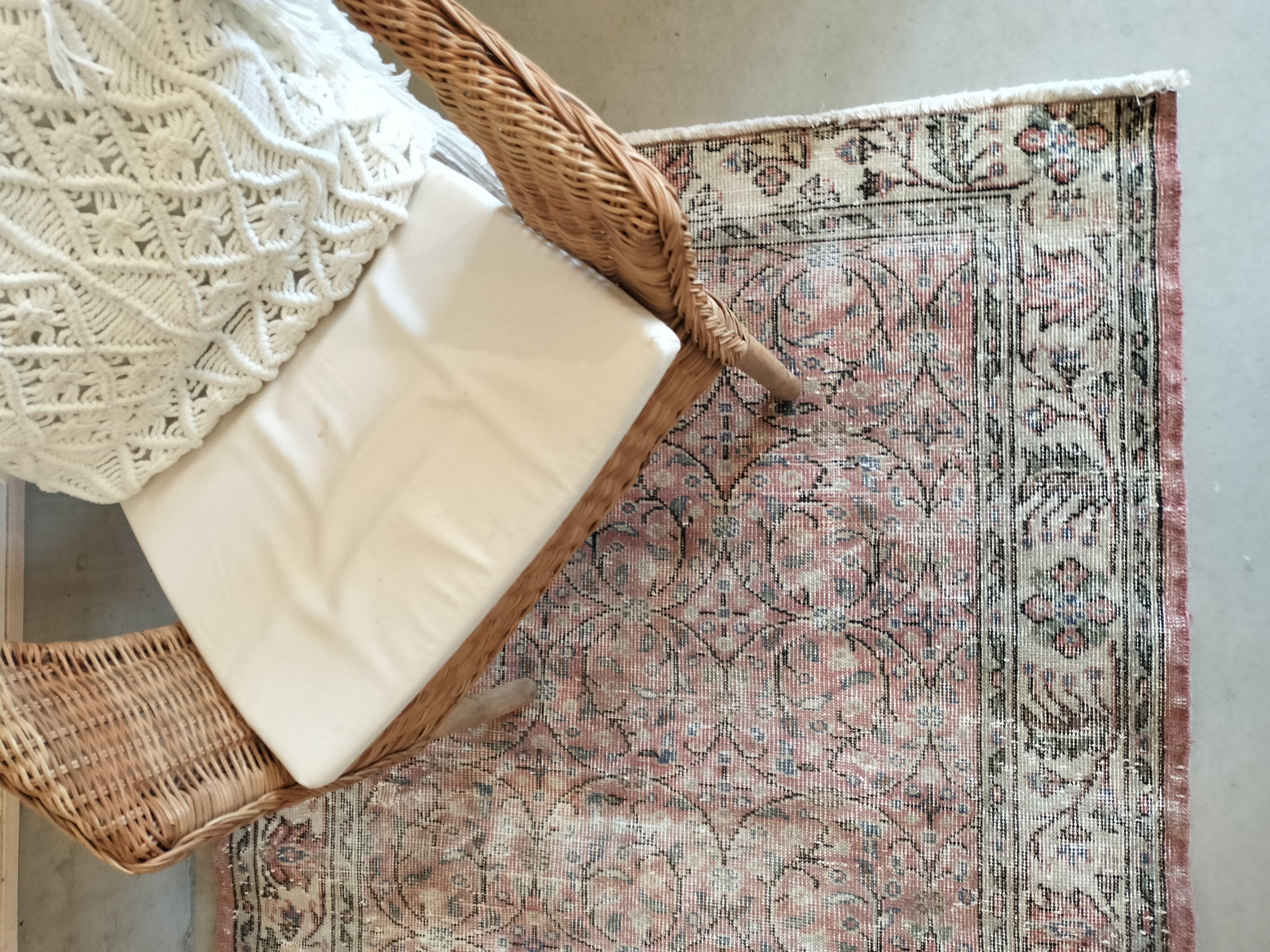 落ち着いたローズピンクに全体にフラワー柄の入る上品なトルコラグ。花にはグレイッシュブルーが入り、アクセントに。囲みののベージュも美しいです。