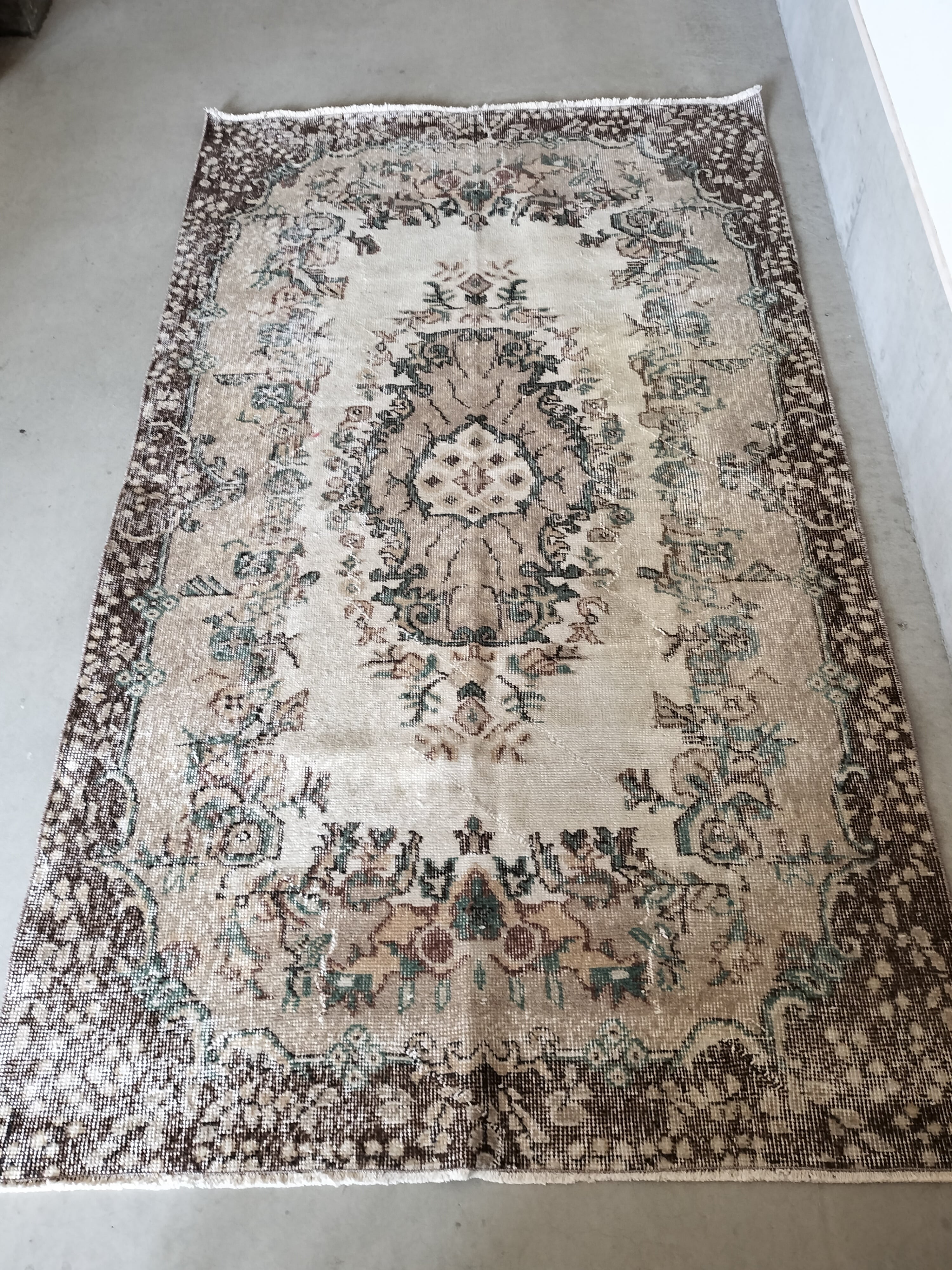 外側からブラウン、カフェオレ、ベージュのベースにくすみグリーンがアクセントに入るヴィンテージトルコラグ。