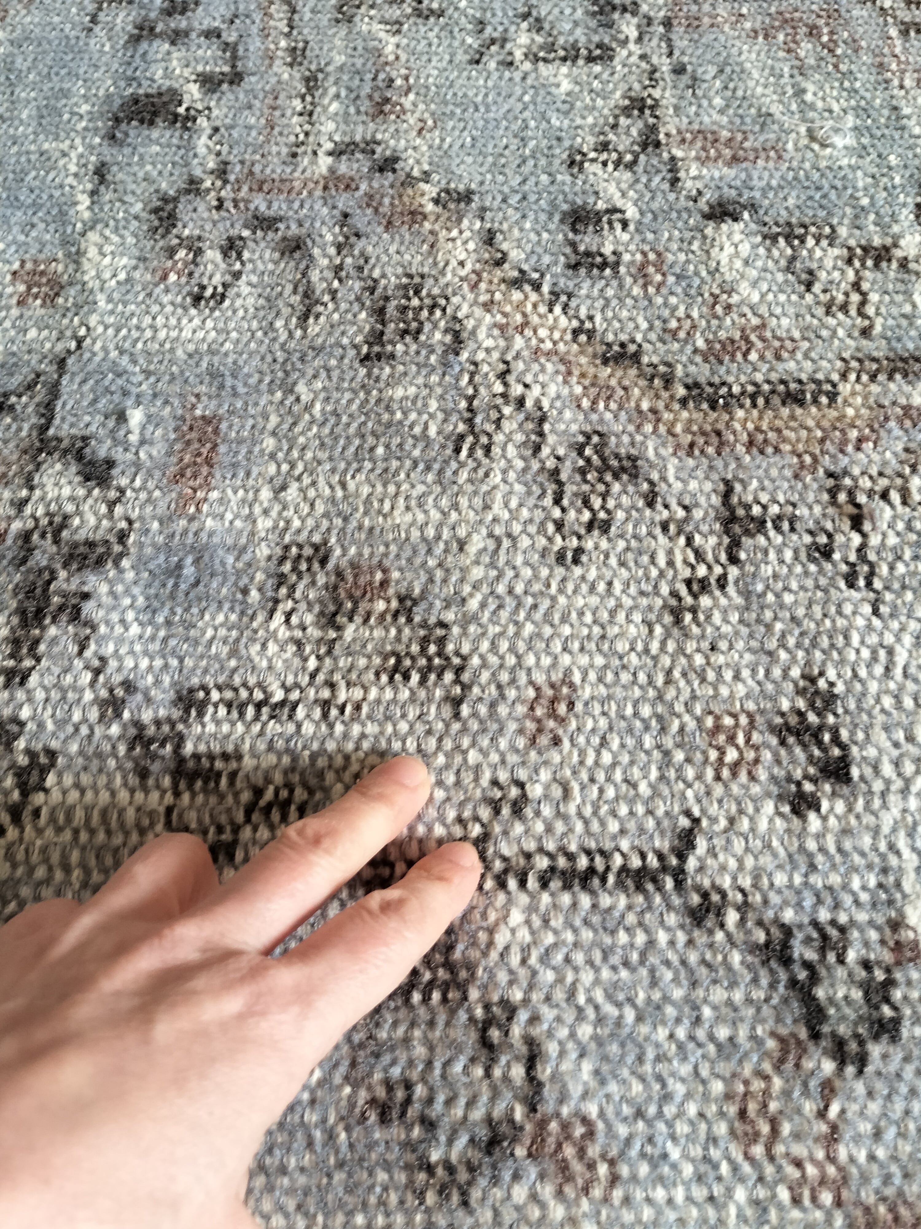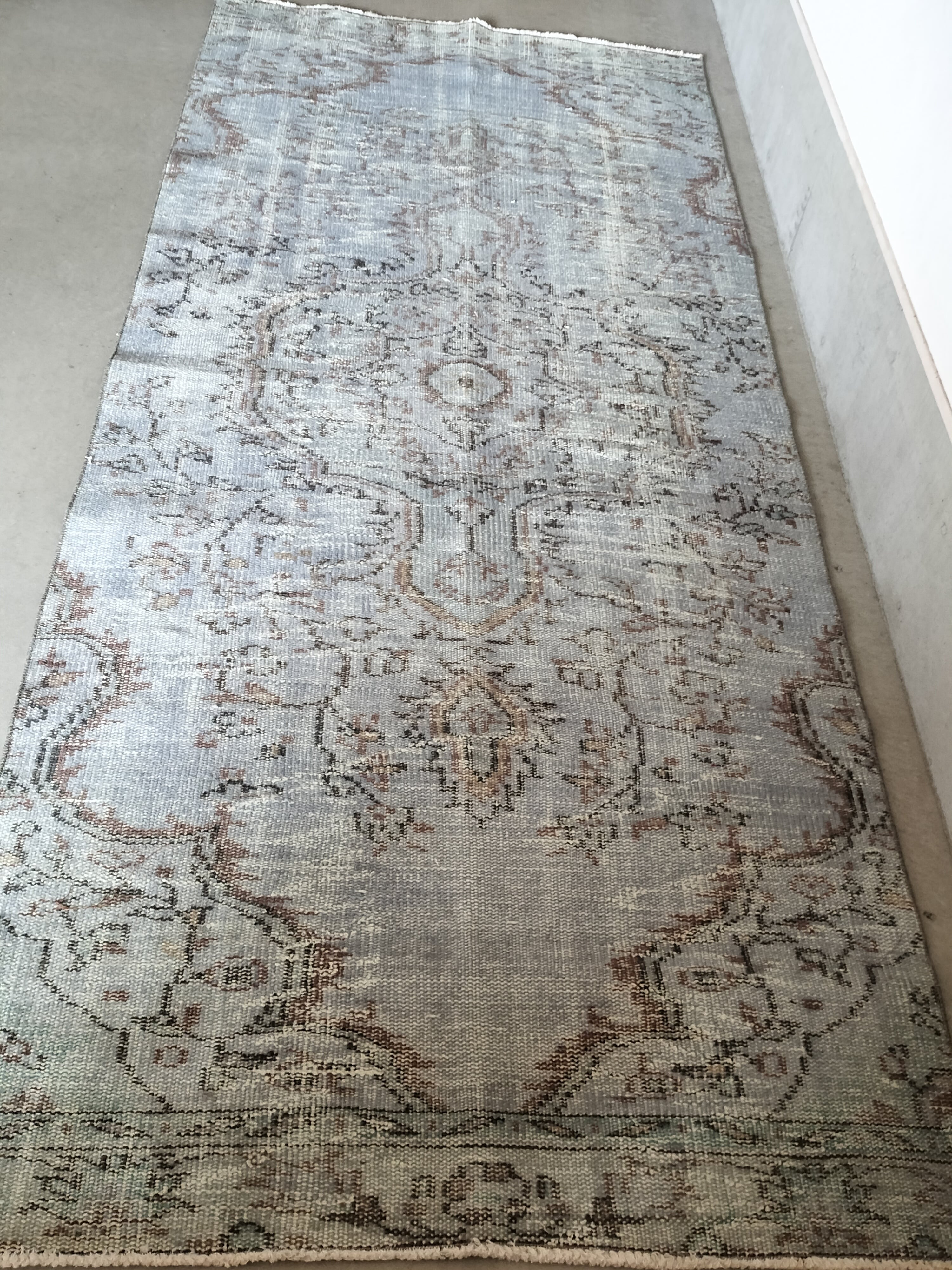 落ち着いたくすみのあるデニムのようなライトブルーにブラウンや焦げ茶でシックにメダリオン柄が入るヴィンテージトルコラグ。