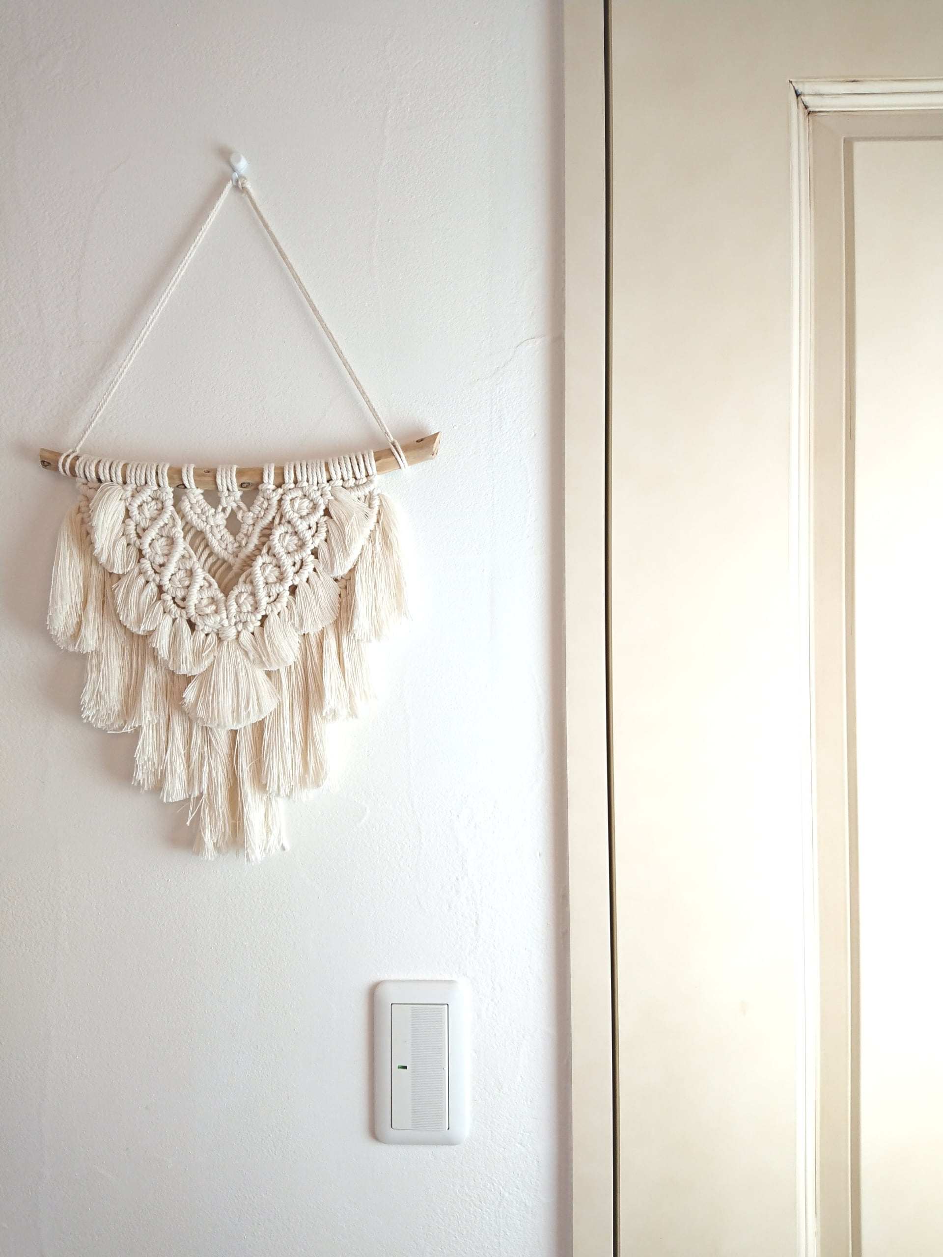 マクラメタペストリーは白系インテリアに深みを足すおすすめの品。