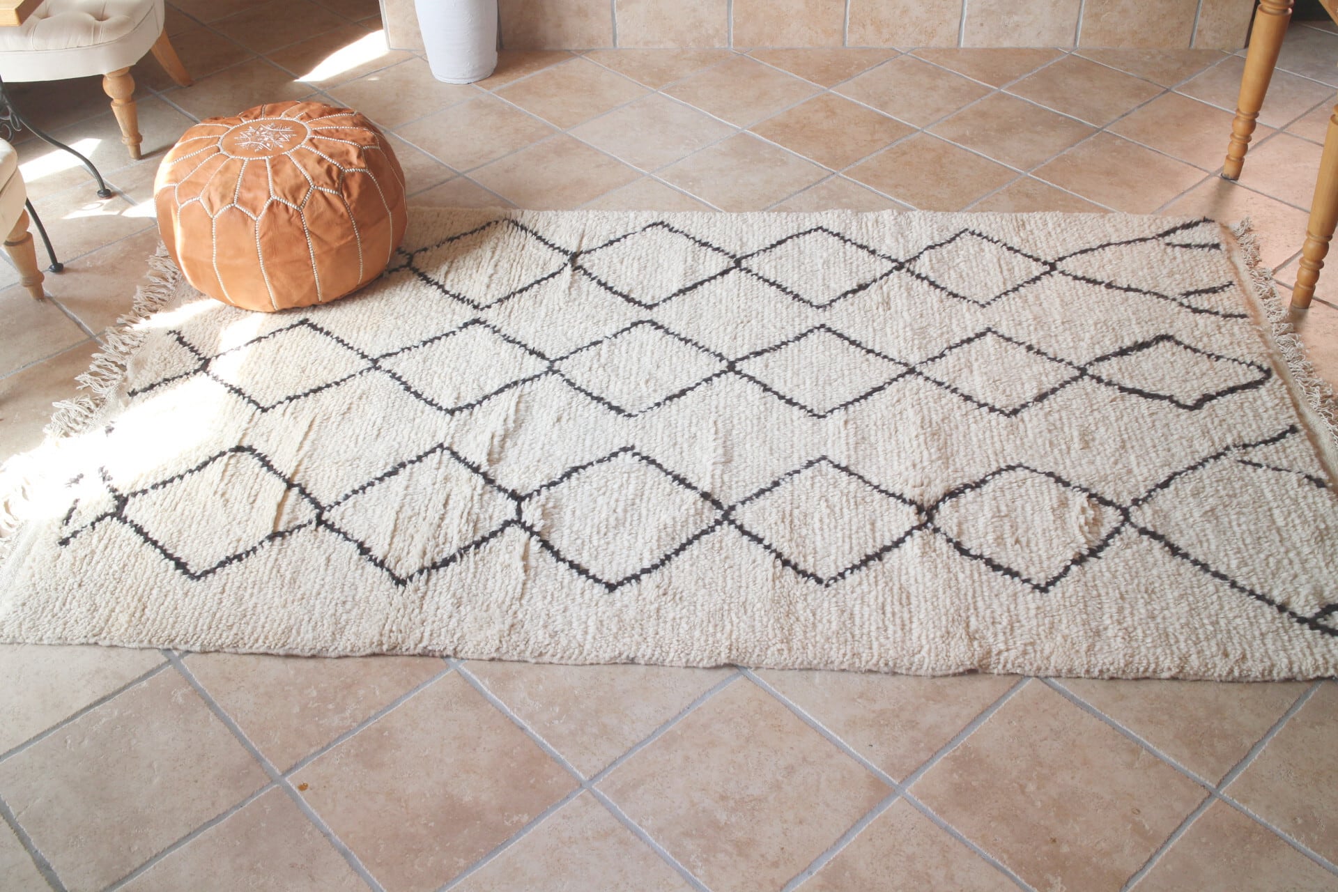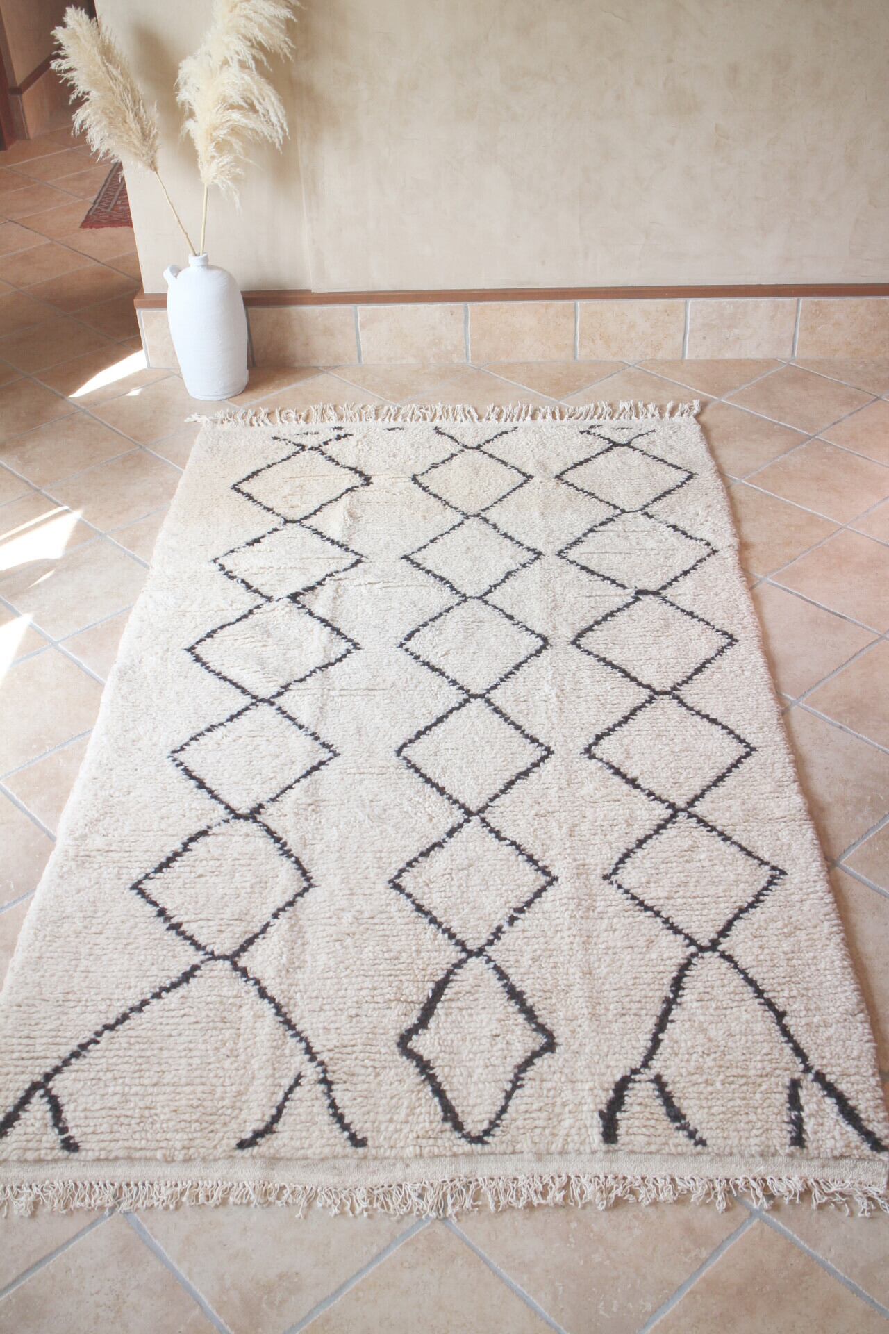 少し端が変形したダイヤ柄で、プリミティブな柄いきとビンテージ特有のベージュがかったベースの色味でBOHOインテリアによく合うかっこ良いラグになっています。