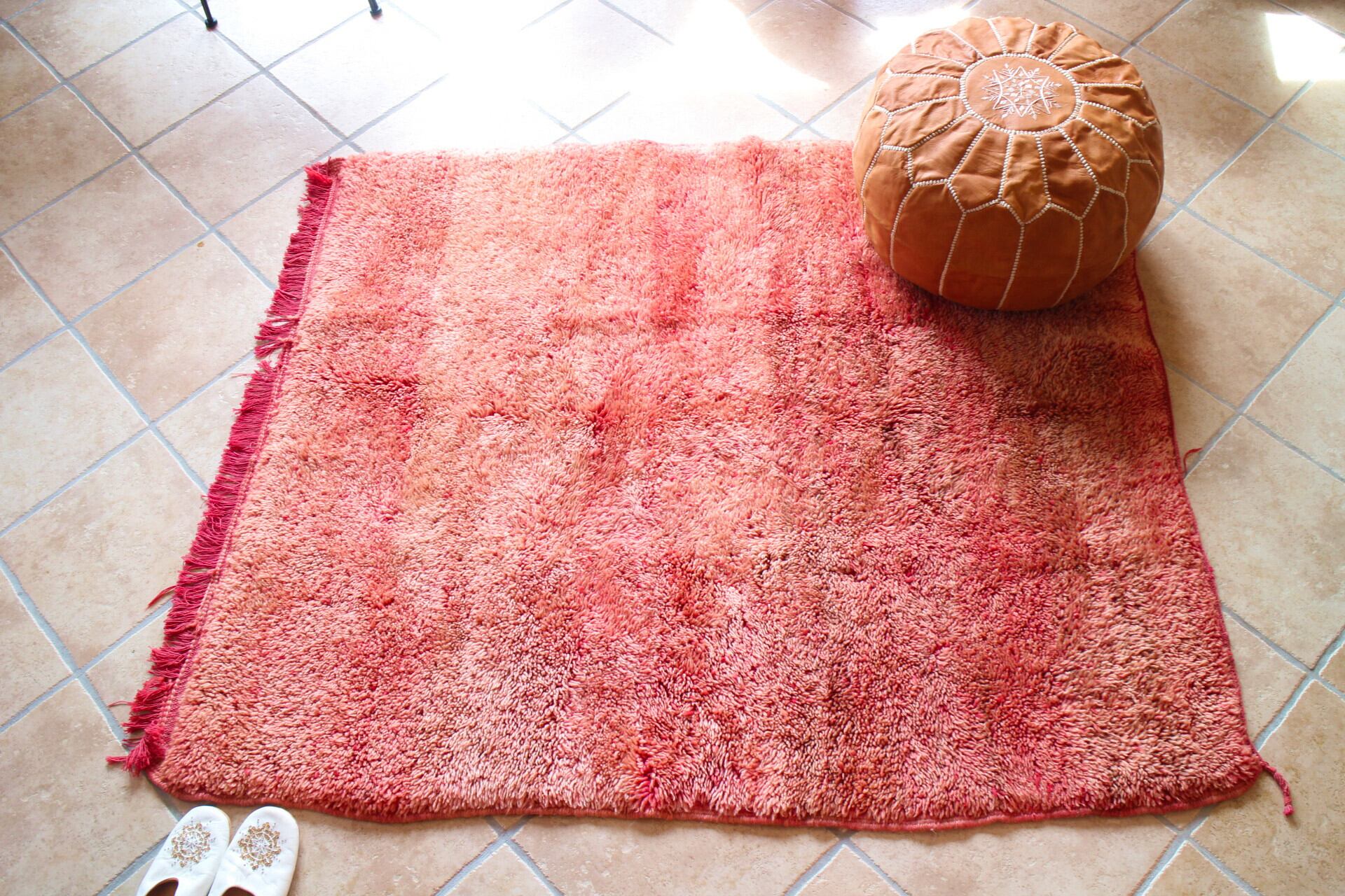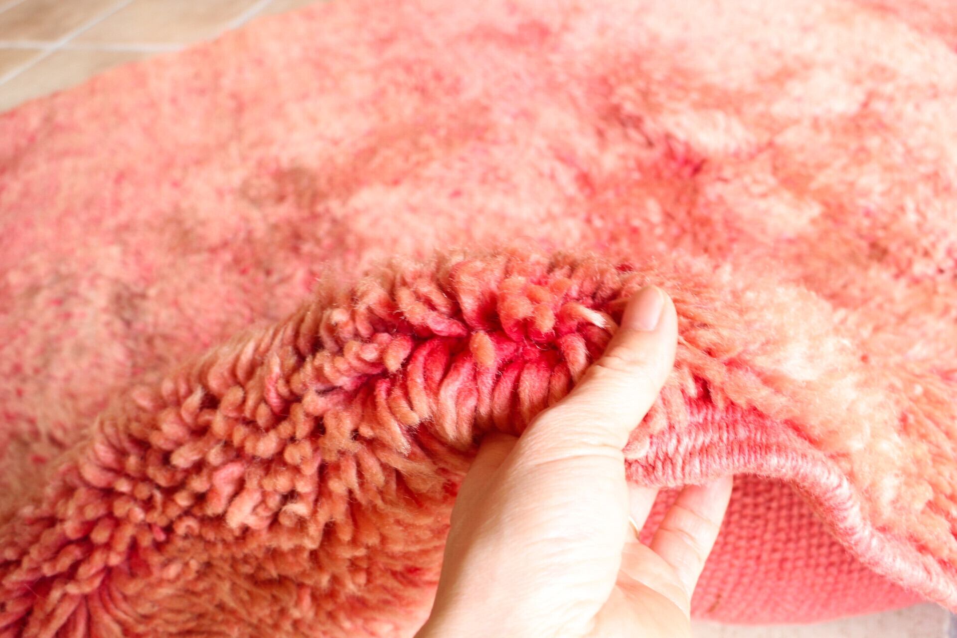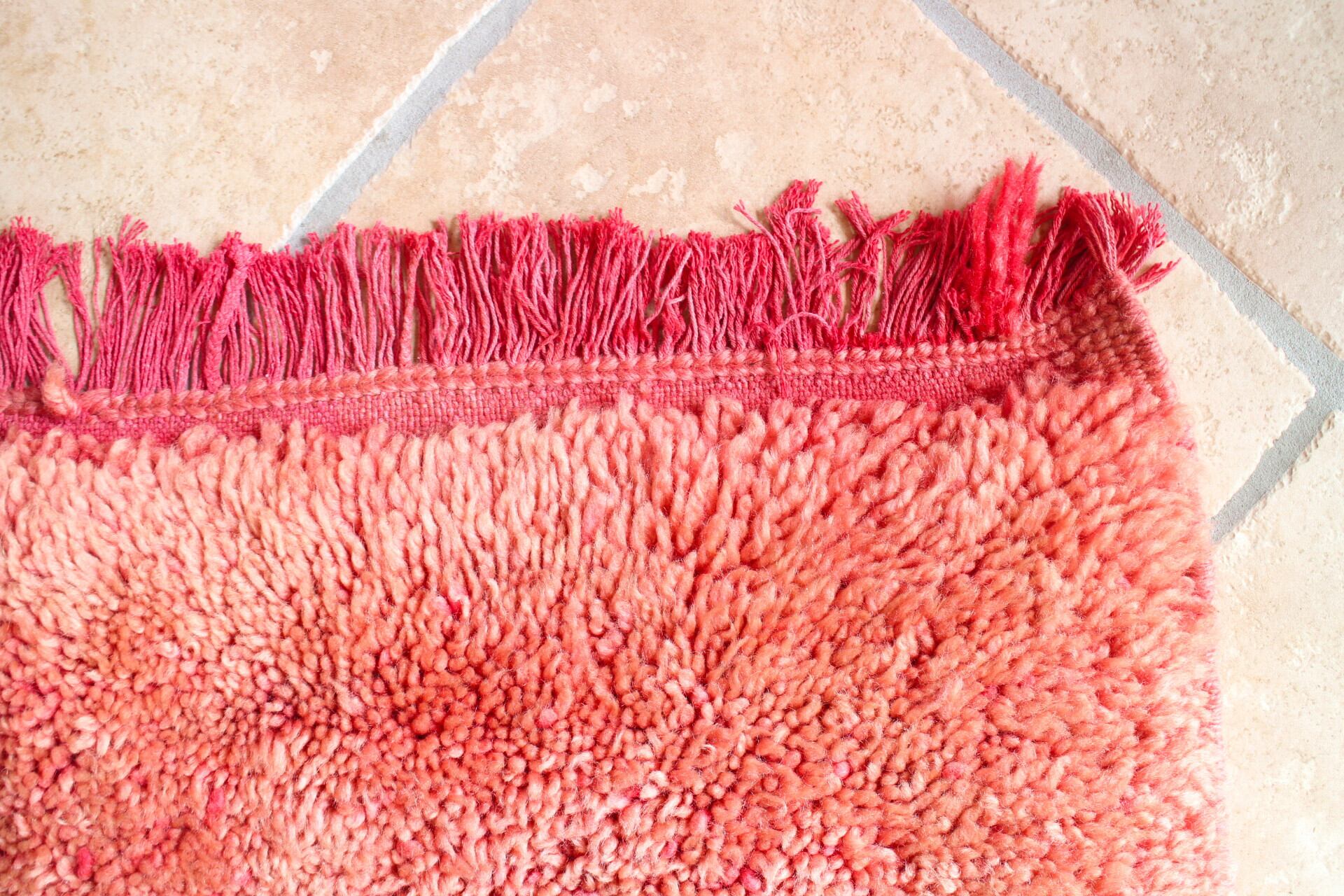 白味がかった赤や茶色がかった赤など、単色とはいって様々な赤が入り交じり、美しいラグです。毛足は長く厚みも2.5cmほどで、もふもふの贅沢な敷き心地。