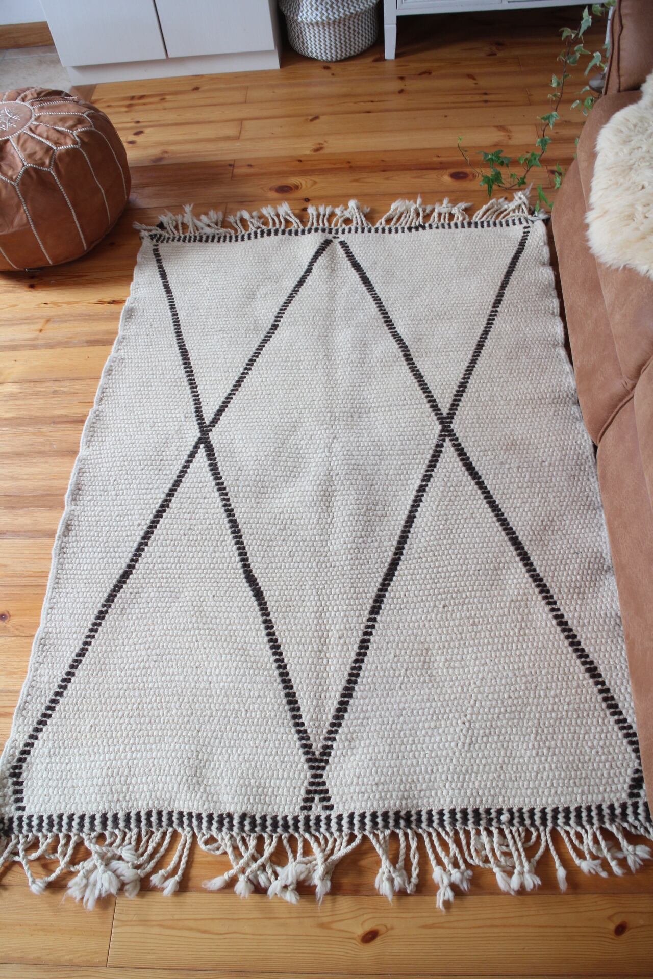 大きなダイヤ柄で、定番の焦げ茶色のラインとビンテージ特有の、ベージュがかりツヤのあるベースの色味がかっこ良いラグです。北欧インテリアにもBOHOインテリアにも合いそうです。