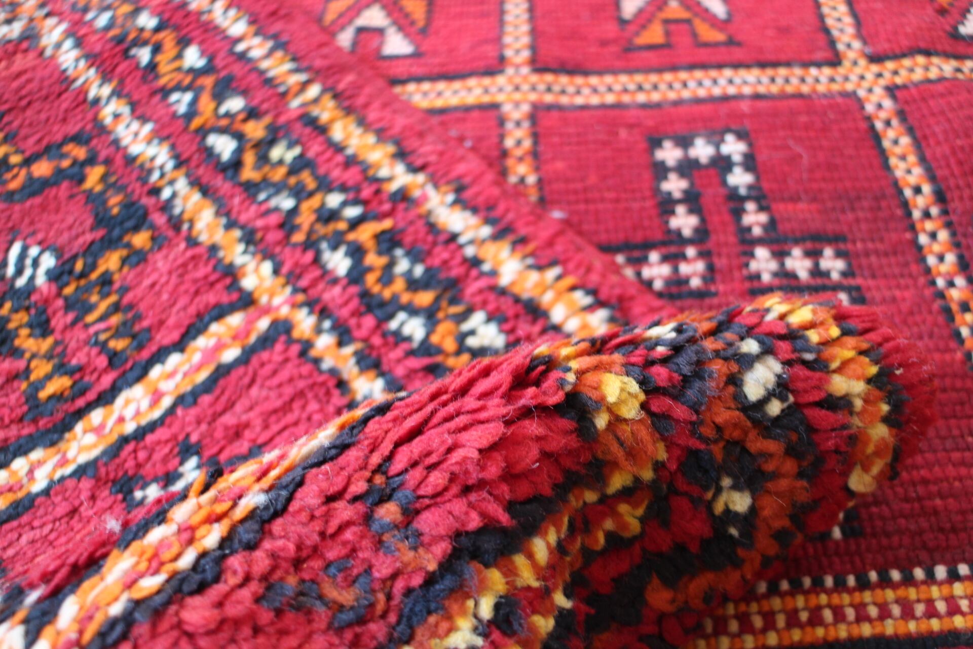 ただし、モロッコラグの特徴として羊毛に髪の毛のような黒い繊維が混じったり、固い草の繊維のようなものや、カラフルな小さなビニールが混じることがあります。