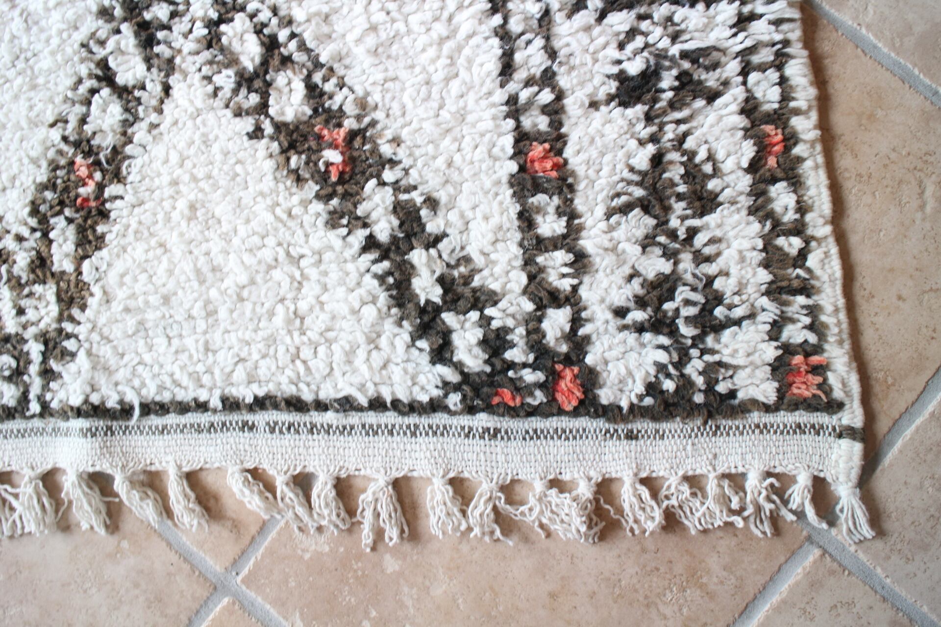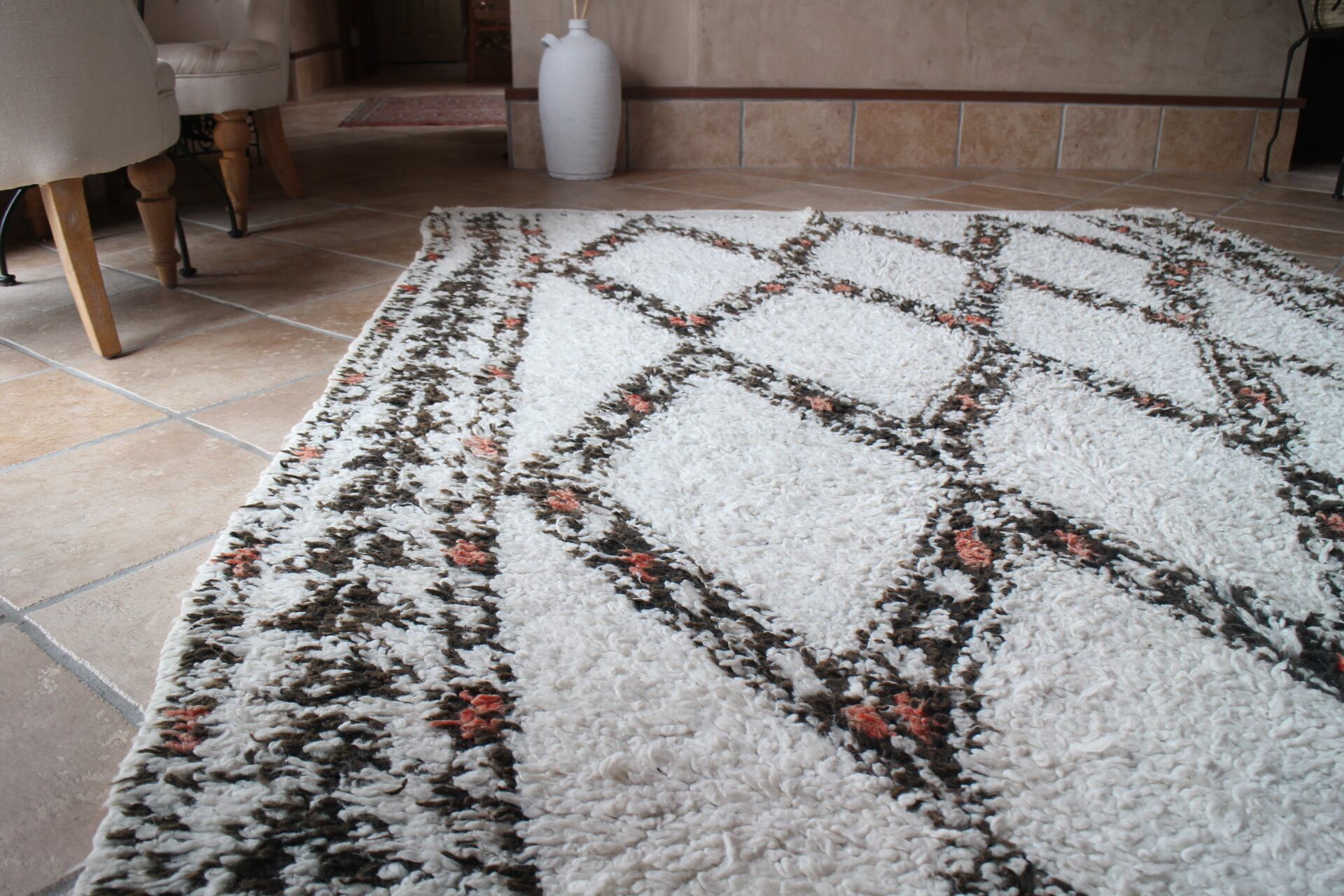 ただし、モロッコラグの特徴として羊毛に髪の毛のような黒い繊維が混じったり、固い草の繊維のようなものや、カラフルな小さなビニールが混じることがあります。