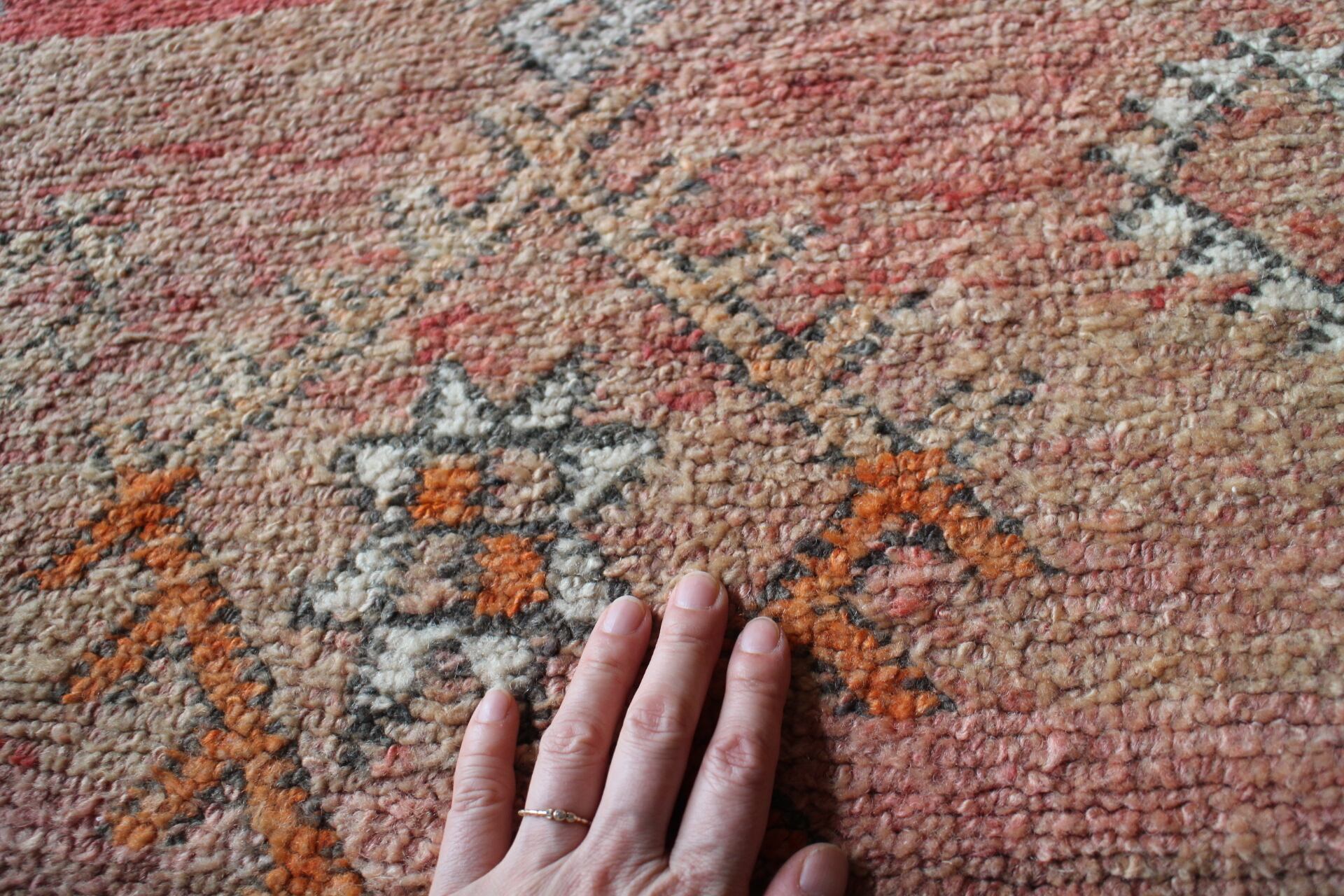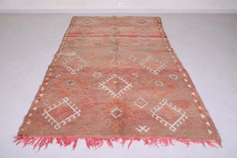 ボーホーインテリアによく合うプリミティブな柄が魅力的なラグ。ベルベル民族特有の模様が入り、モロッコラグならではのトライバルな雰囲気です。修復をしながら大切に受け継がれたヴィンテージラグです。修復の跡が2箇所ありますので最後のお写真2枚をご確認ください。