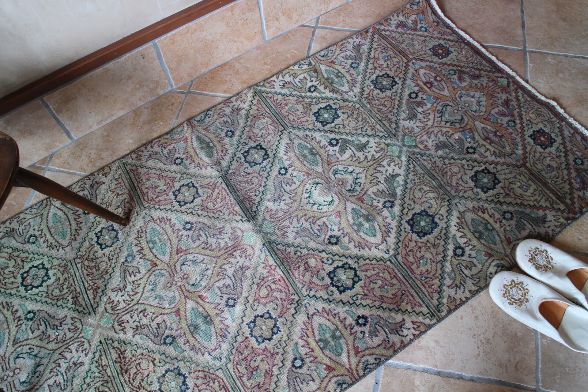 少しエスニックな雰囲気のアラベスク文様が素敵なくすんだグリーンのラグ。ベースのくすみグリーンに紫や濃いエメラルドグリーンが総柄で入り上品な雰囲気です。