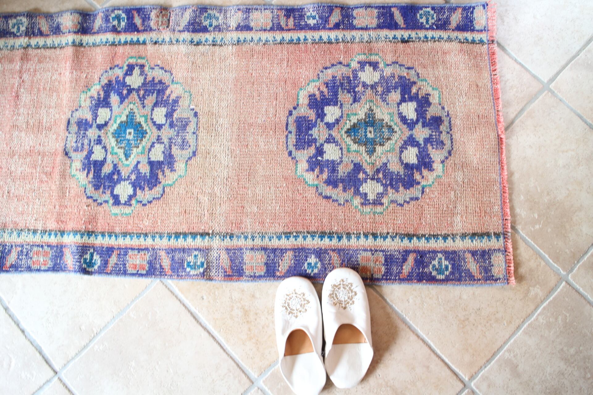 ベースのサーモンピンクにロイヤルブルーのメダリオンが映えます。お部屋の少し寂しいスペースに、廊下に、チェアに。小さめのラグですので移動も楽らく、いろいろな場所で目を楽しませてくれそう。