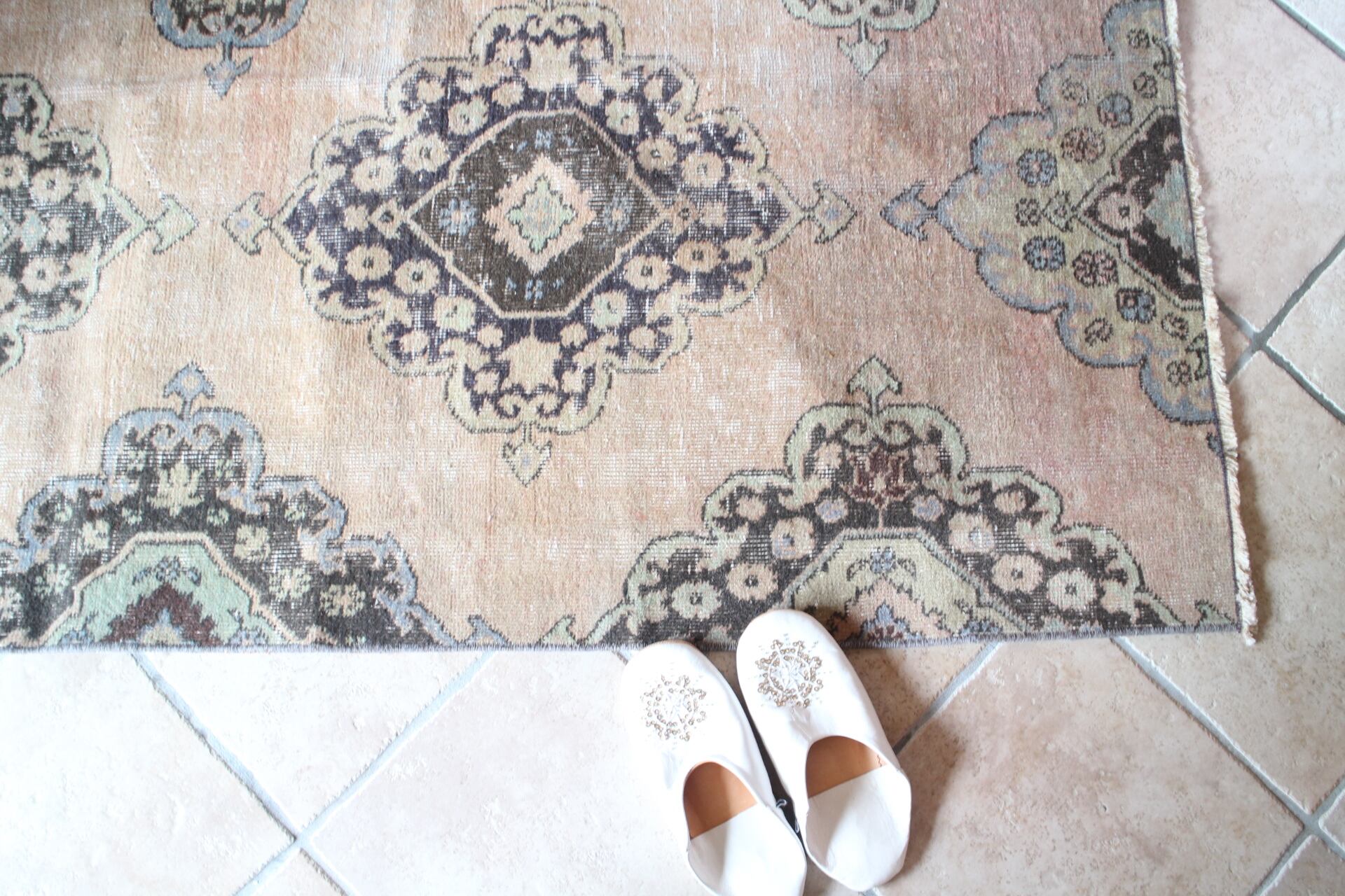 全体的にメダリオンが配置されたヴィンテージラグ。全体的に経年変化のすれが少し入り時を超えてきた良さを感じます。メダリオンの中には水色やグリーンの花が配置され、かっこいい中にもかわいさが。