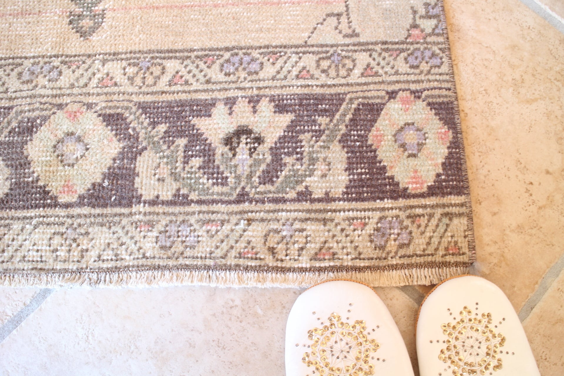 黄みがかったベージュをベースに、ブラウンやブルーグレー、淡い緑に少しだけピンクが混じった上品なラグ。