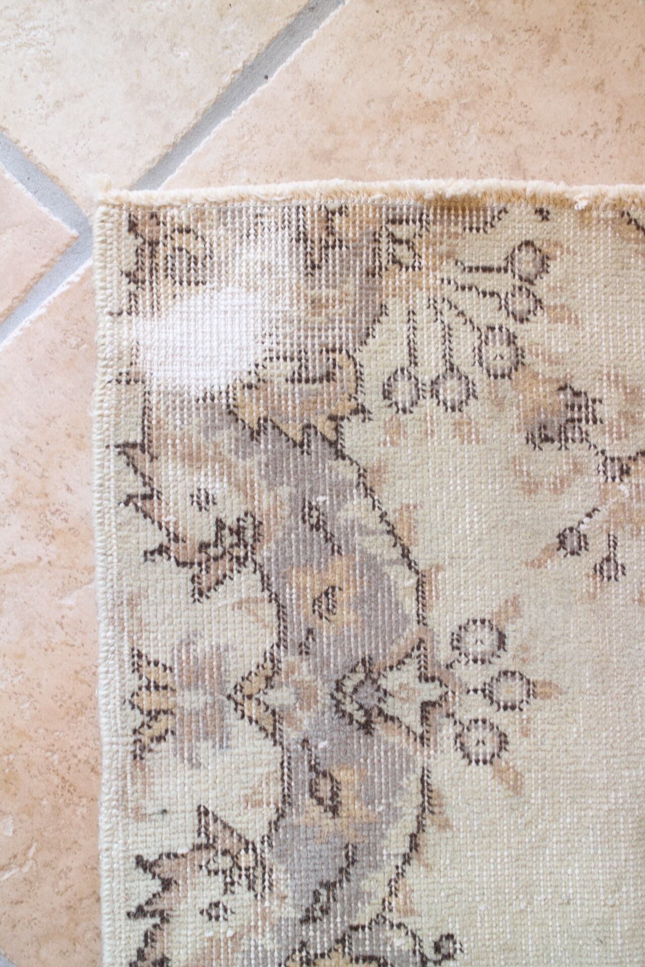 うぐいすグレーをベースとして、グレーやベージュの柄が入る、シャビーシックな印象のラグ。メダリオン柄も上品です。裏面(お写真最後)はより白っぽくっざらっとしら肌触りになり、こちらでも素敵にお使いいただけます。