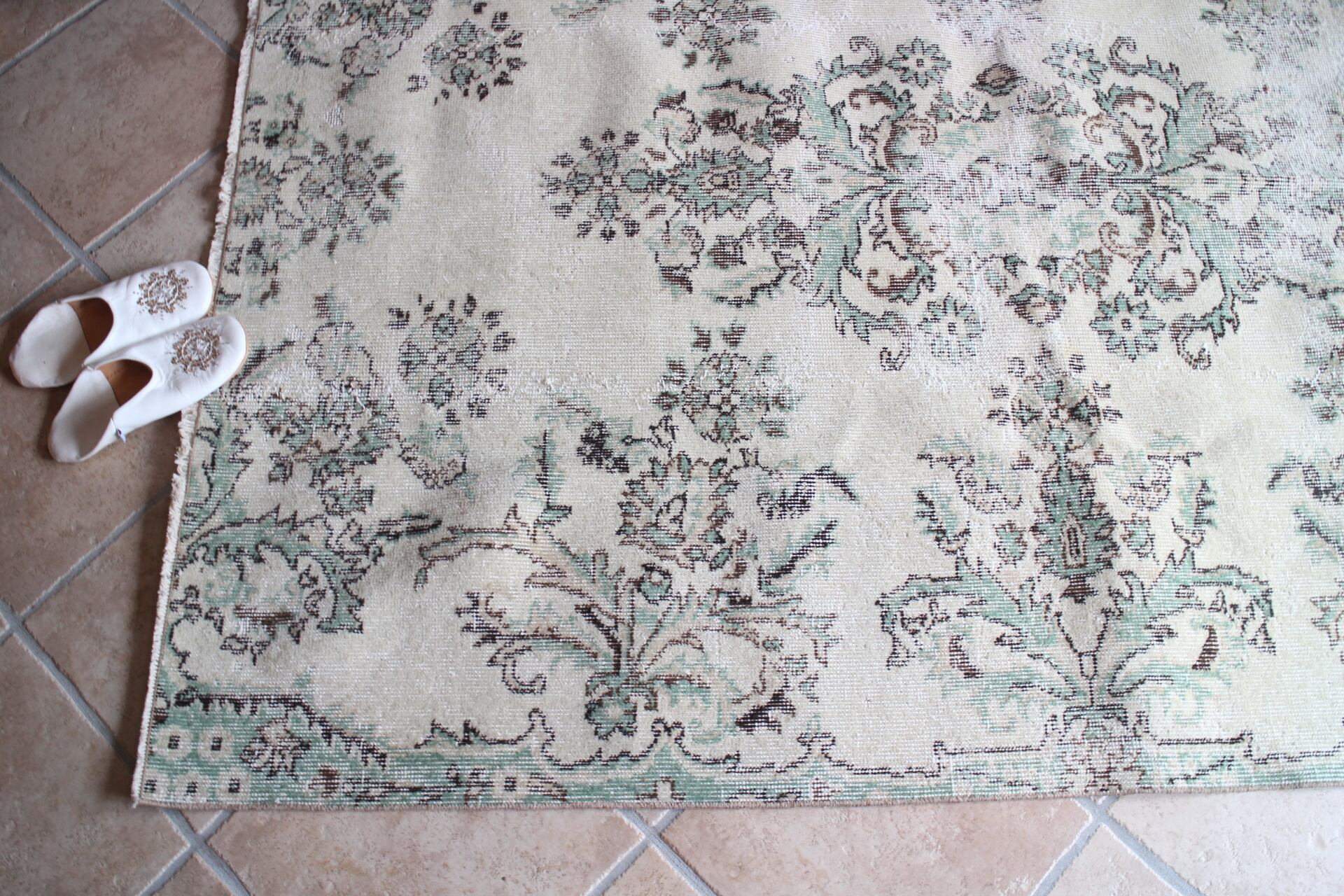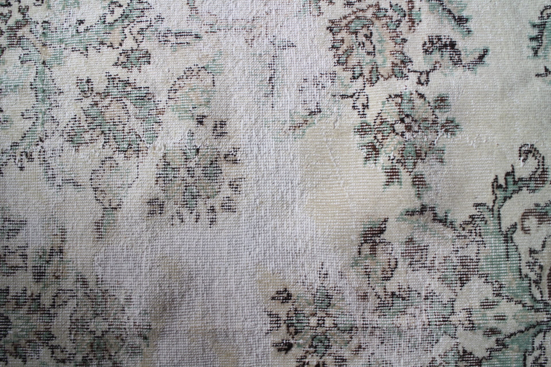 明るいベージュをベースに、ミントグリーン、ブラウン、焦げ茶でボタニカルな柄が描かれています。爽やかな色合いです。パイルが多めに擦れた部分があり、60年という長い時を経てきたヴィンテージの良さを感じさせます。