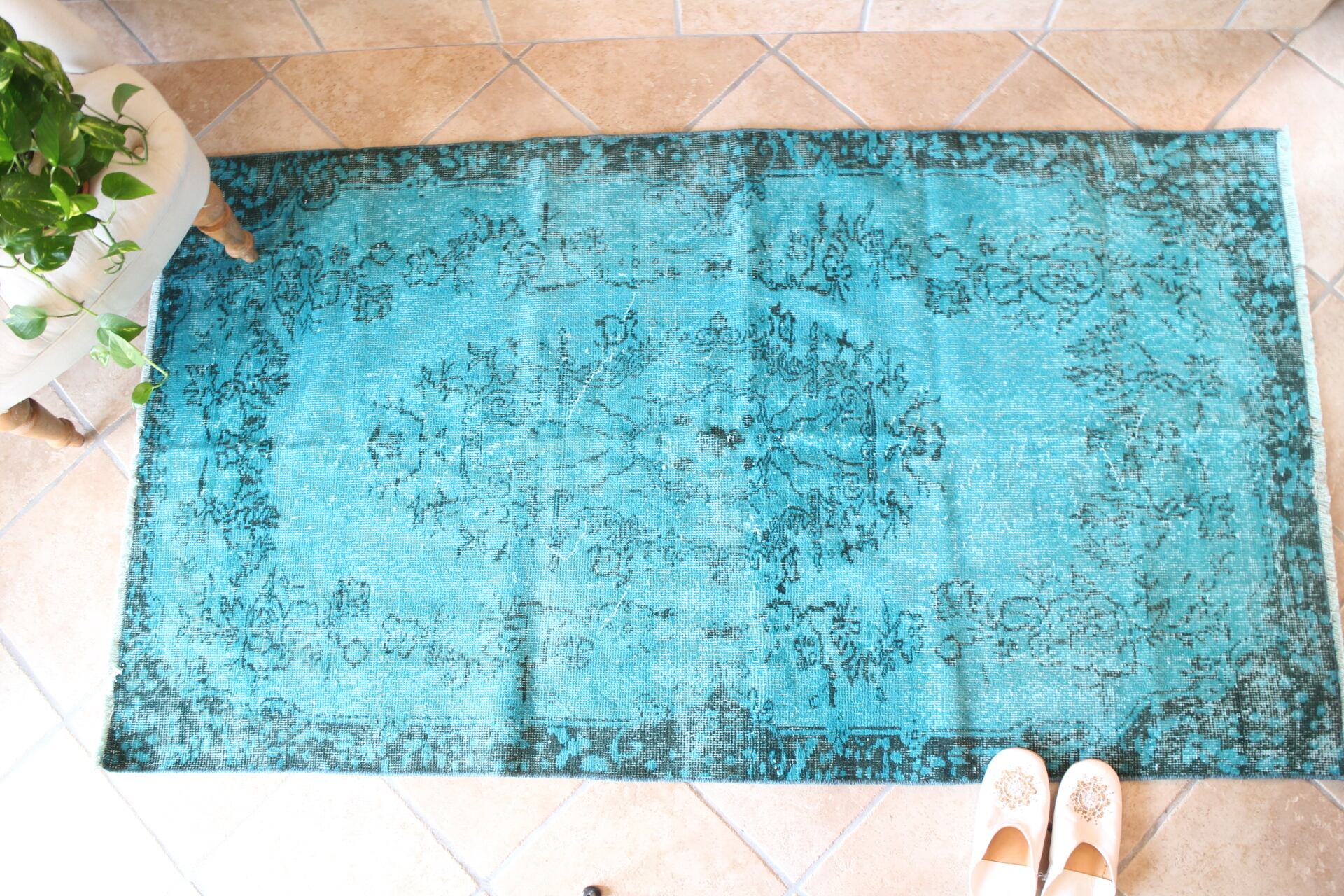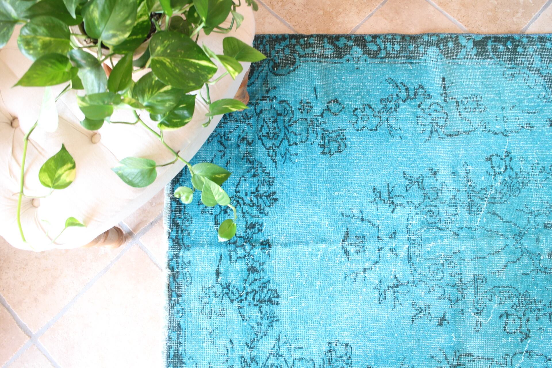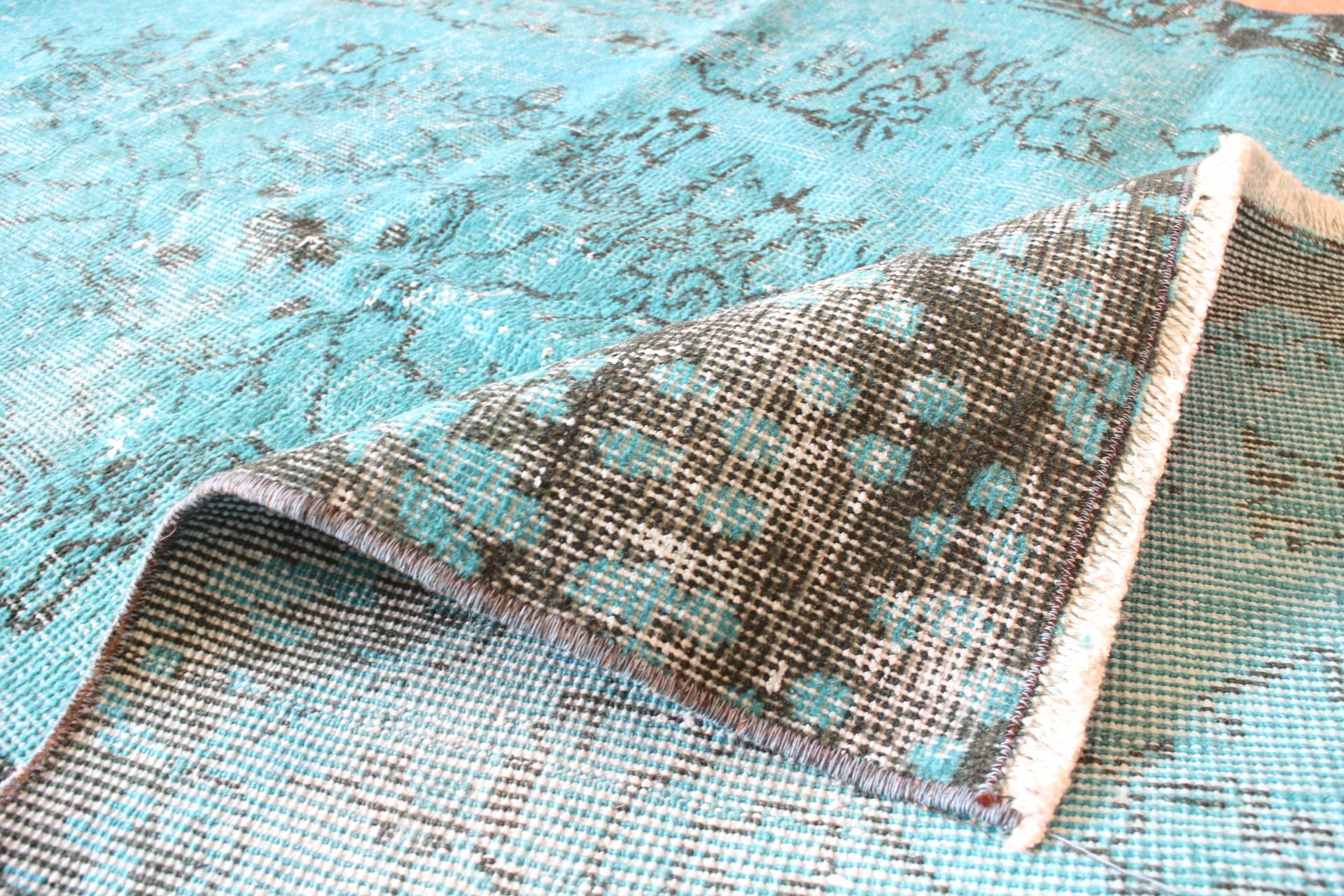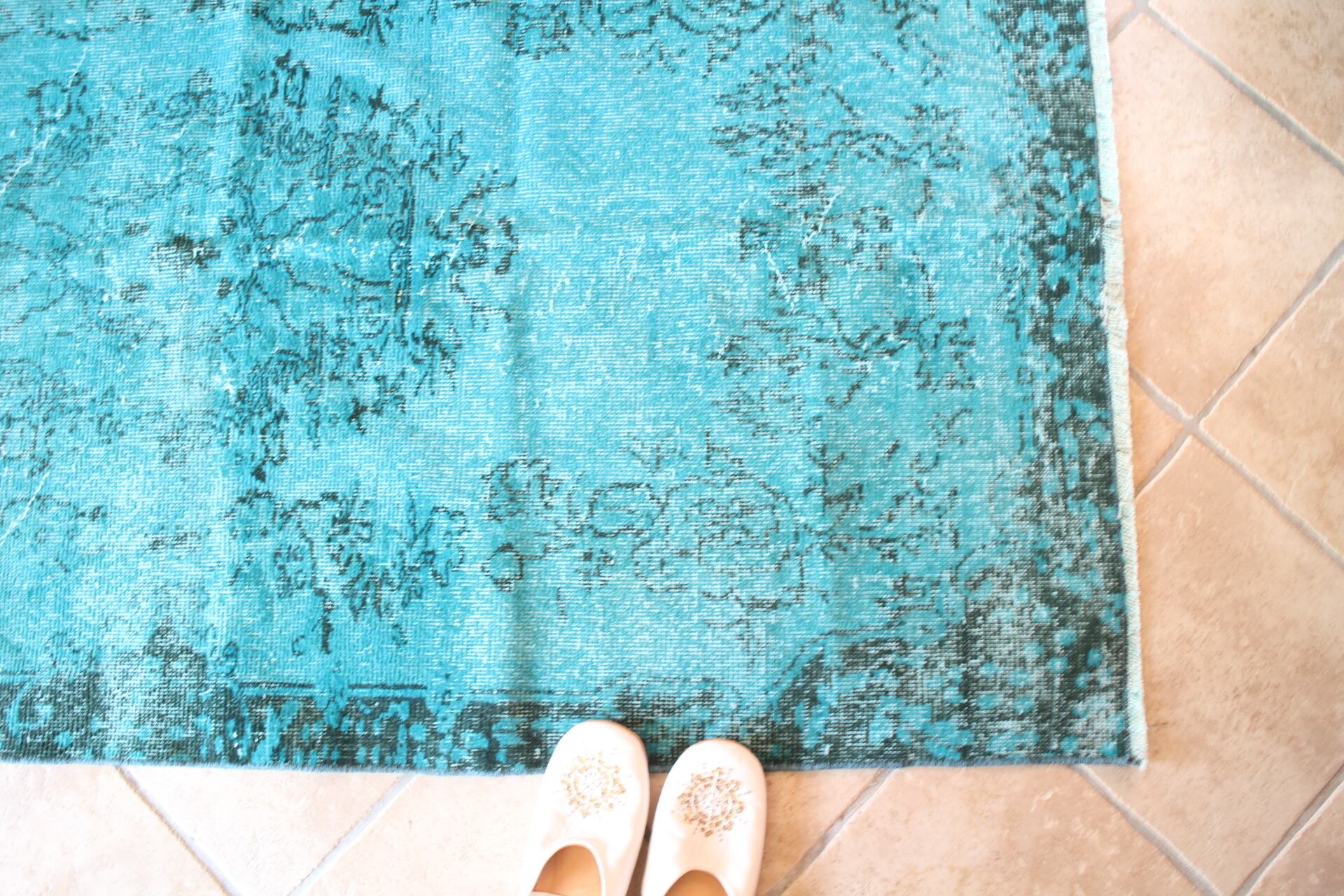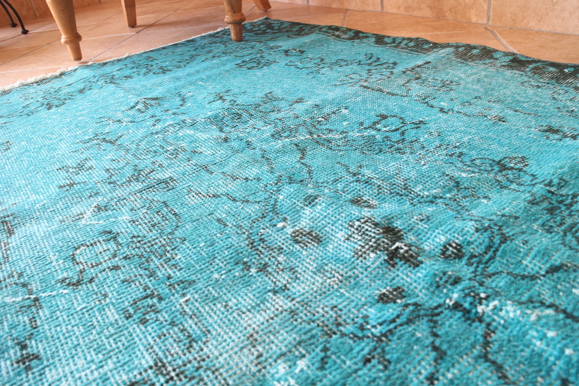 鮮やかなターコイズブルーにオーバーダイされたヴィンテージのトルコラグです。もとのメダリオンがうっすら残り、かっこいいラグに生まれ変わっています。オーバーダイラグは近年注目されるラグです。