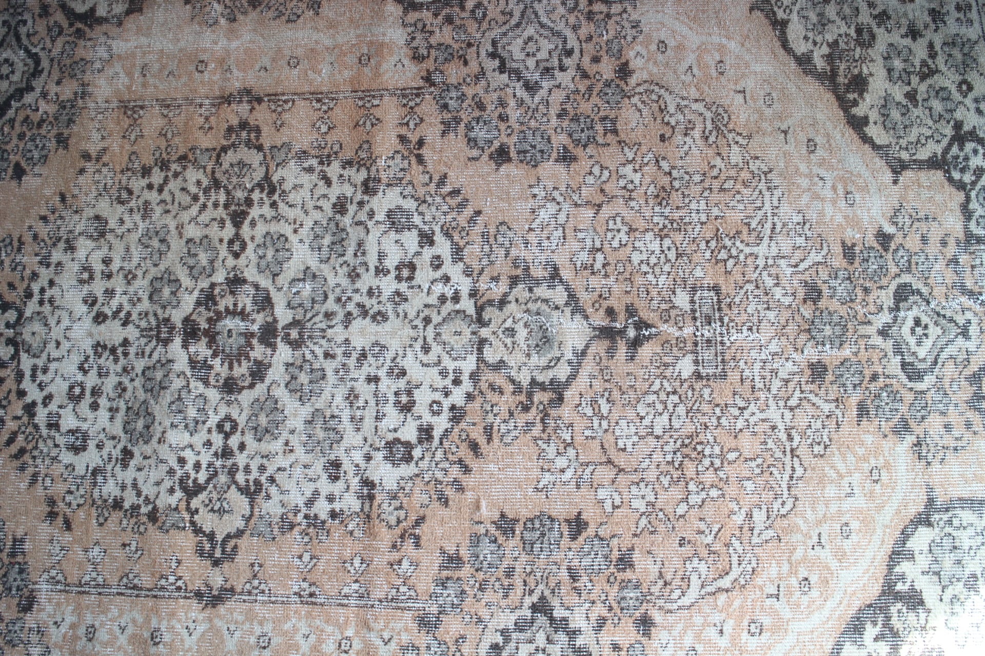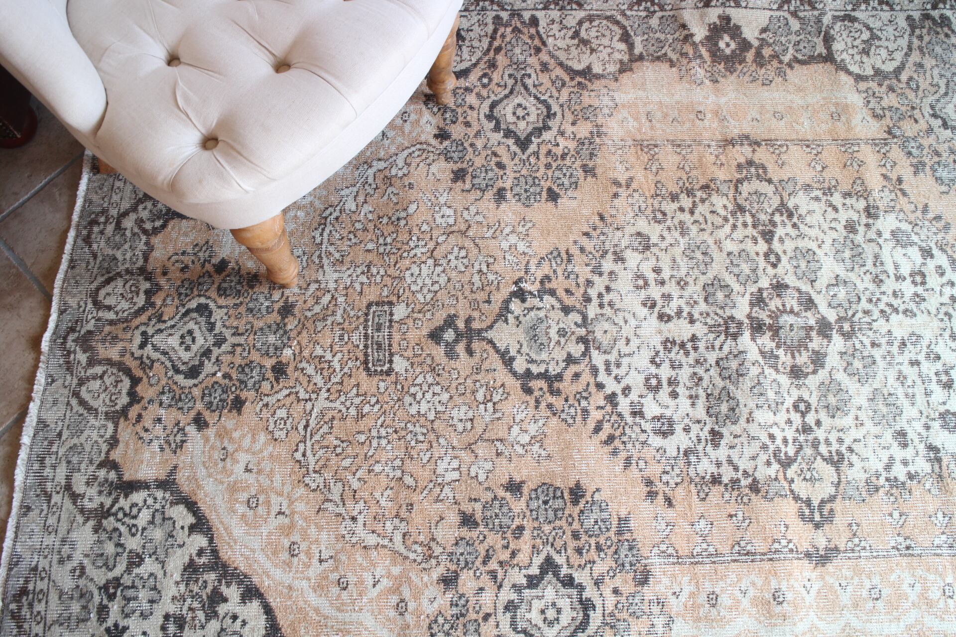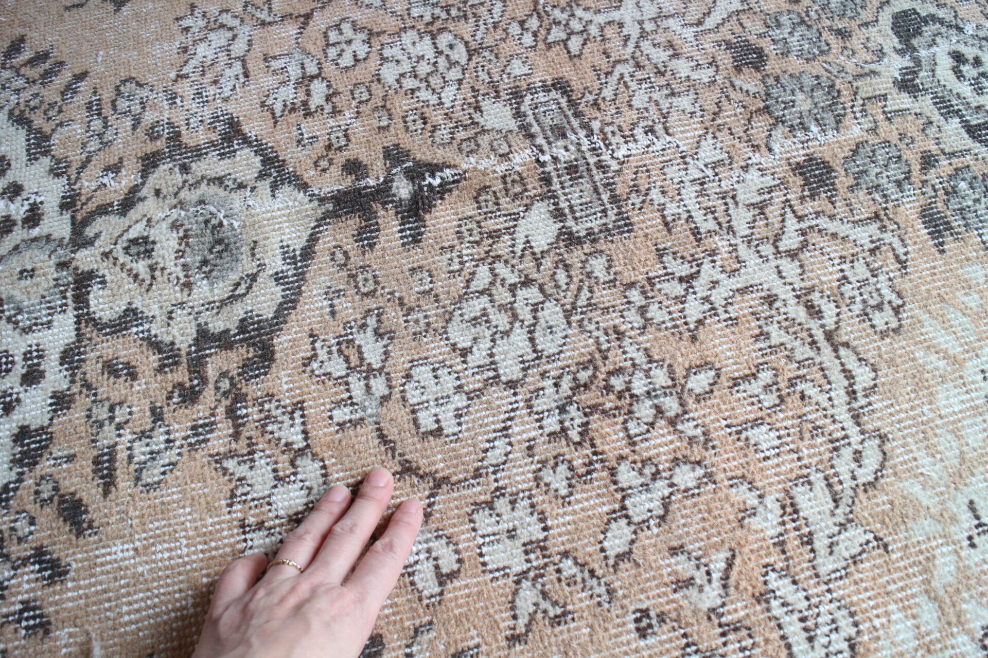 細かなフラワーの模様が全体に入り、ラグの美しさを存分に楽しめる一枚です。ベースはスモーキーなオレンジ色で、ブラウンやグレー、ベージュがまじります。大判で大きなダイニングテーブルの下や大きめソファ下などに良いサイズです。