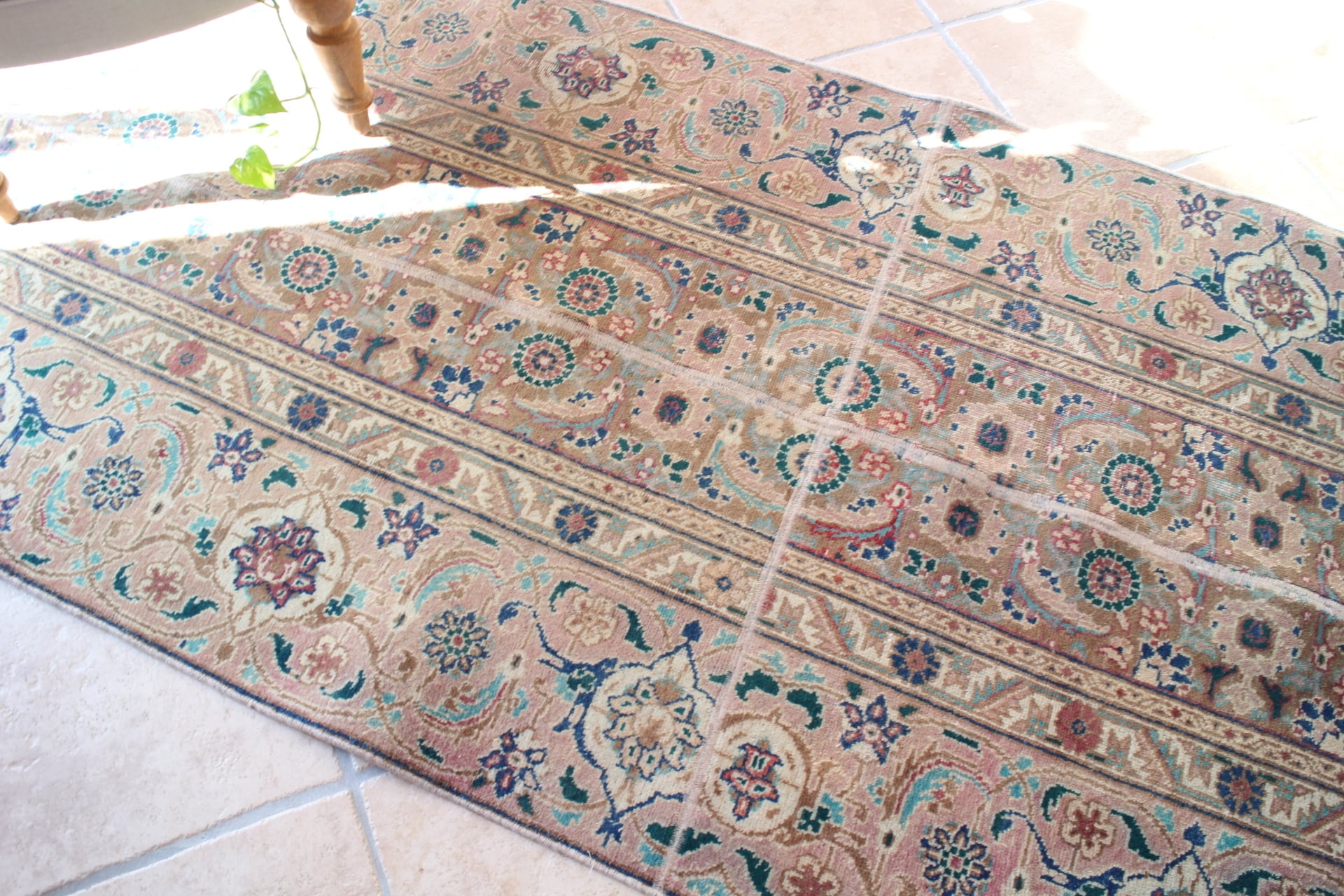 カーキやグリーンの落ち着いた色合いが素敵なランナースタイルのラグ。横に長いタイプのラグです。こちら同じ柄のラグを4枚はぎあわせたパッチワークスタイルですが、2枚目お写真の通りゆがみが少しありますのでB品としてお値段お下げして出品いたします。