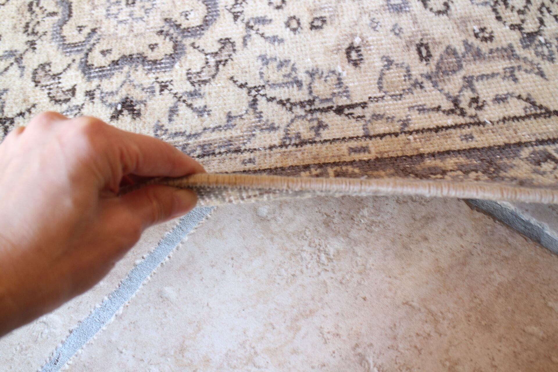 周りを囲む縁はグレー、中はベージュベースにフラワー柄が入る可憐な印象のラグです。押さえた色味はシックで様々なインテリアに合わせやすそう。