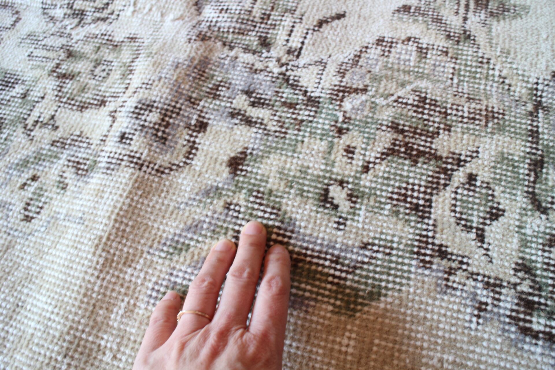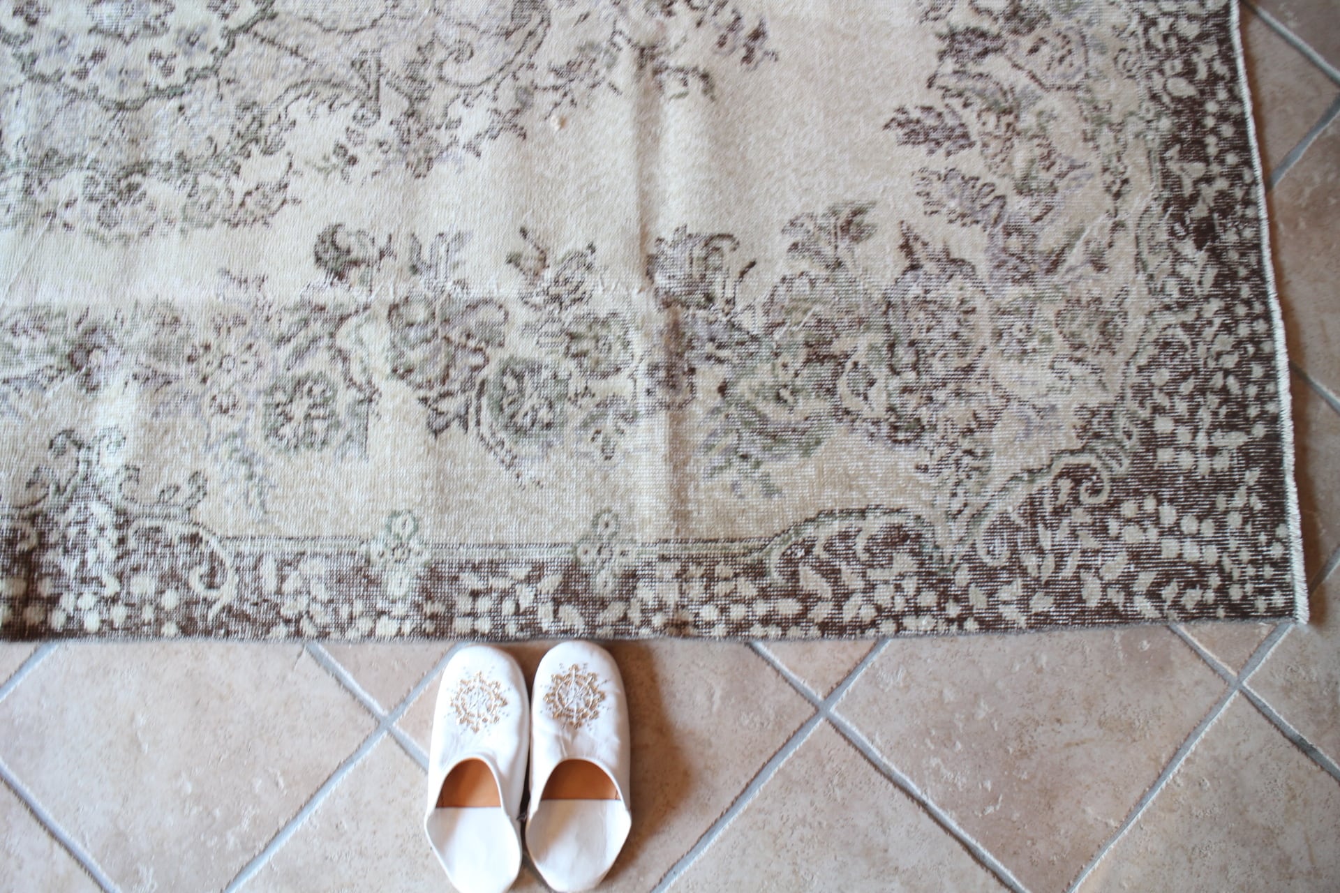 定番ながらも、色味は一枚いちまいラグによって変わってくるのですが、こちらはベースがとベージュ、縁には濃いブラウンが使われ落ち着いた印象。柄にはモスグリーンがアクセントに入り、メダリオンには繊細なフラワー柄が使われています。深い森の中を表現したようなラグです。少しの色味でだいぶ印象が変わる点もこのメダリオンラグのおもしろい所です。