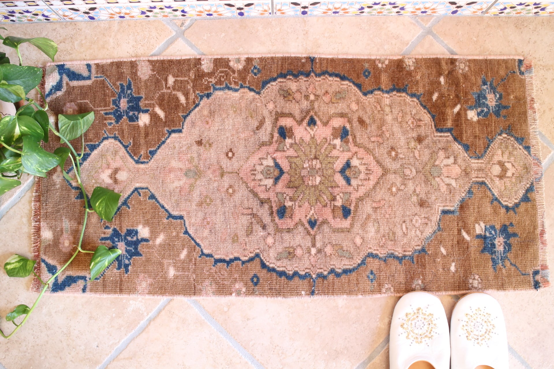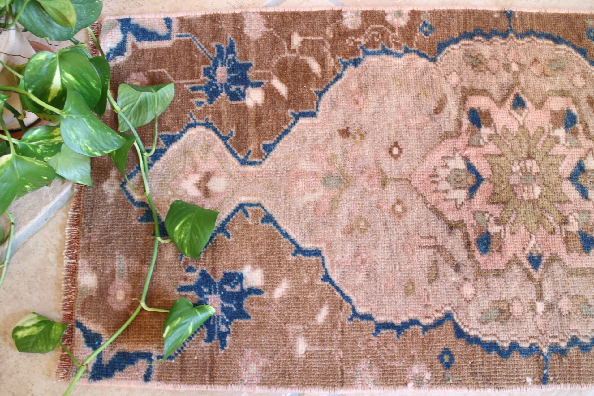 ブラウンとくすみピンクを基調としたアラビアンな雰囲気を持つスモールラグ。紺色が全体を引き締めています。一枚で大変存在感があります。