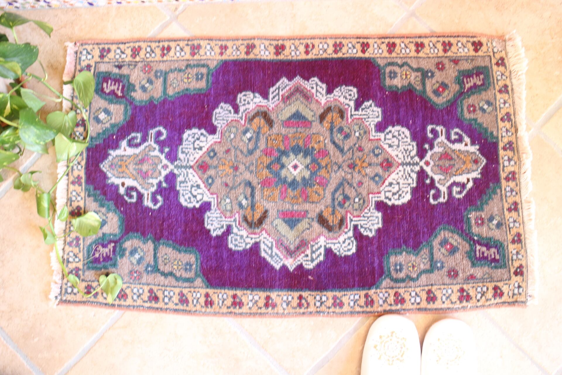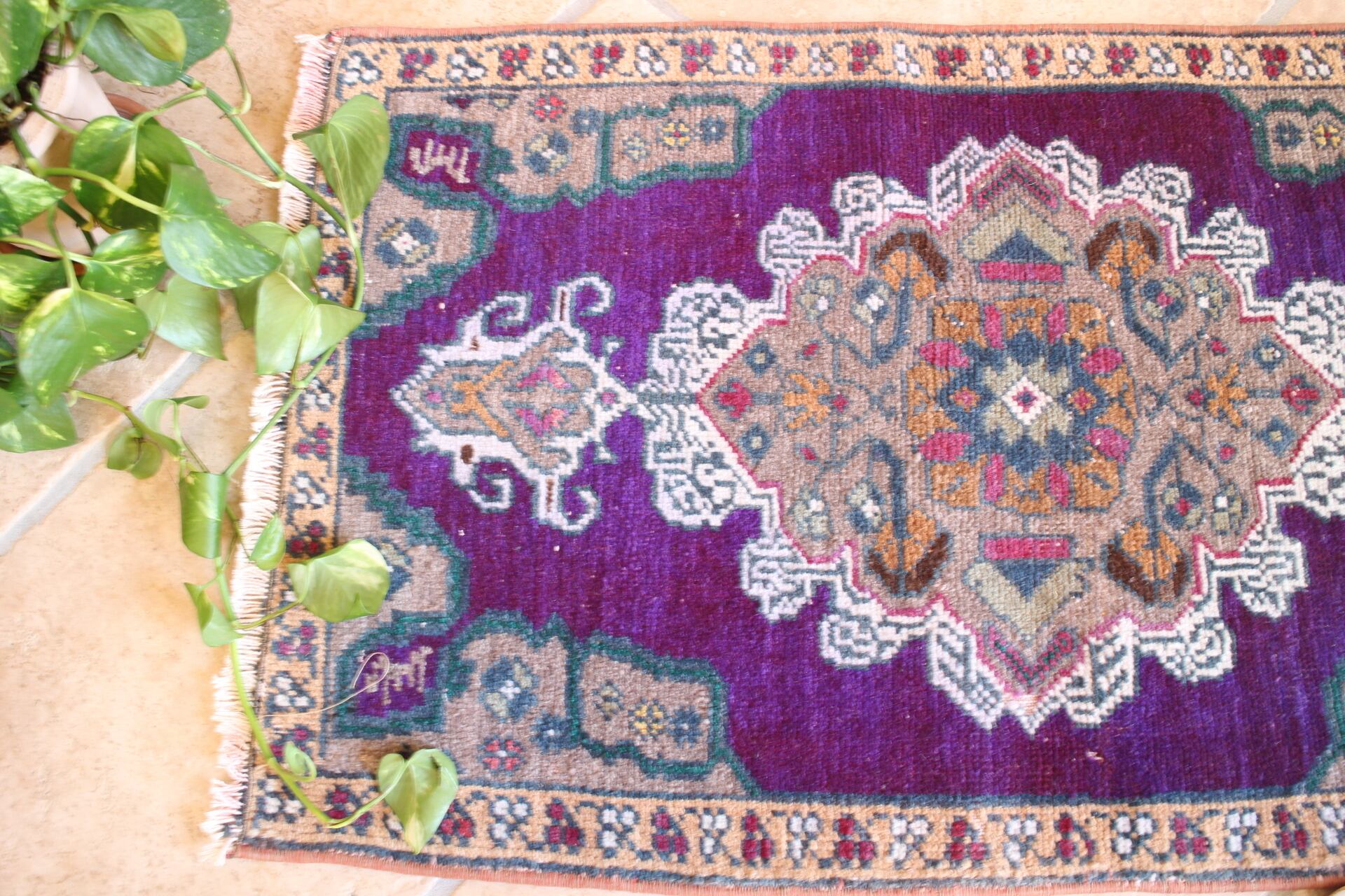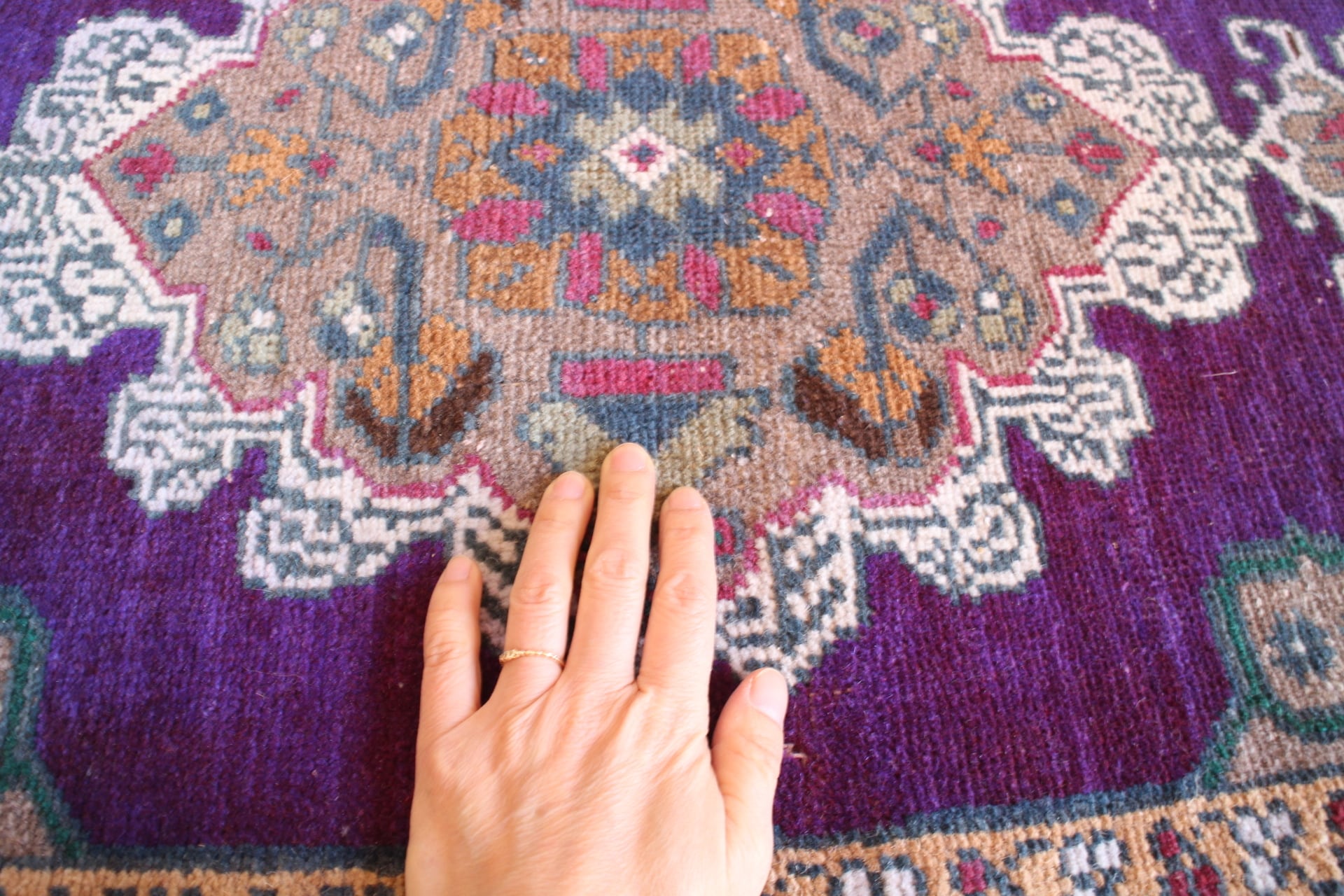 華やかな紫色を基調としたスモールラグ。縁とのコントラストがはっきりしていて印象的です。