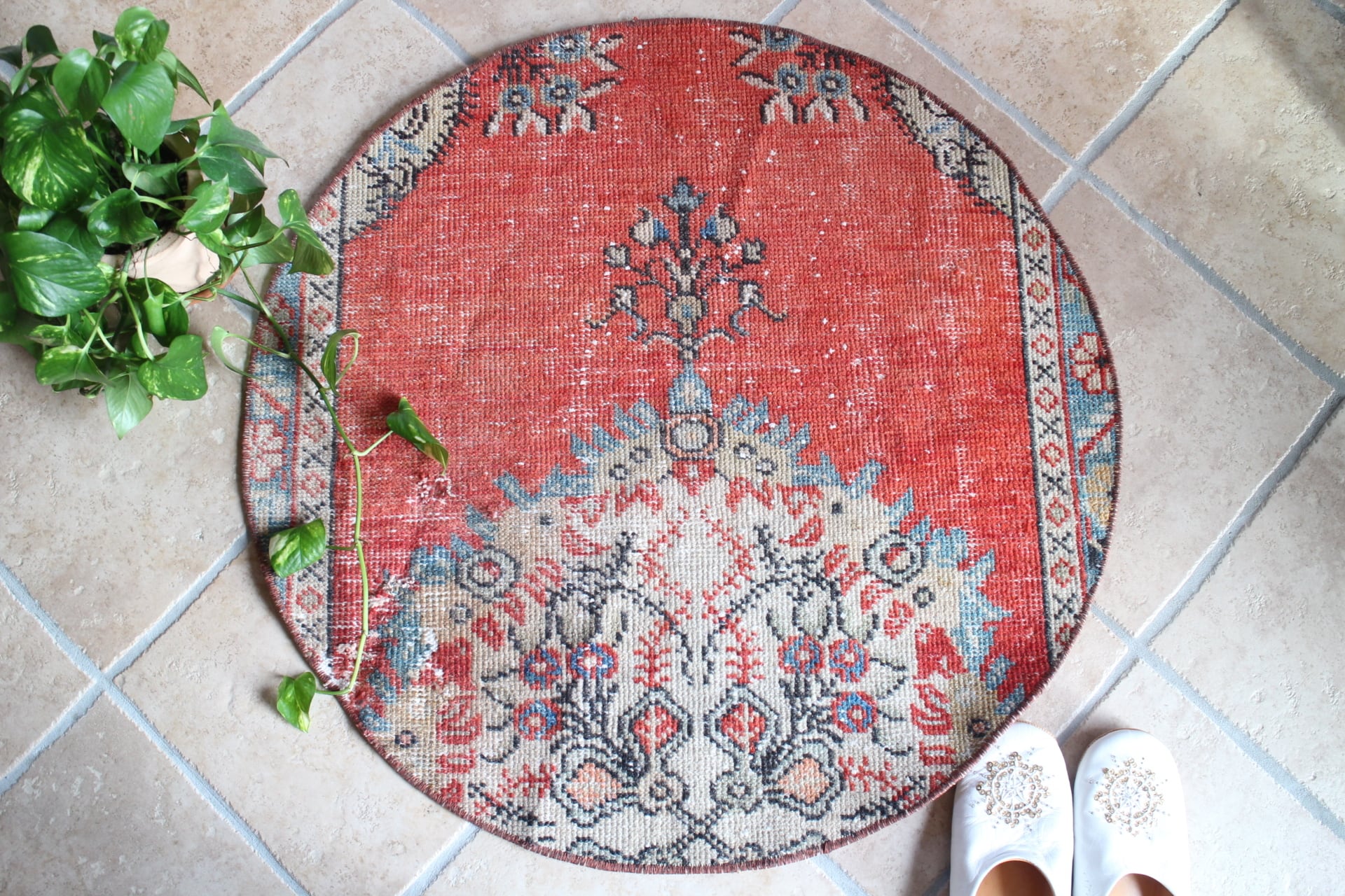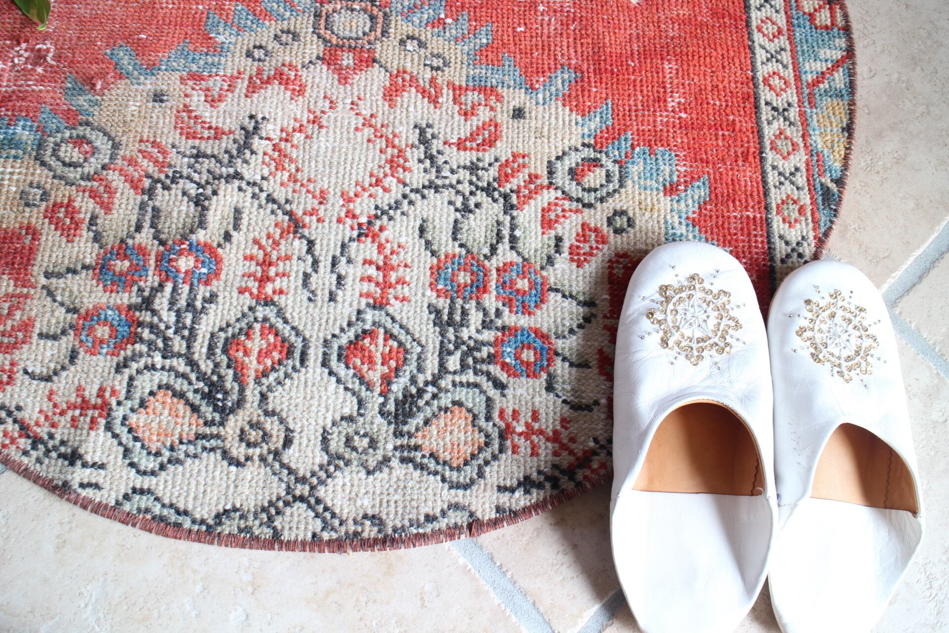 人気の高い赤色ギュネイラグが可愛らしいサークルラグに仕立てられています。朱赤に水色の柄が魅力的です。大きさも適度にありパーソナルチェアの下や別のラグに重ねて使うのもおすすめです。