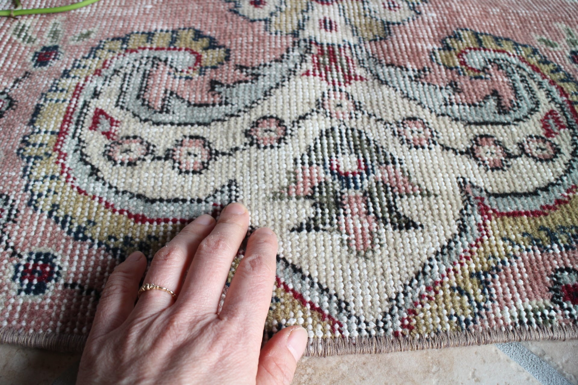 くすみピンクが可愛い半円形のラグ。ピンク色ながら落ち着いた色合いと柄で上品なラグになっています。玄関やベッド脇など毎日目にする場所に素敵なラグをいかがでしょうか。