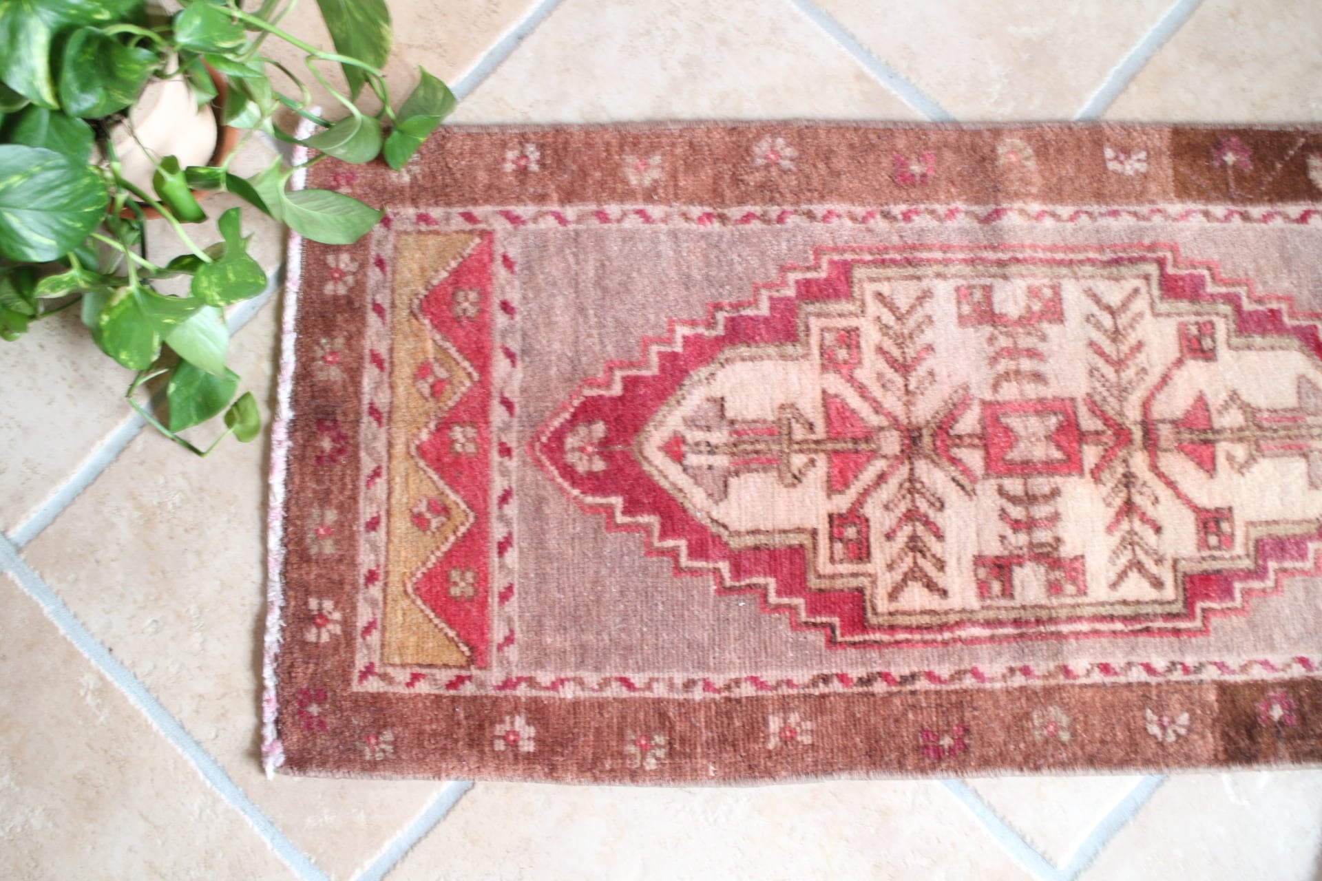 ブラウンをベースに赤が差し色に効いたスモールラグ。大人っぽい可愛らしさがあります。