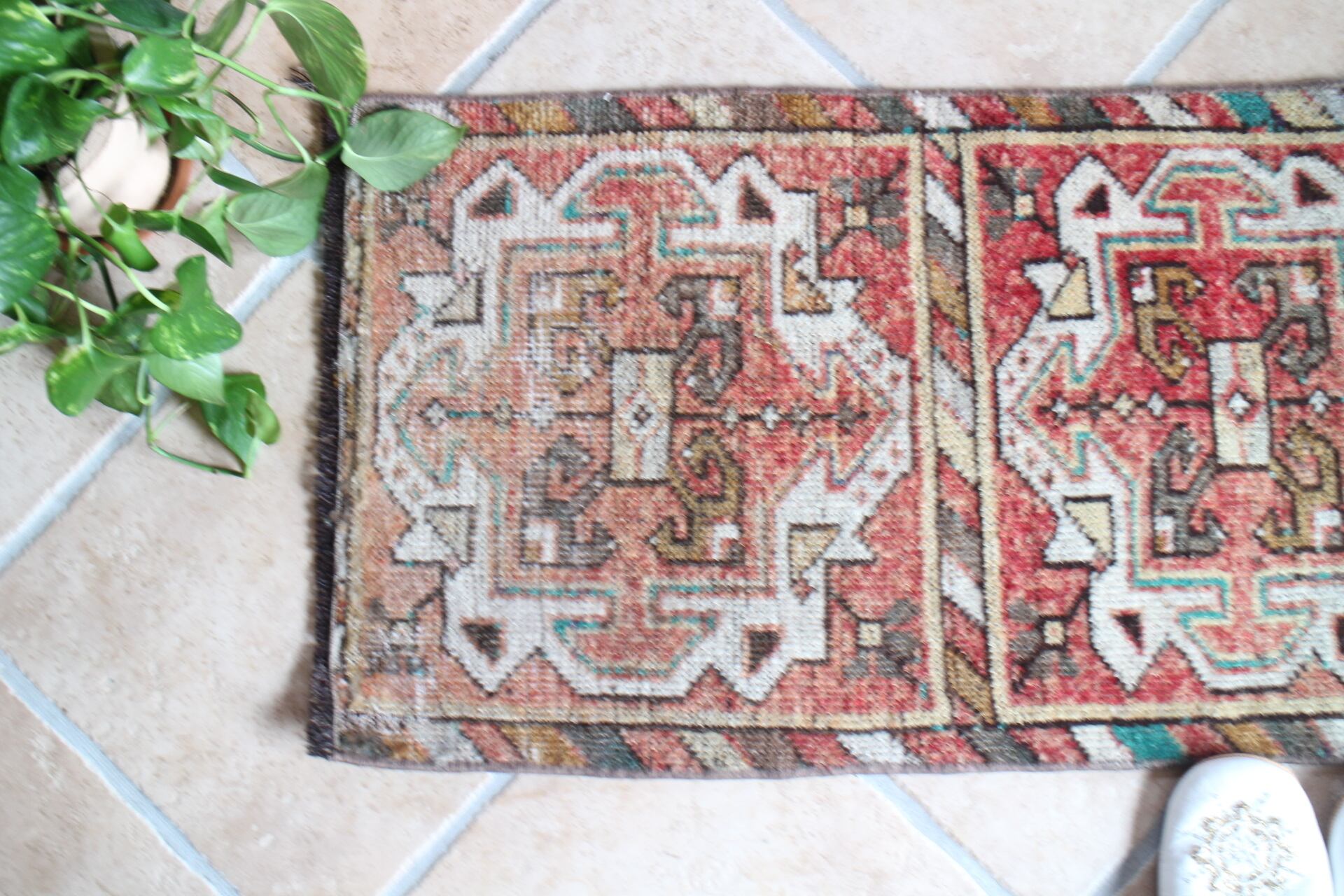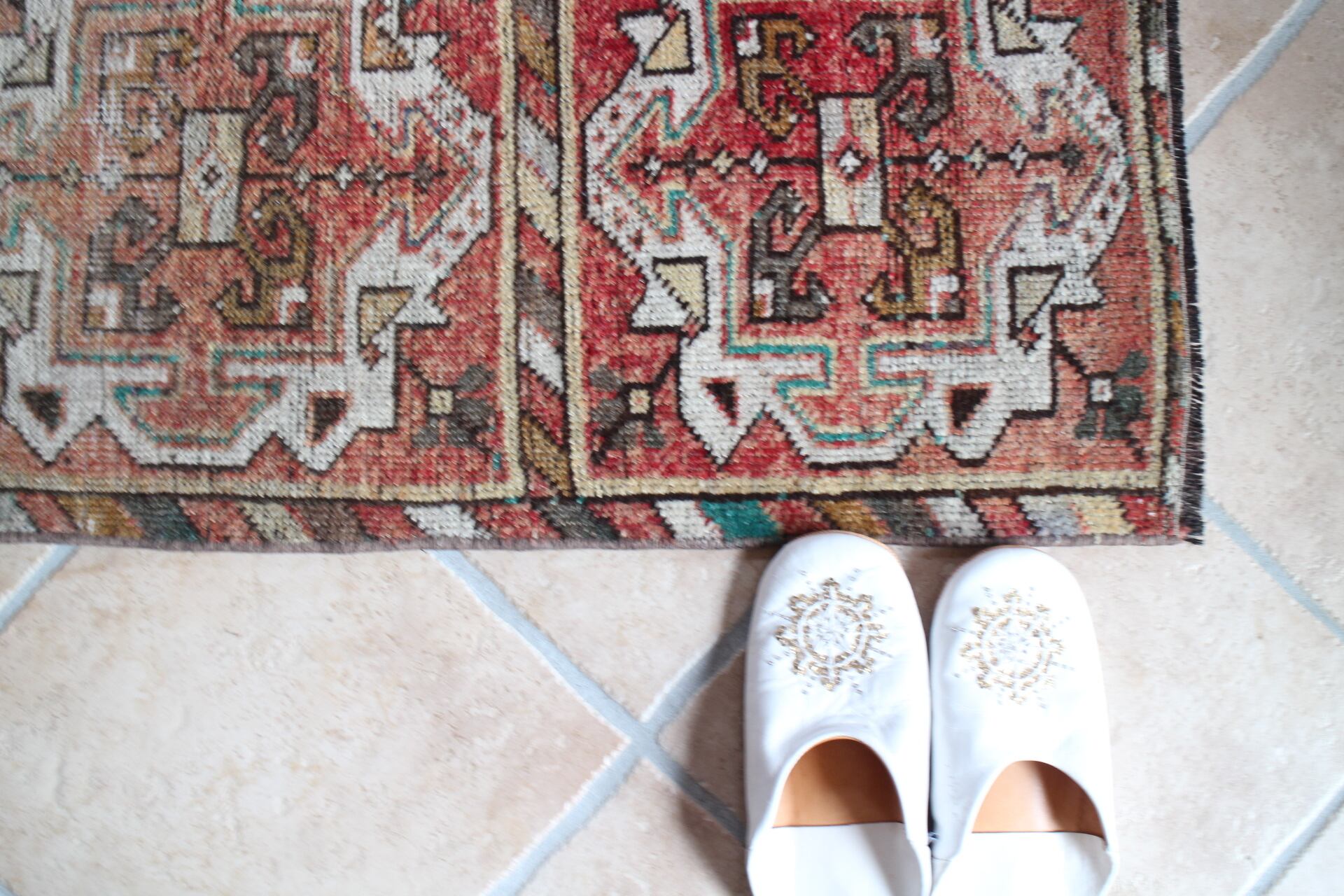 赤・くすみピンク・ブラウンが使われたトライバルラグ。ターコイズブルーが差し色で効いています。