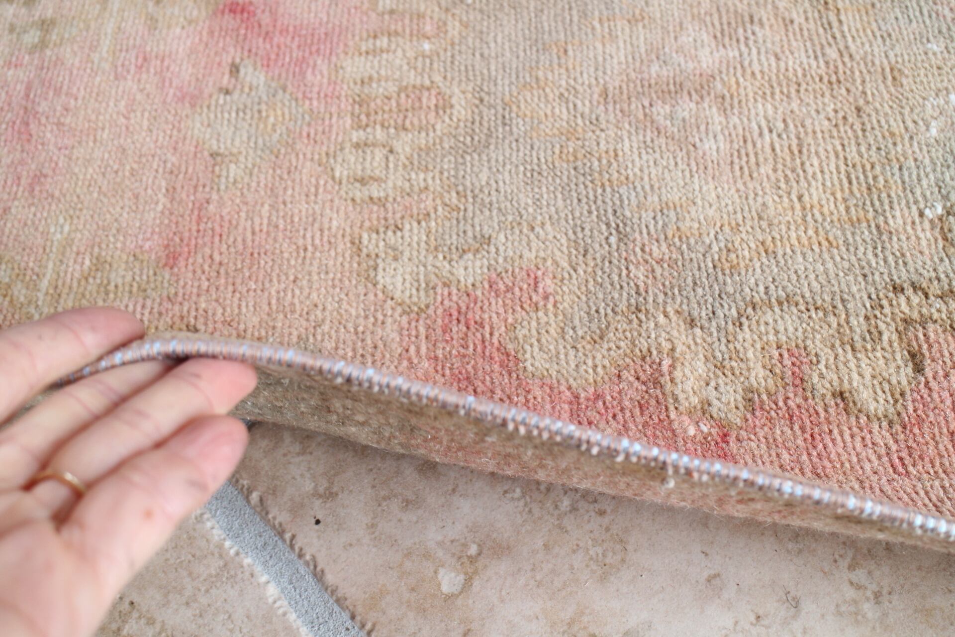 パステルピンクと優しいブラウンが上品なスモールラグ。淡い色合いが水彩画のようで素敵です。