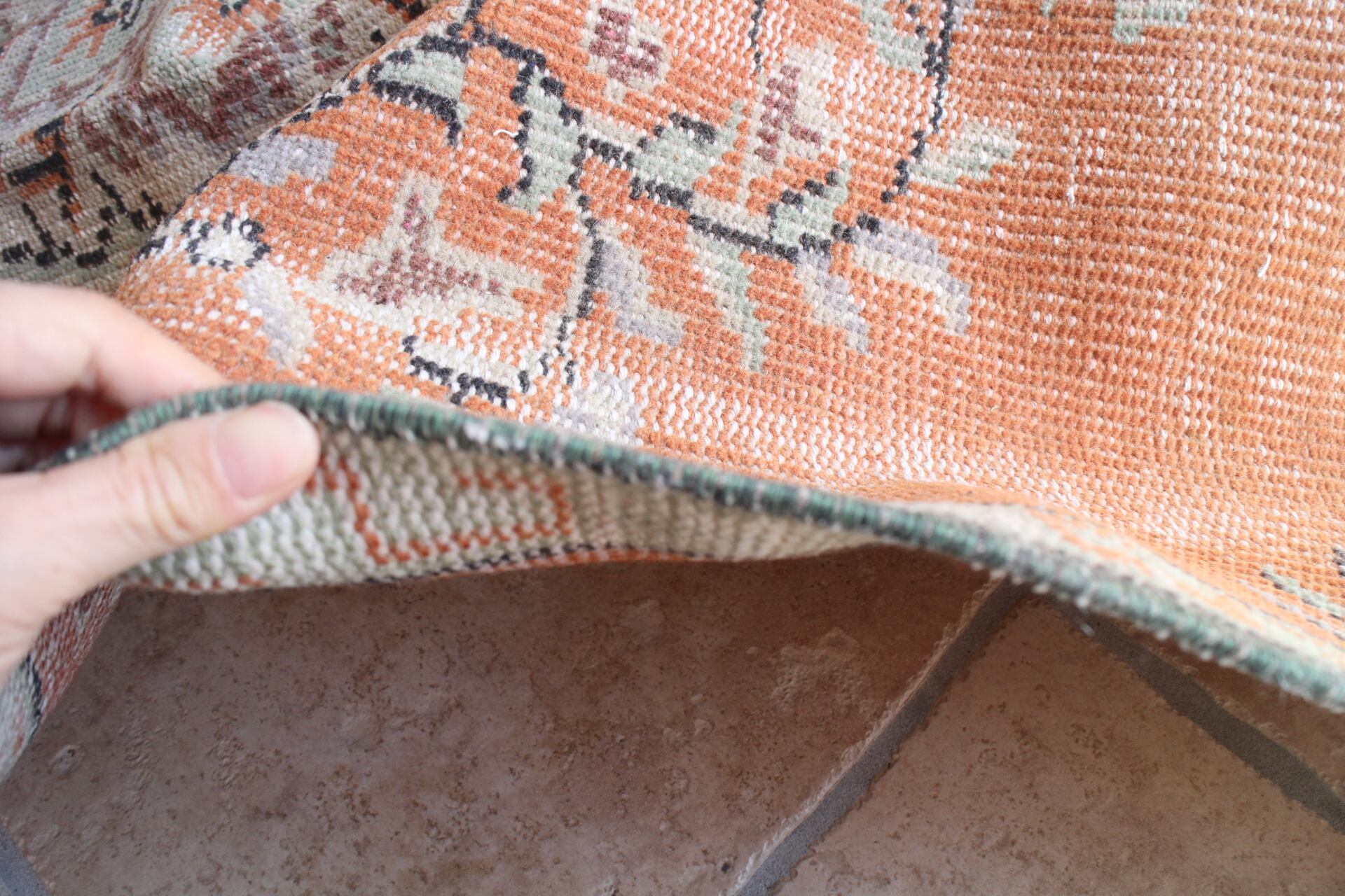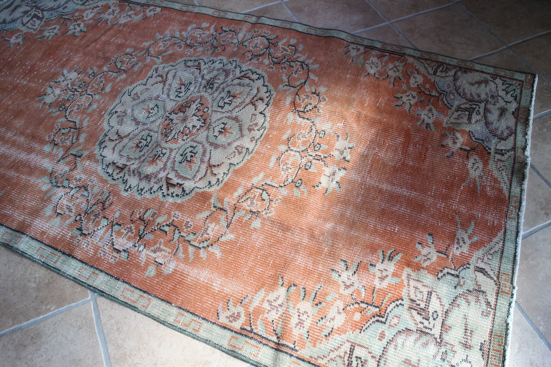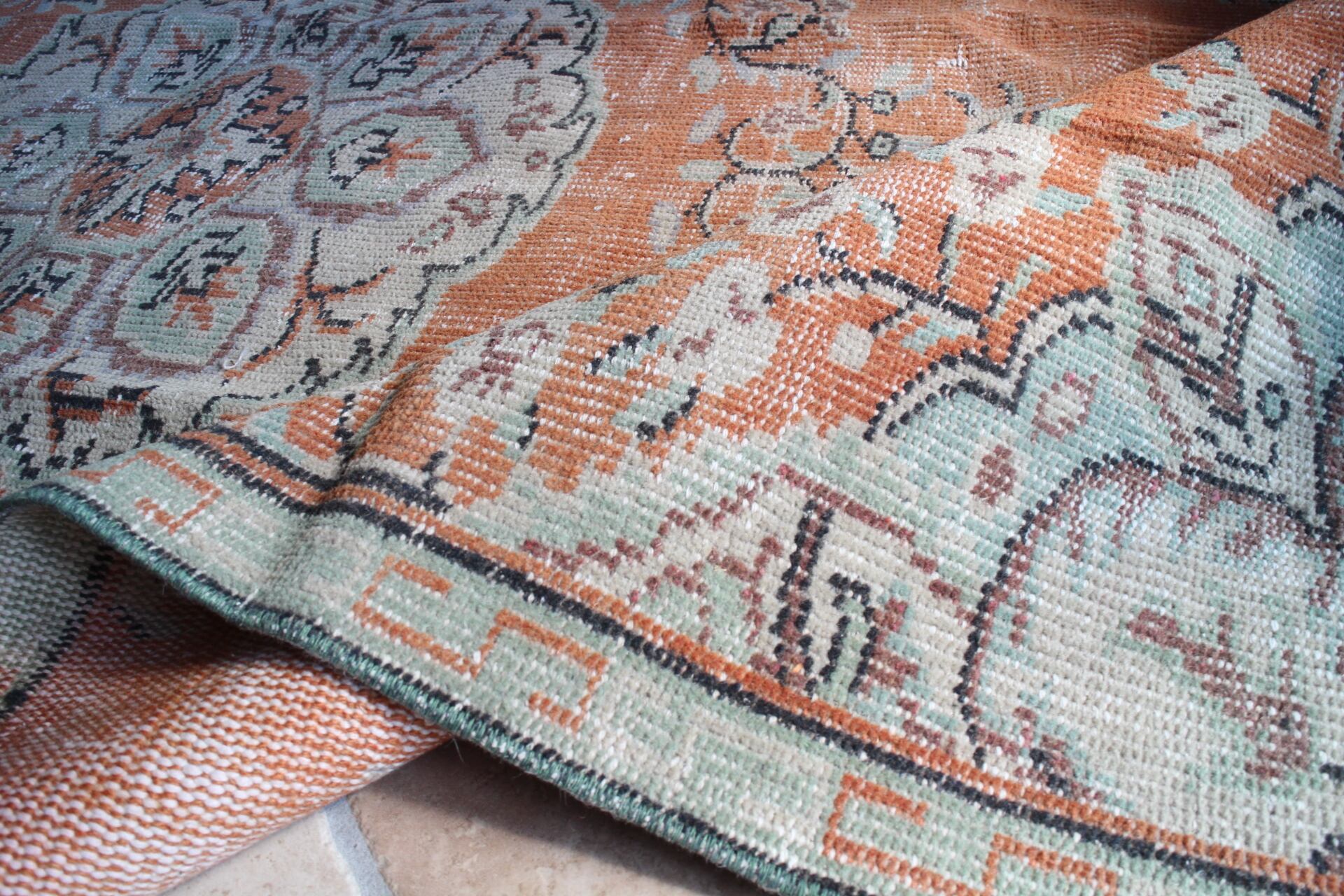 オレンジベースの大判ラグ。柄はくすんだ水色や淡いグリーンで入り、ヴィンテージらしい格好良さのある男性的なメダリオンです。