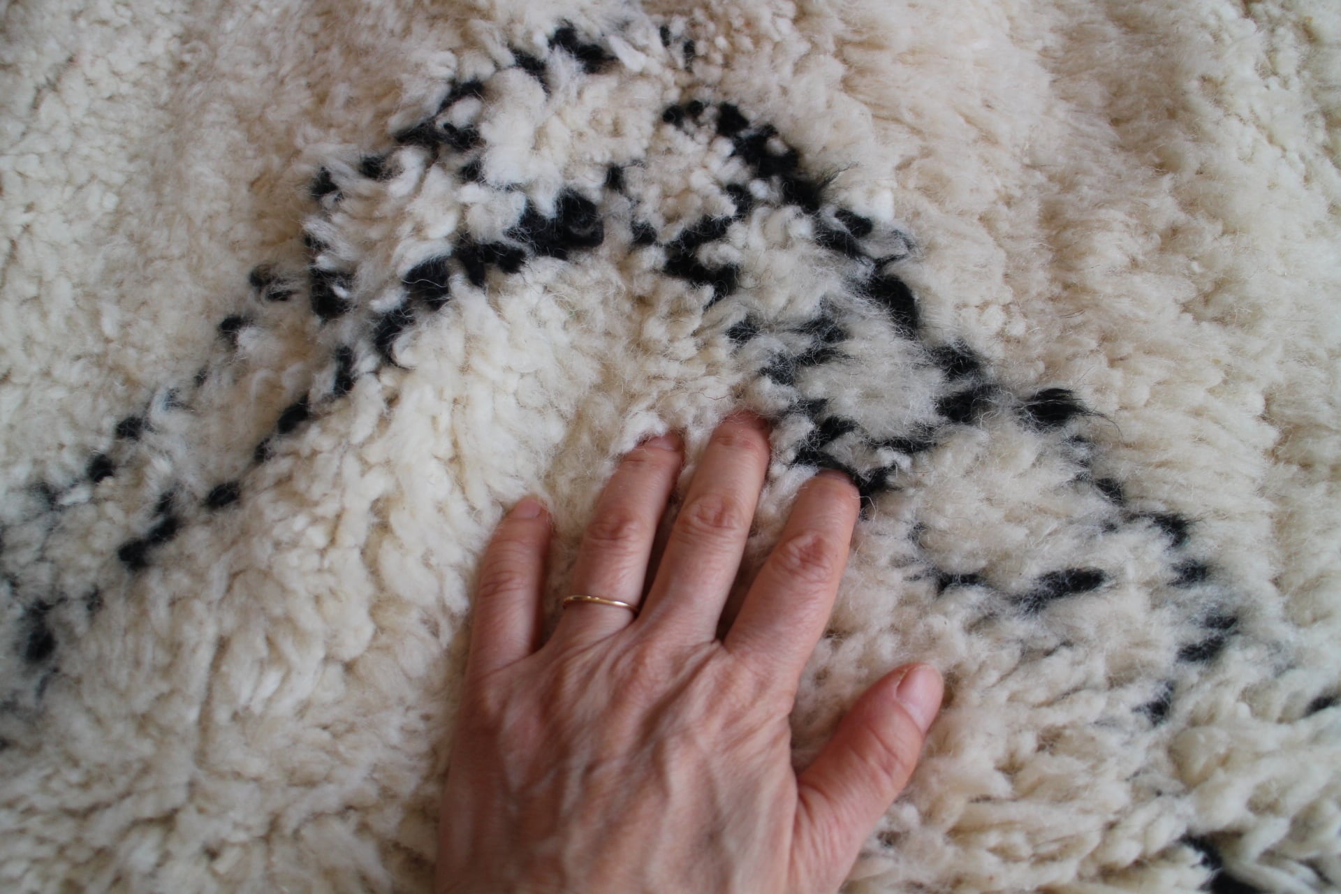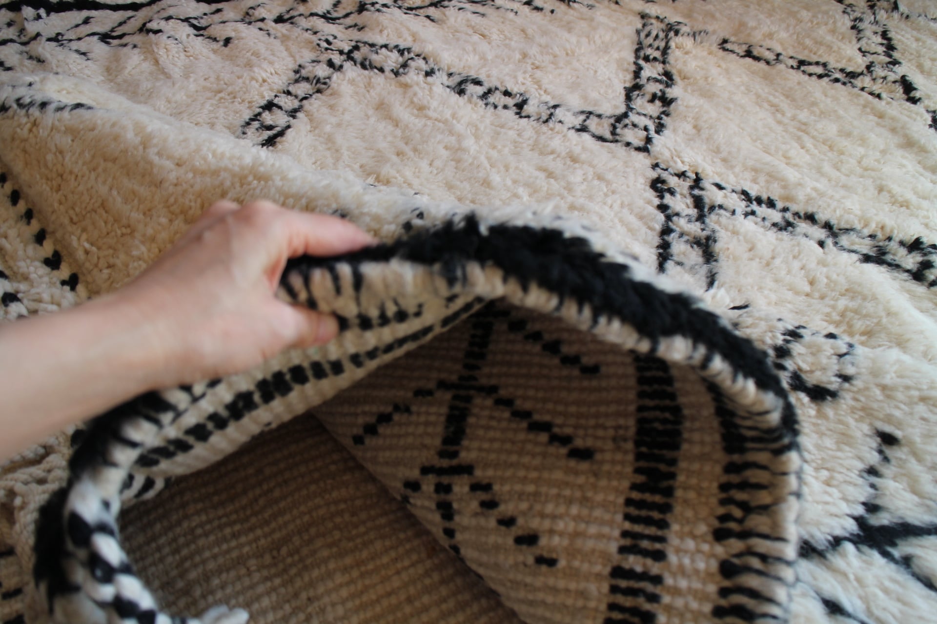 ただし、モロッコラグの特徴として羊毛に髪の毛のような黒い繊維が混じったり、固い草の繊維のようなものや、カラフルな小さなビニールが混じることがあります。