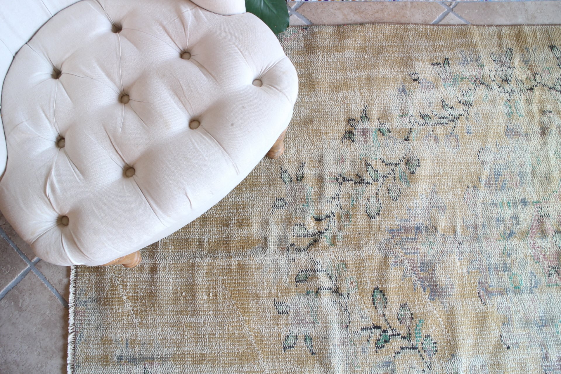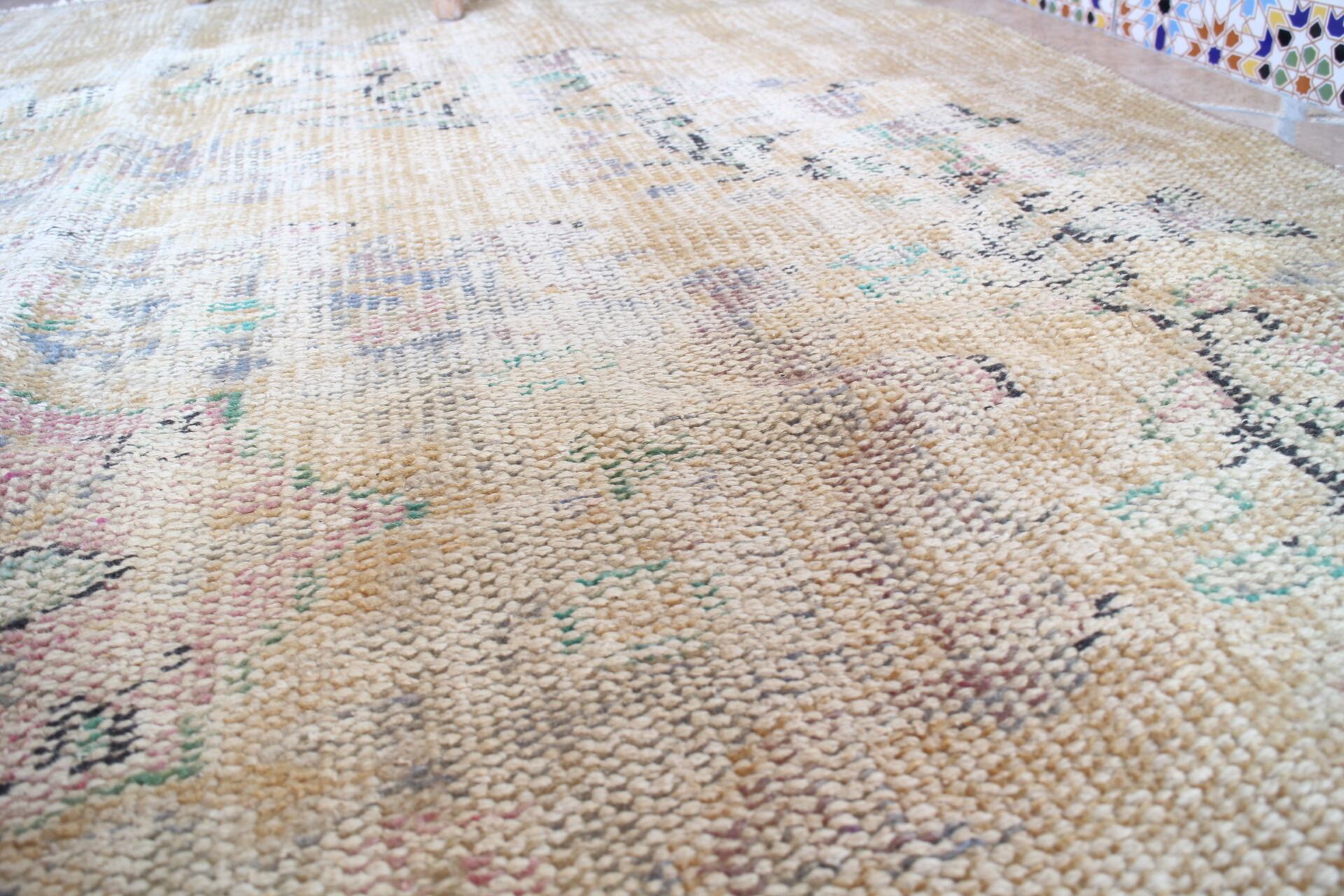 下糸のコットンが見えるまでさっぱりと羊毛が刈られたシャビーな印象のラグ。落ち着いたマスタードイエローが珍しい色味です。ピンクやターコイズブルーがマスタードイエローの中にちらちらと覗きかわいさもあります。ヴィンテージラグにしか出せない味わいを感じられるお勧めのお品です。大判で広い面積を覆ってくれます。