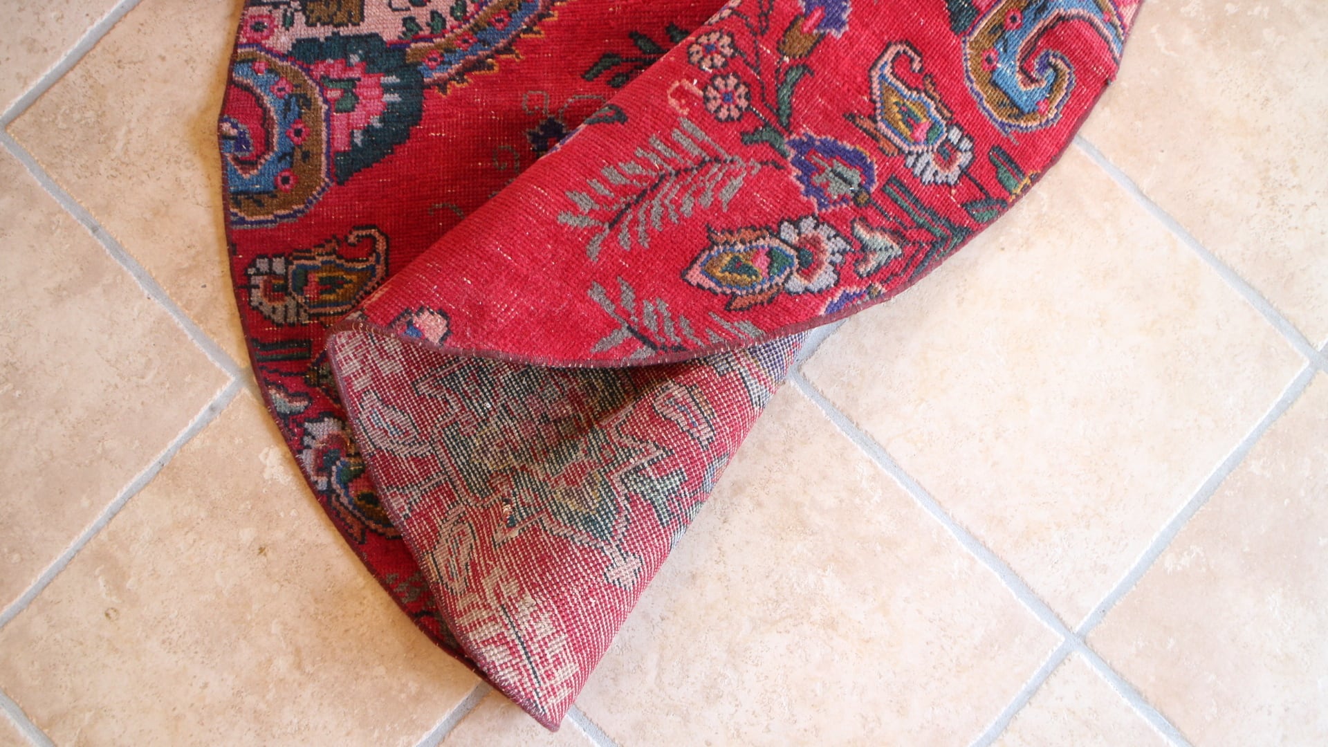 はっとするような深紅が美しい大きなサークルラグ。お部屋の主役になってくれる迫力があります。オリエンタルな大柄で、切り取り方も素敵で鮮やかな青がアクセントになっています。