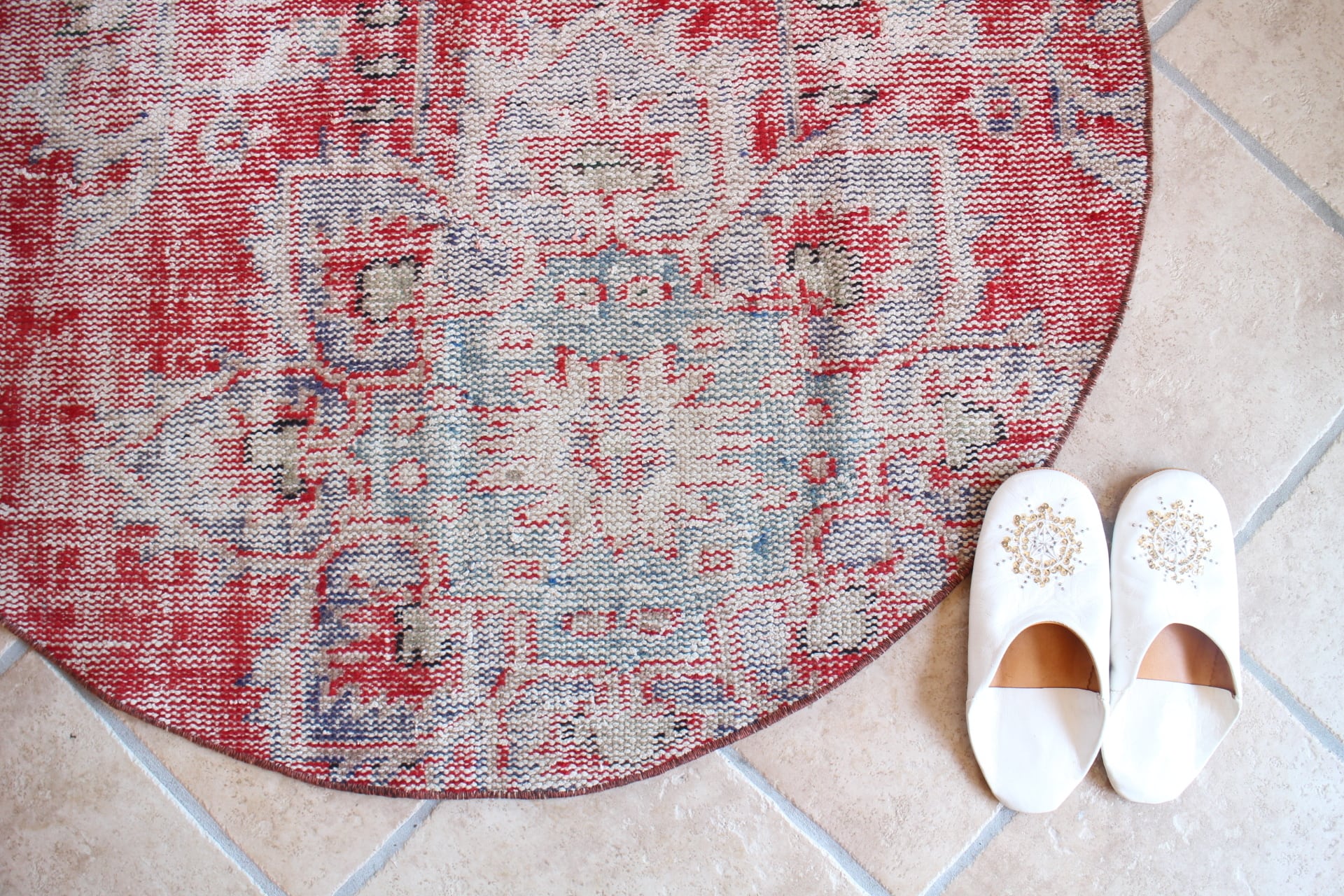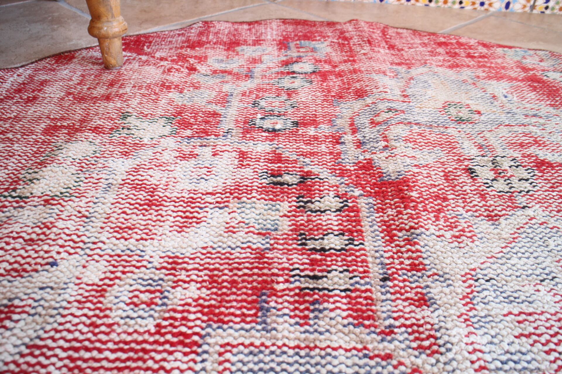 かすれた色合いがヴィンテージならではの雰囲気を醸し出す素敵なラグ。レッドベースですが下糸の白いコットンがたくさん見えシャビーな印象に。大胆なメダリオン柄を切り取ってあり、柄いきも素敵です。