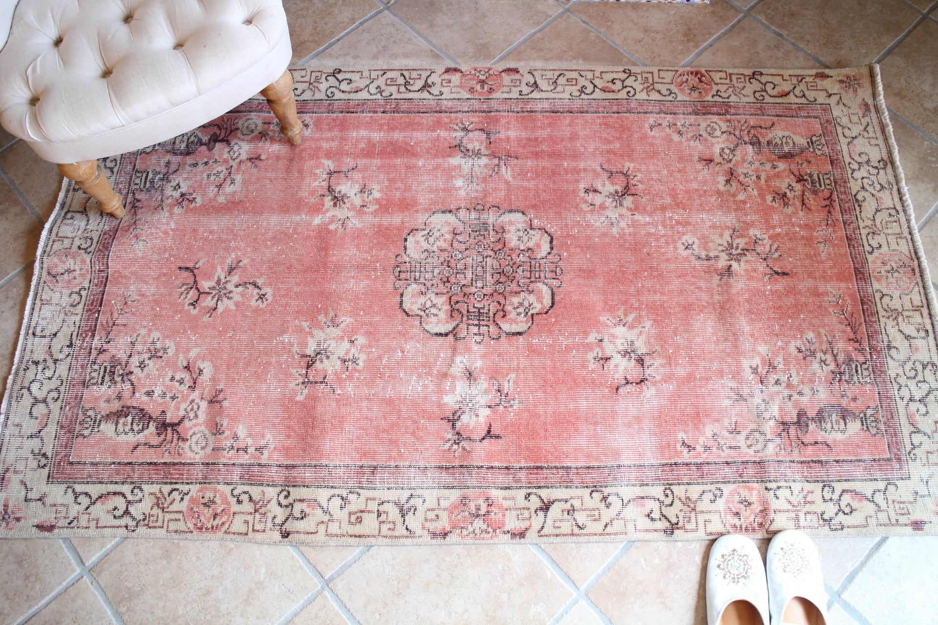 柔らかなサーモンピンクをベースにしたシノワズリラグ。サーモンピンクの落ち着いた可愛らしさをシノワズリ柄の大人っぽさが引き立てます。