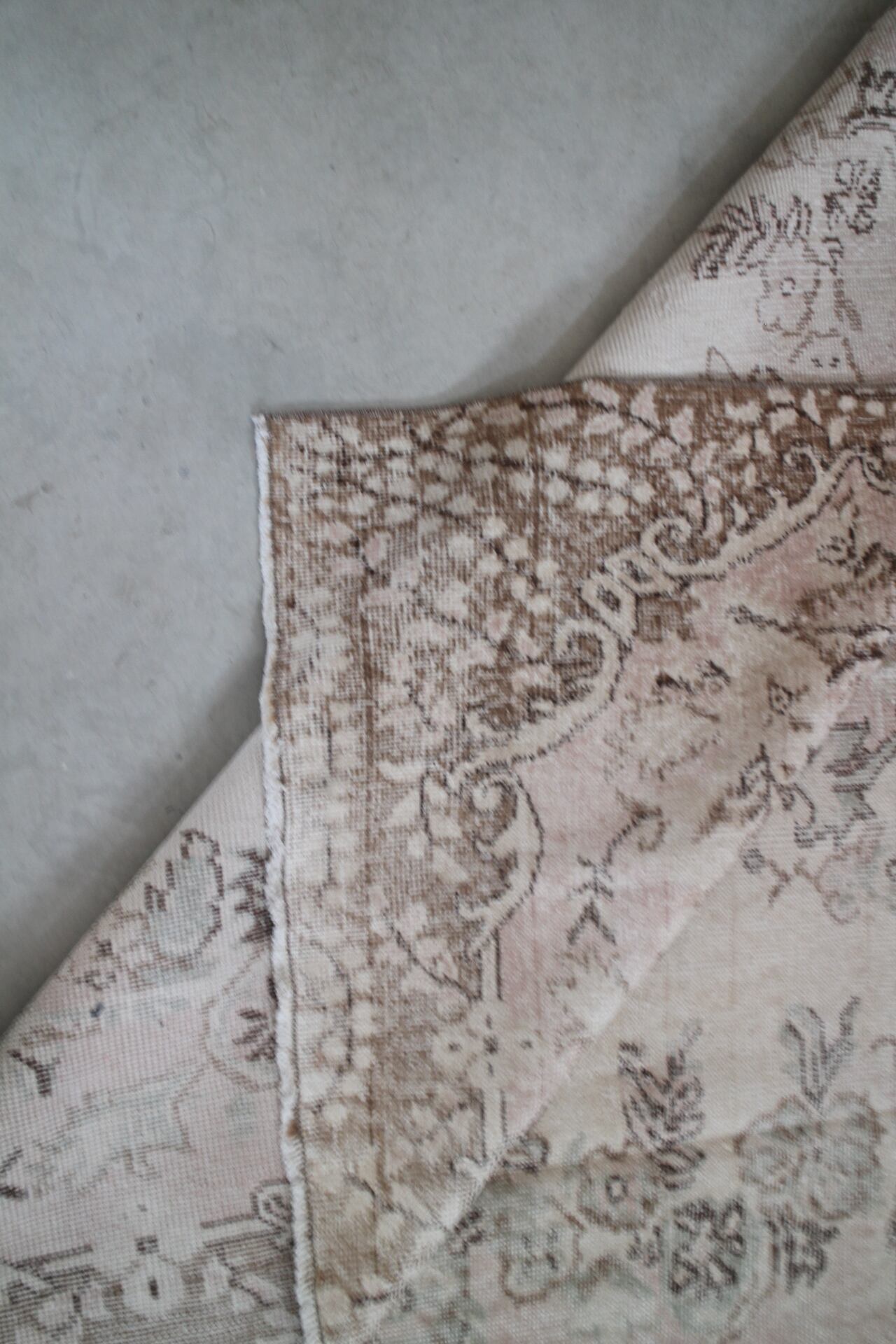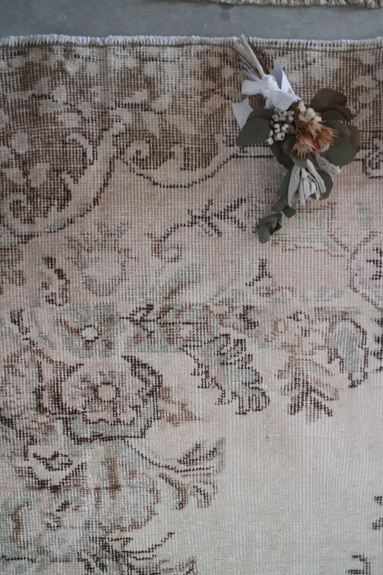 定番ながらも、色味は一枚いちまいラグによって変わってくるのですが、こちらはベースが淡いブラウンと少しくすんだベビーピンクで優しくかわいい印象。お部屋を明るくしてくれるような柔らかい色使いです。メダリオンには繊細なフラワー柄が使われています。少しの色味でだいぶ印象が変わる点もこのメダリオンラグのおもしろい所です。