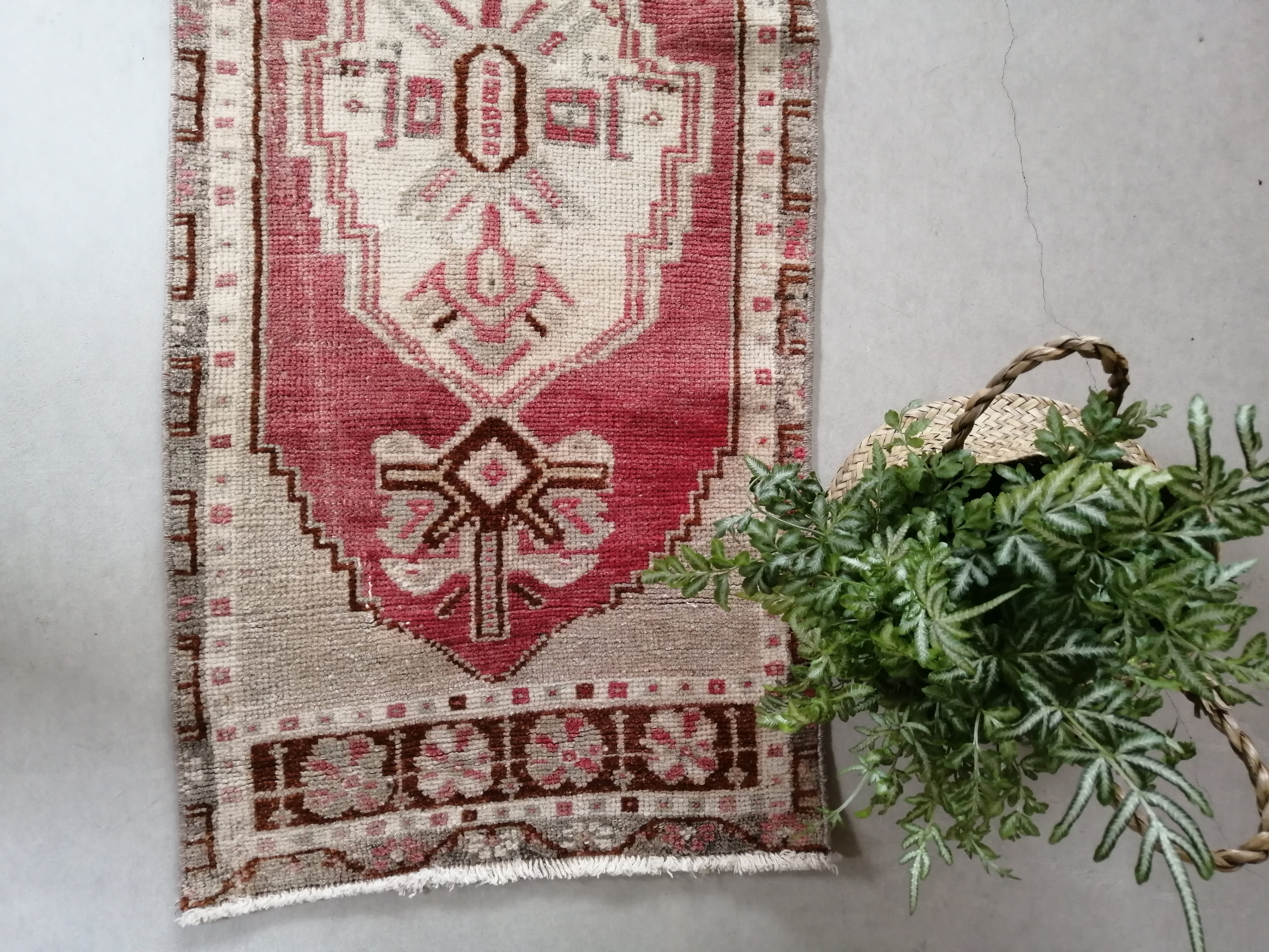 温かみのあるローズピンクに落ち着いたベージュが素敵なスモールラグ。上品な印象です。