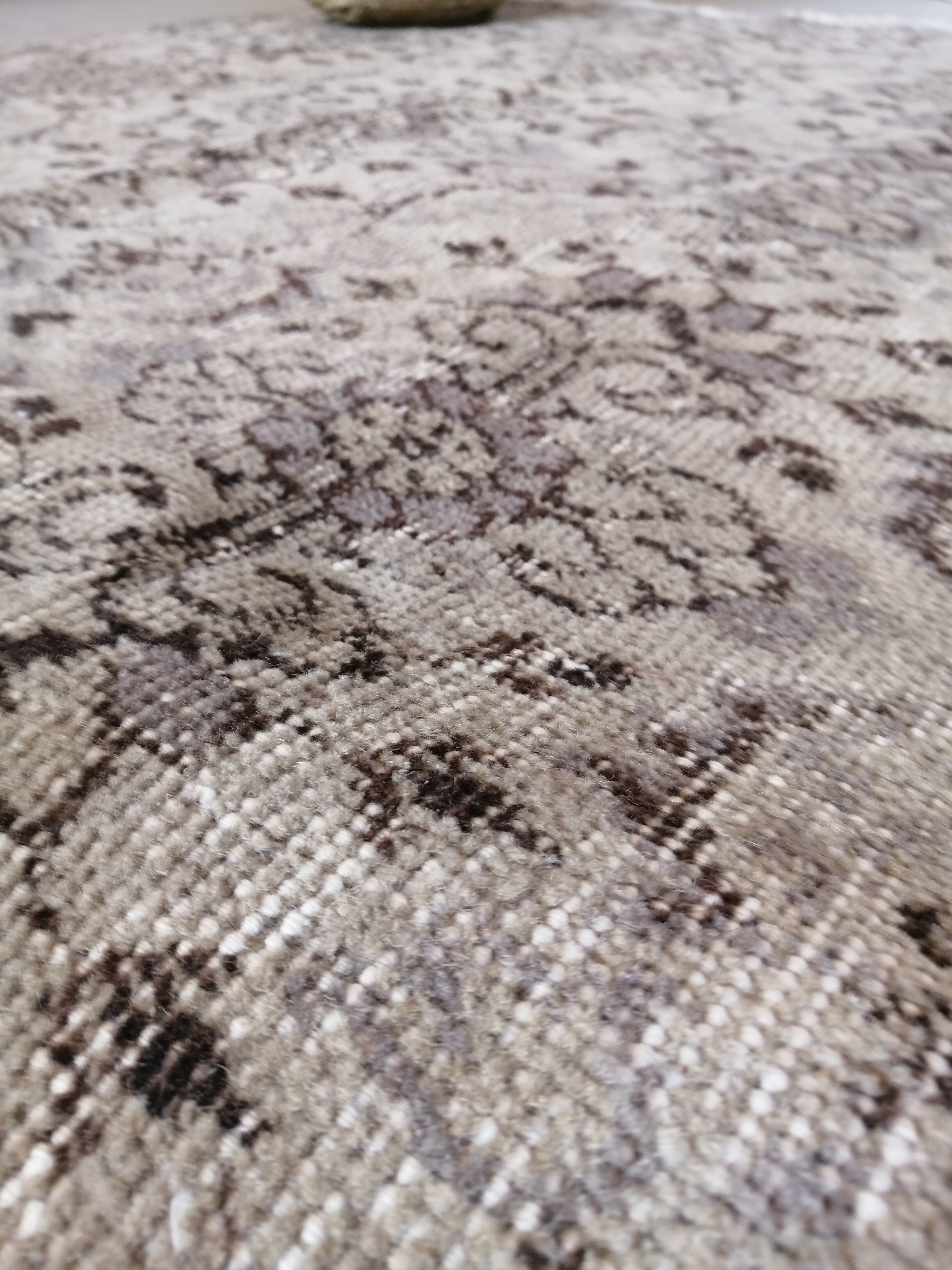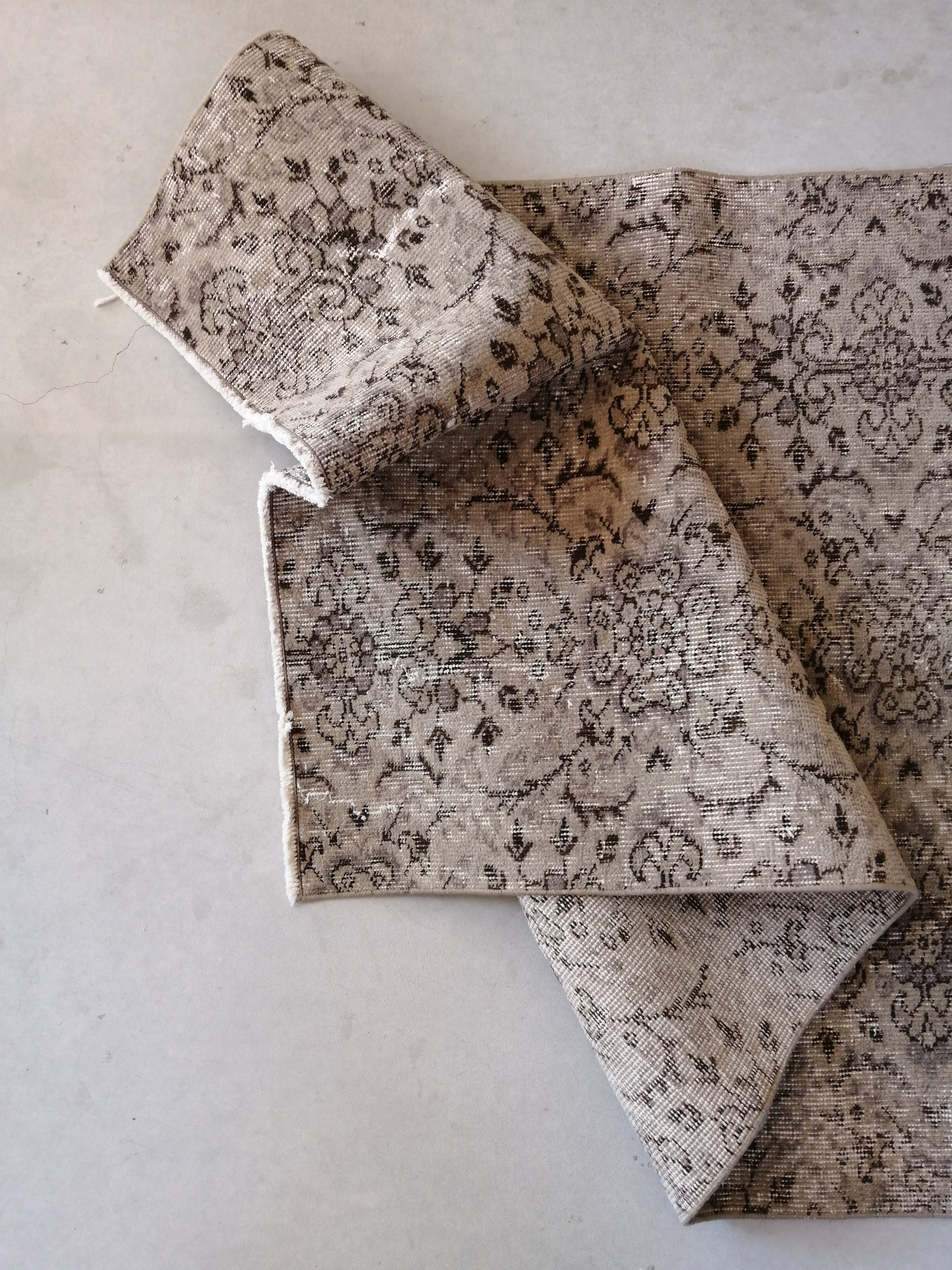 グレージュ寄りのグレーにオーバーダイされたシックな総柄のラグ。
