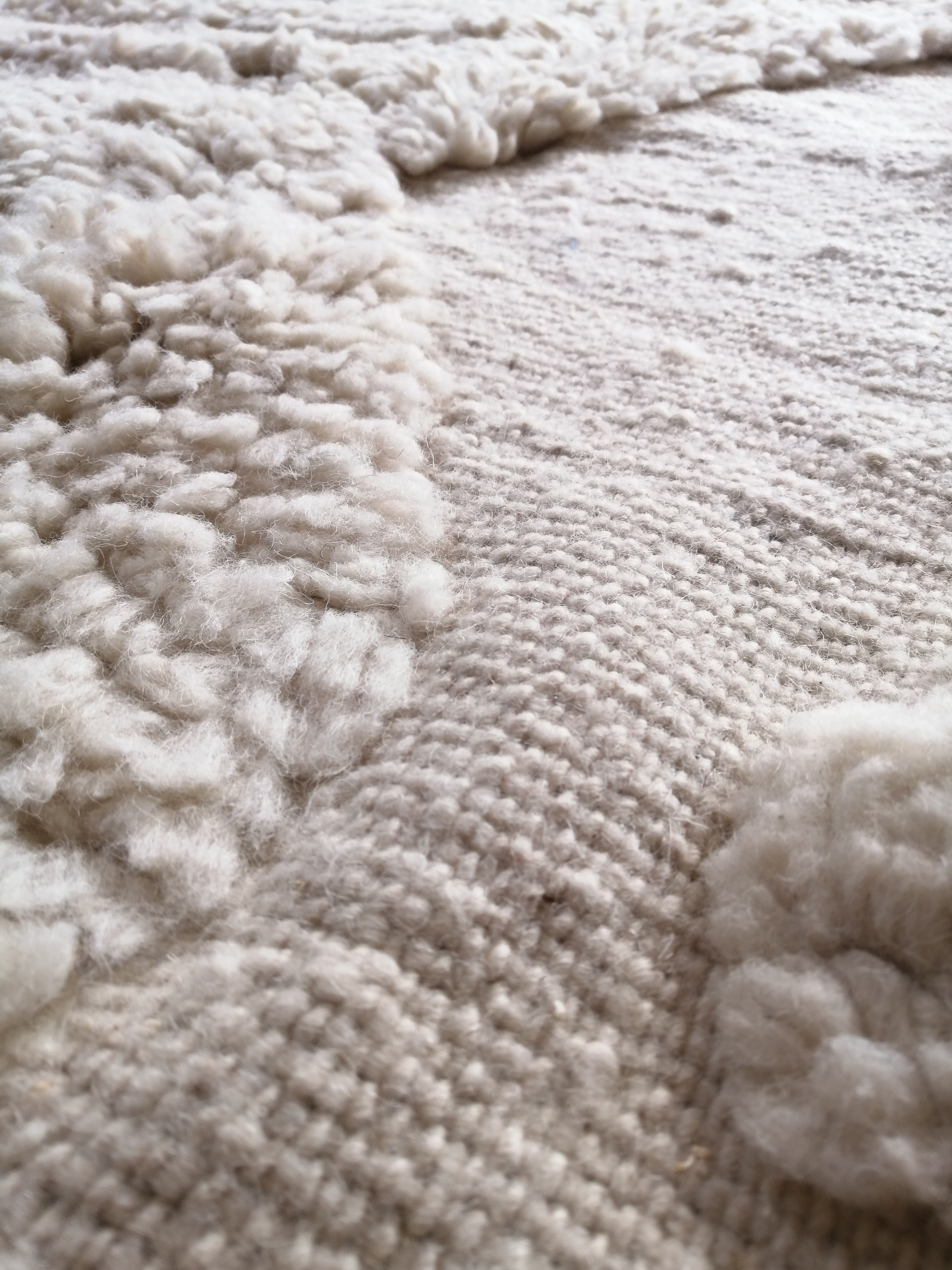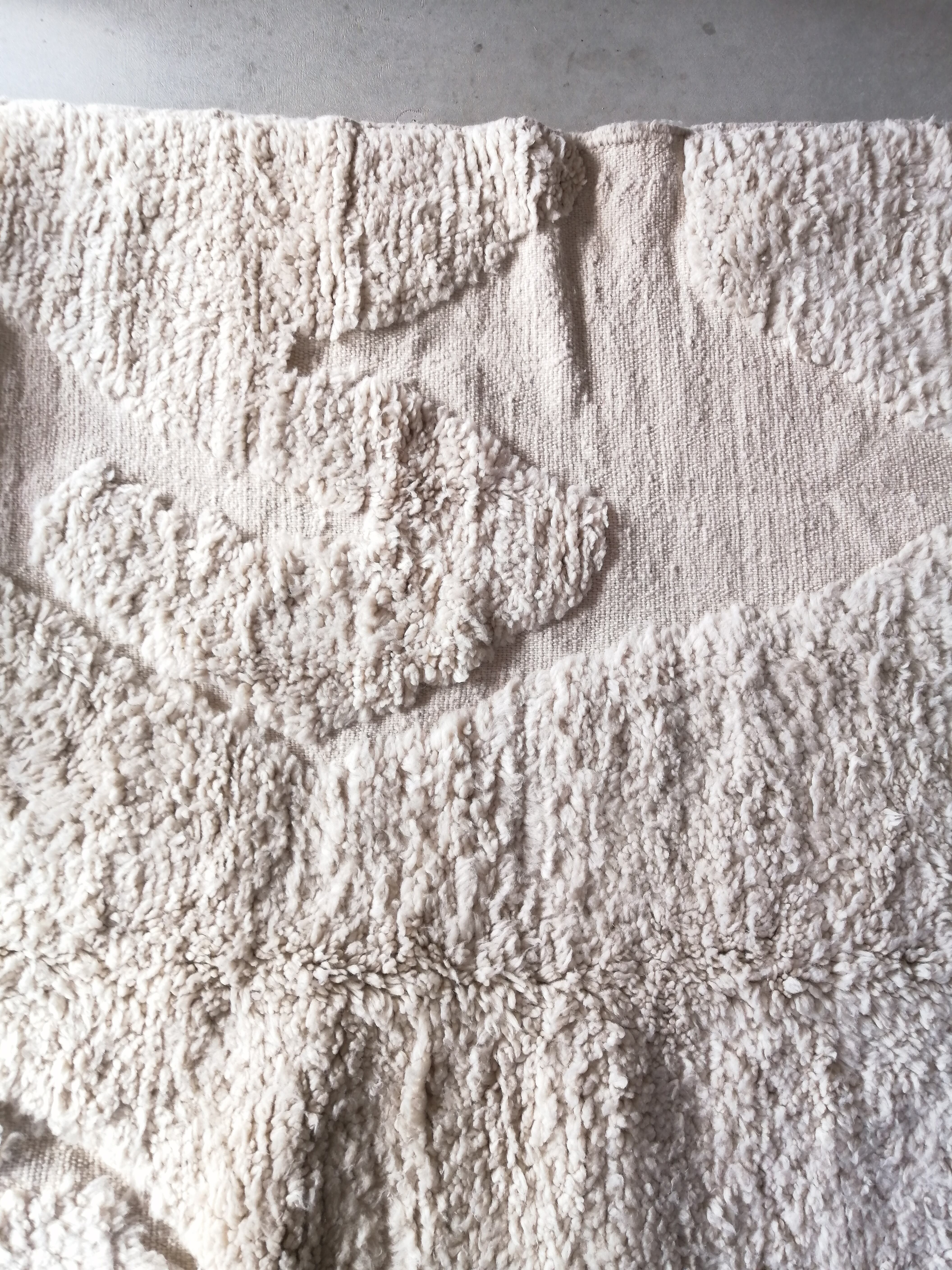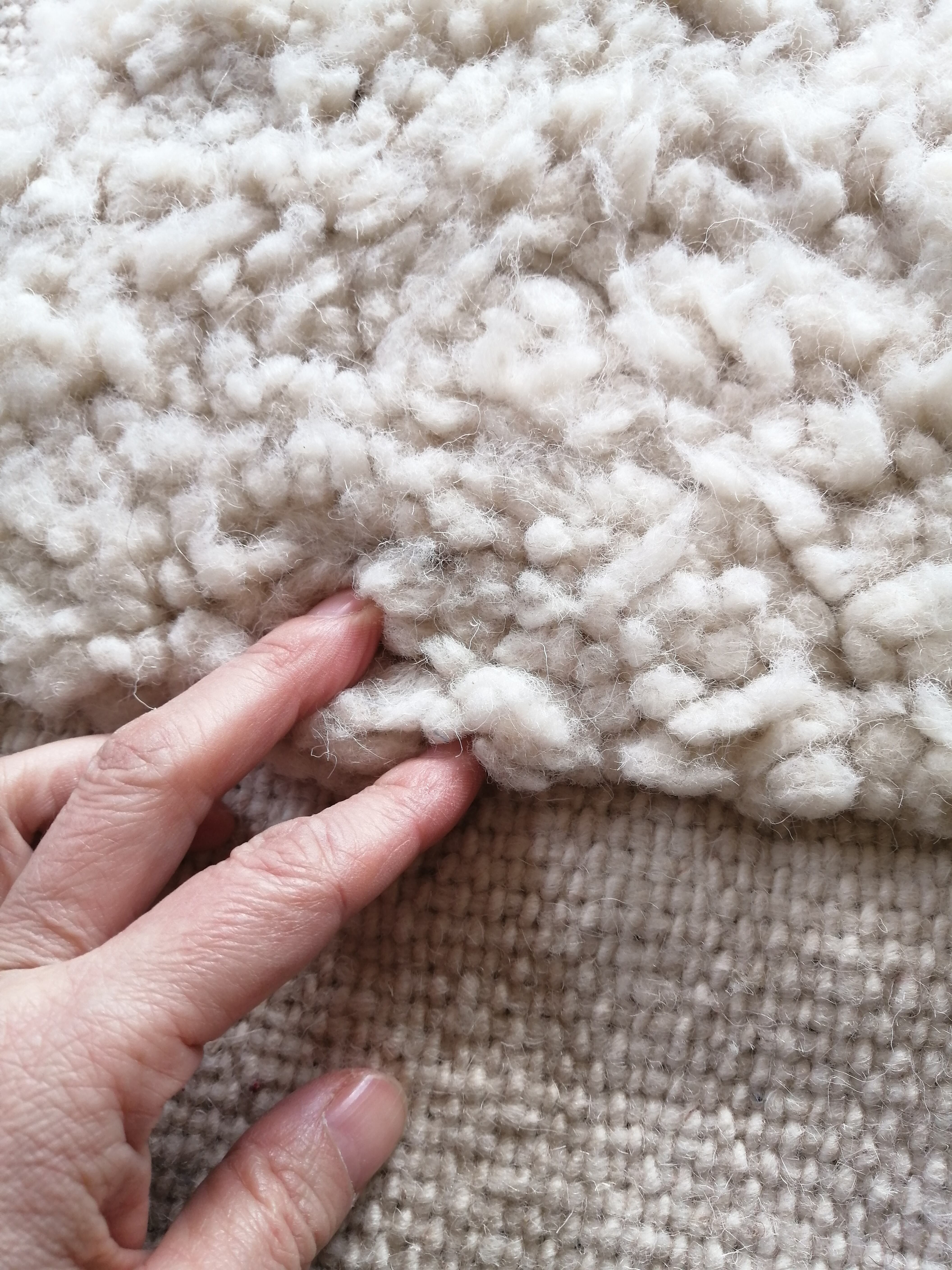 厚みのしっかりしたモフモフのベニワレン。贅沢な踏み心地です。毛足は2cmほど、厚みは2.5cmほどあります。一点もののラグです。