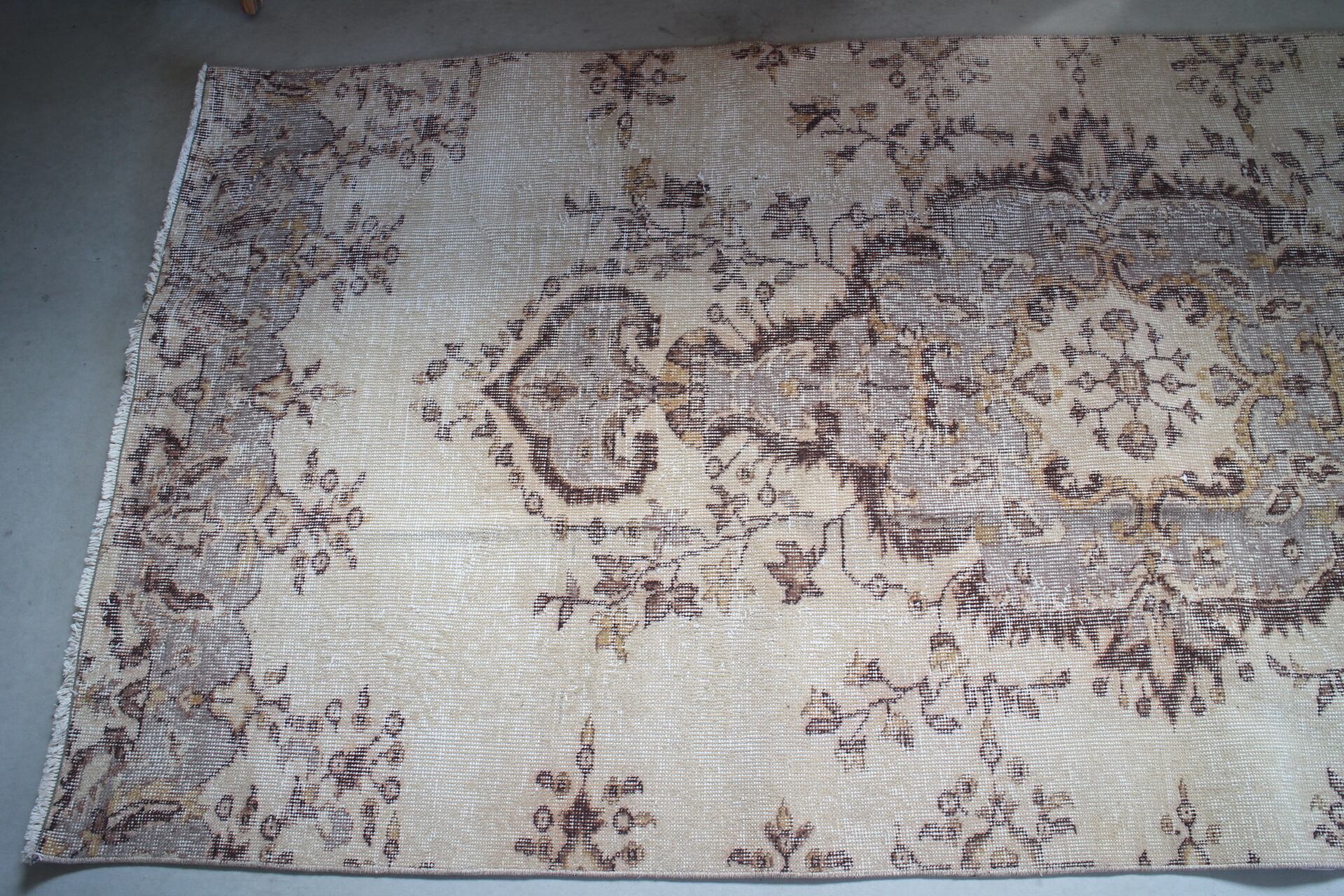 ベージュをベースにブラウンやグレー、マスタードイエロ-の模様が入るメダリオンラグ。ニュートラルなカラーはインテリアに合わせやすく、上品な印象です。